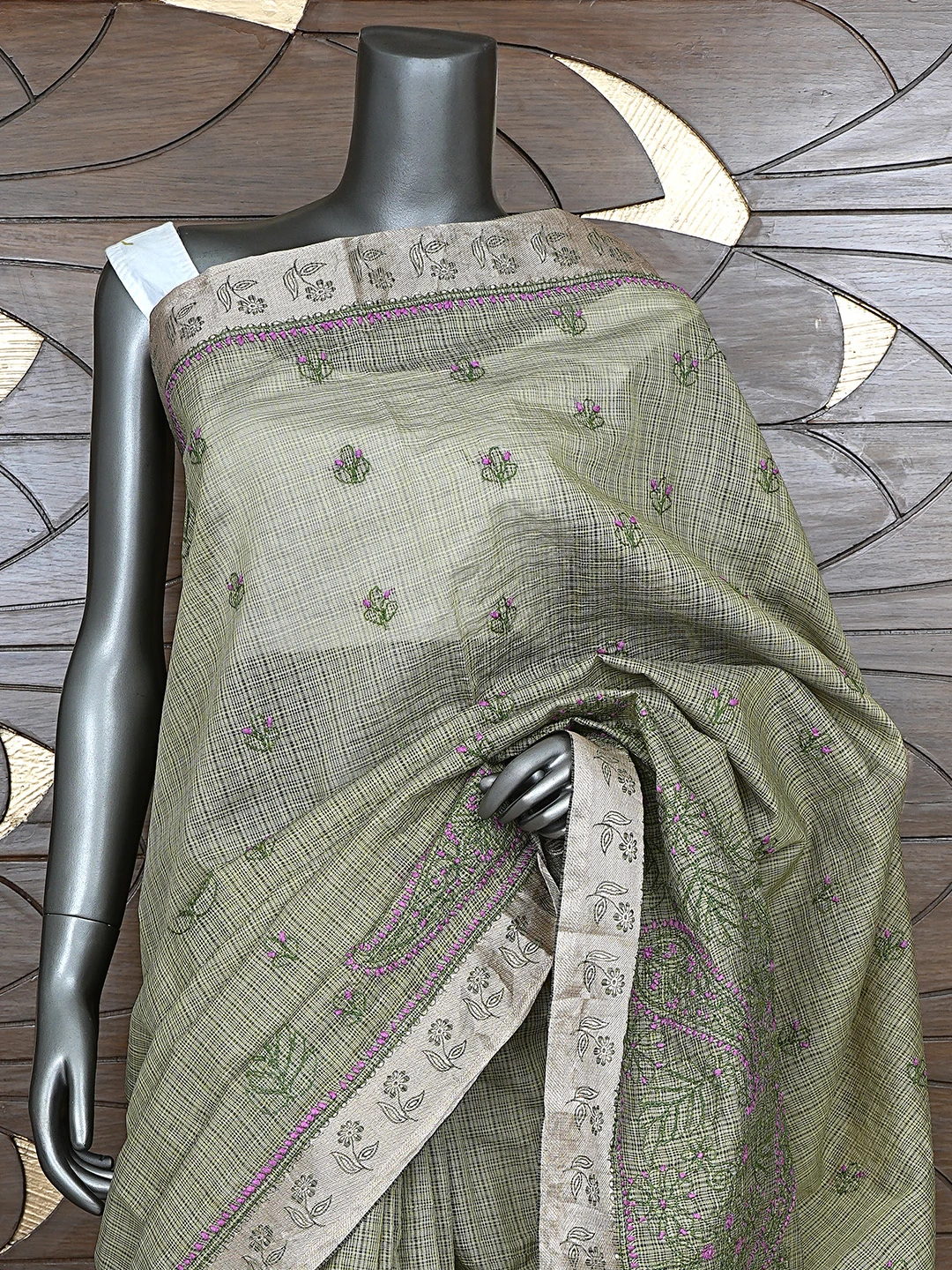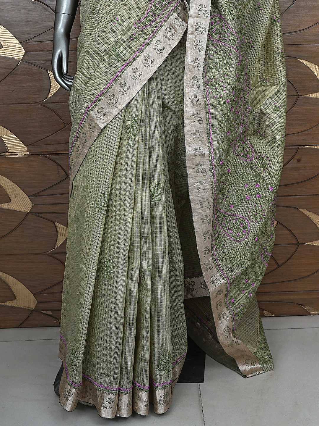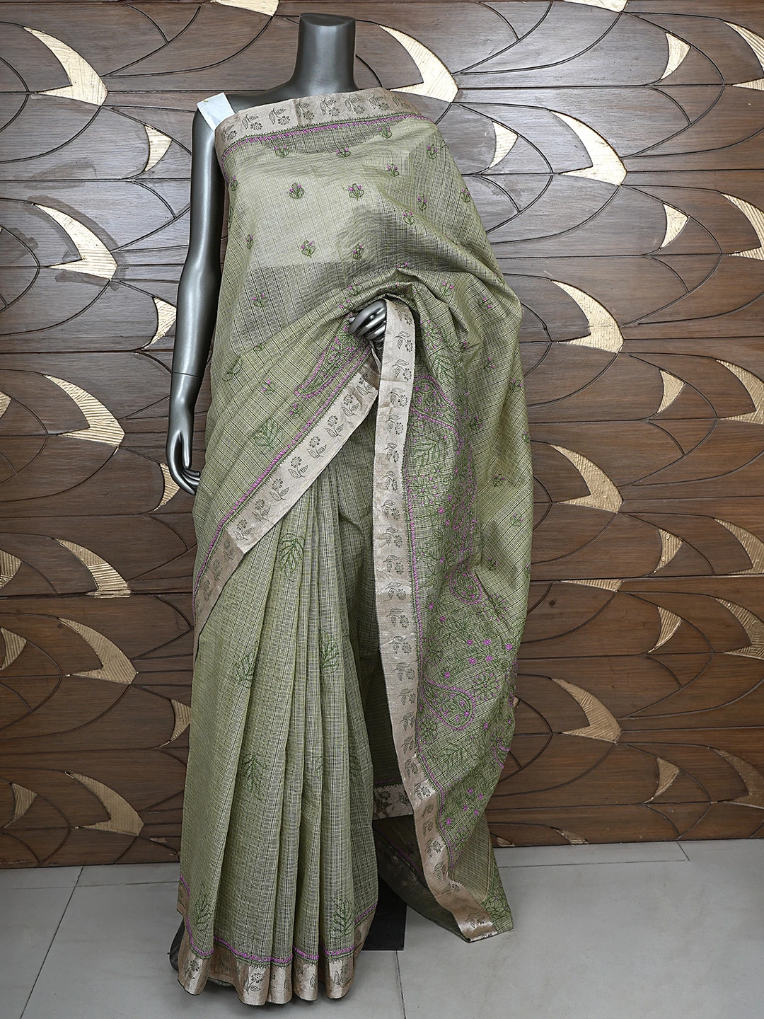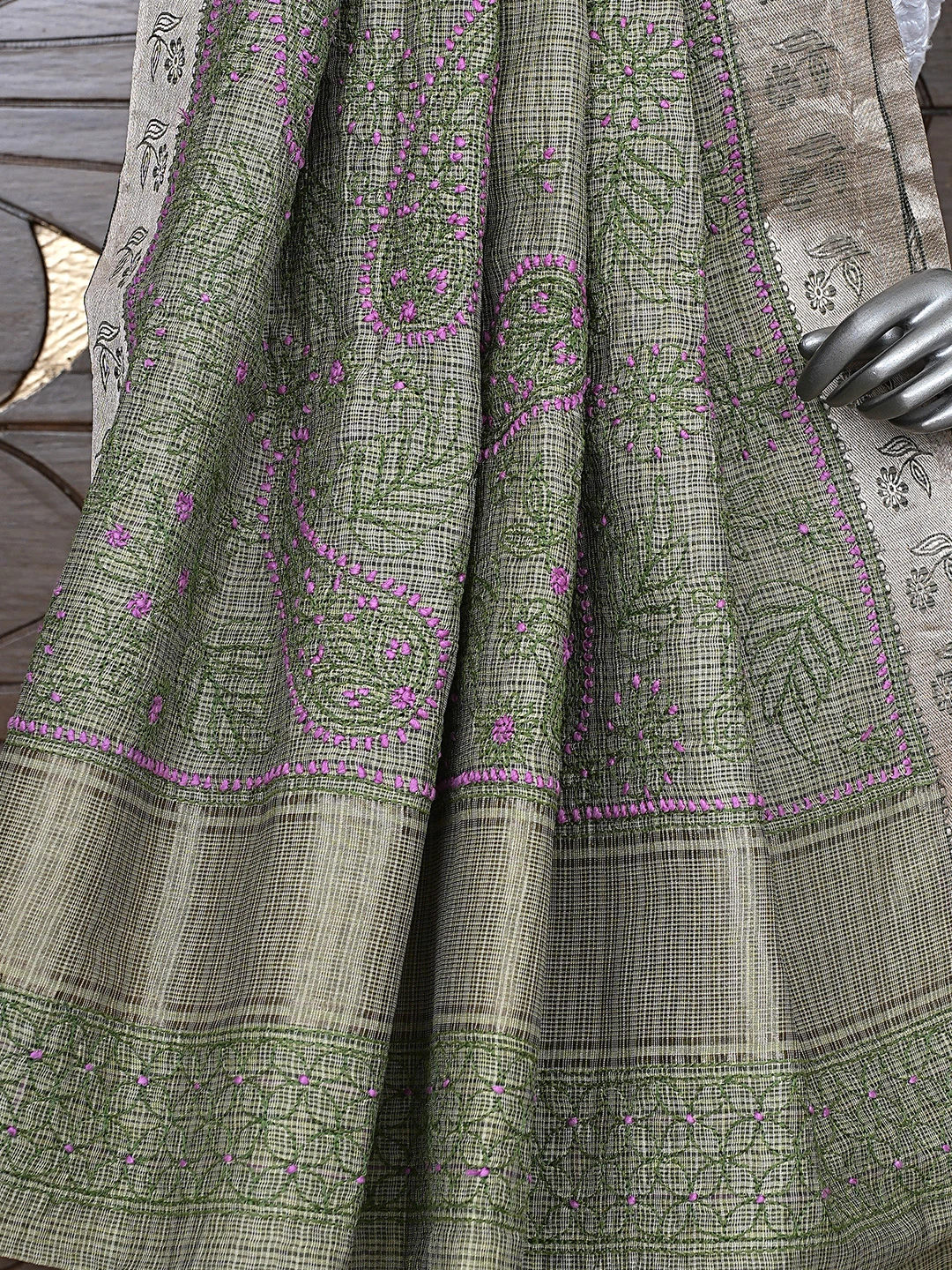 Ada Hand Embroidered Army Green Chanderi Lucknowi Chikankari Saree With Blouse 01A884515