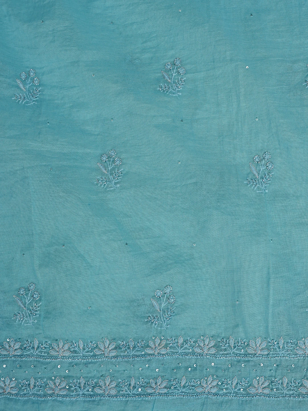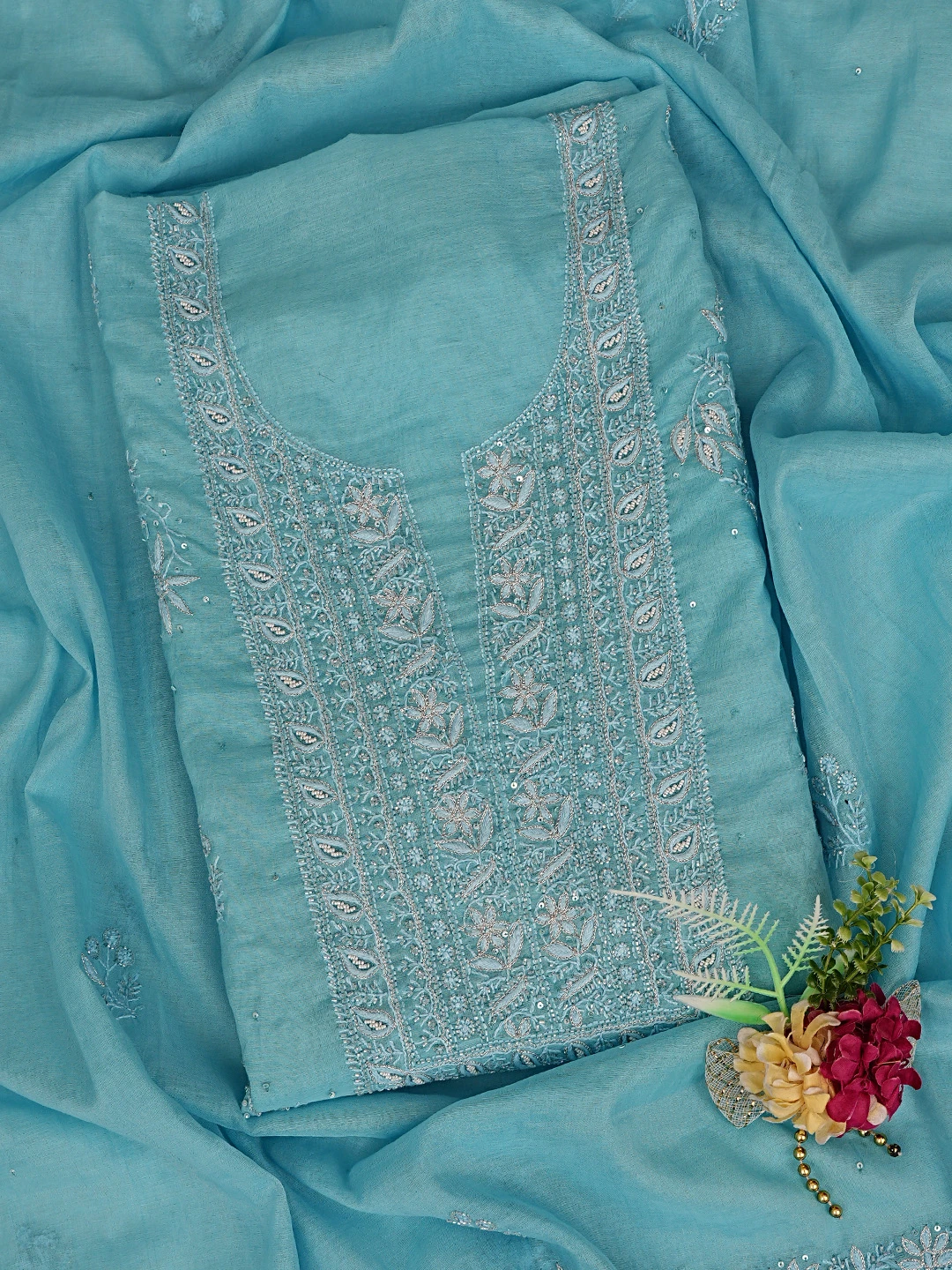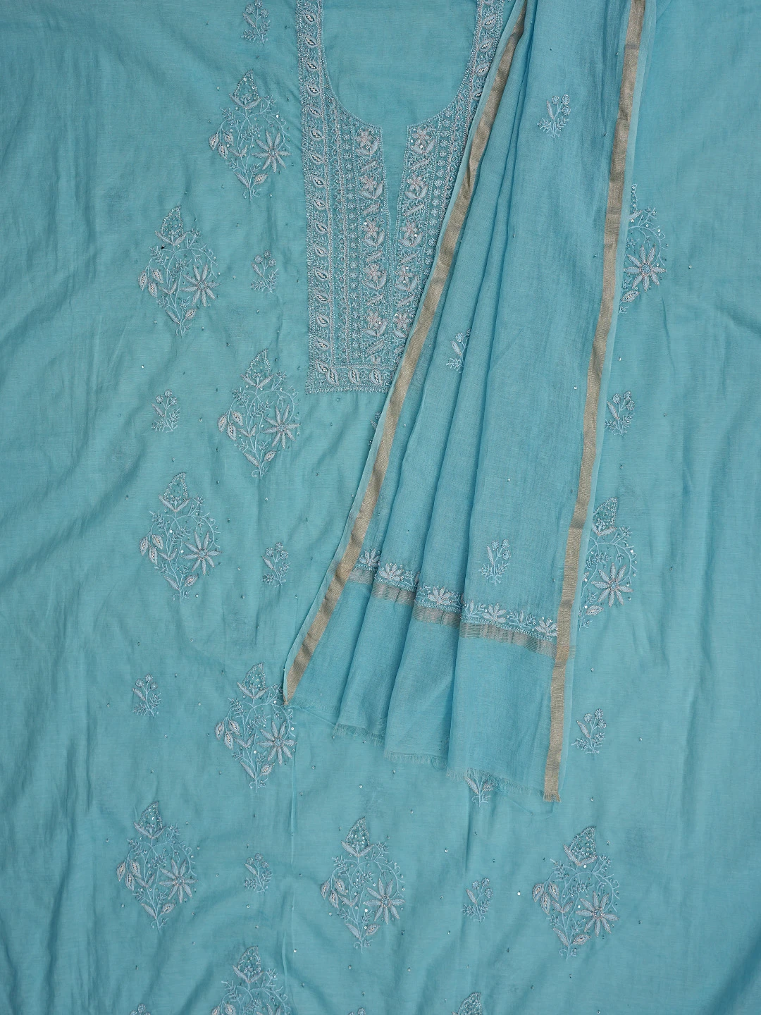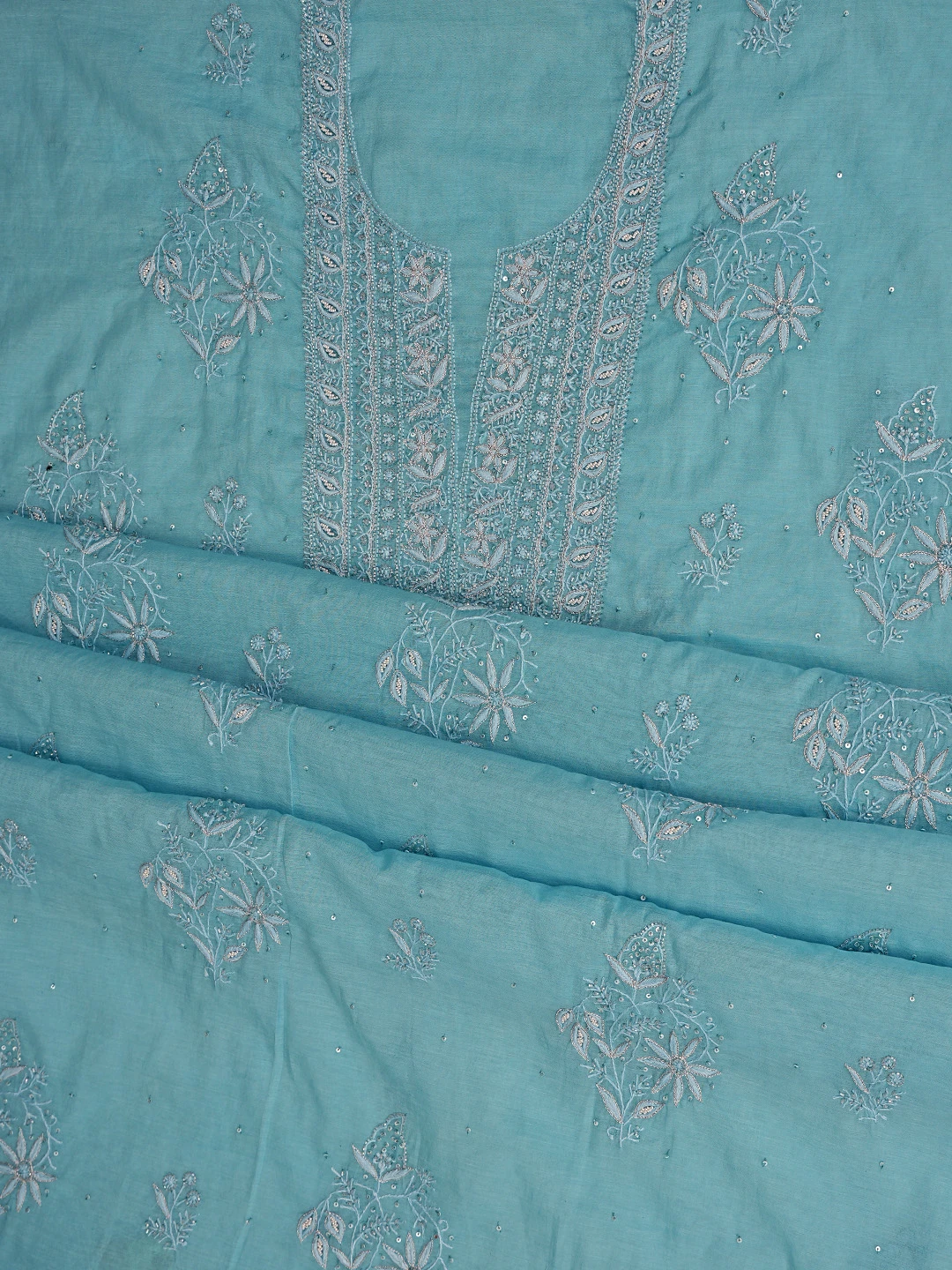Ada Hand Embroidered Blue Chanderi Lucknowi Chikankari Unstitched Kurta Dupatta Set With Cutdana Work 01A605344