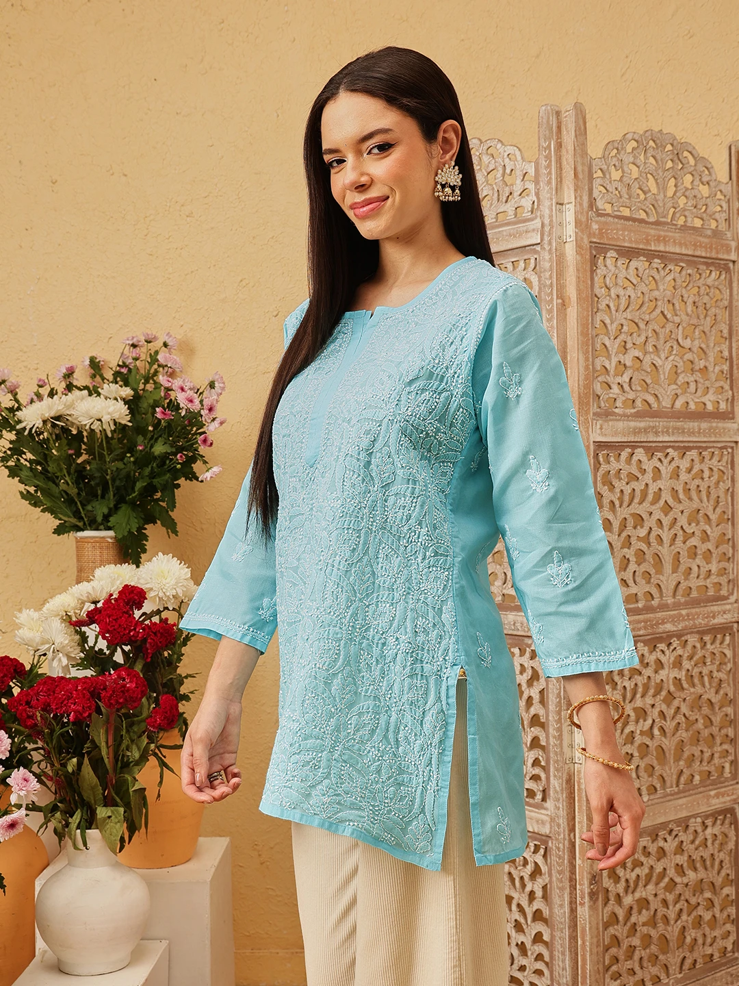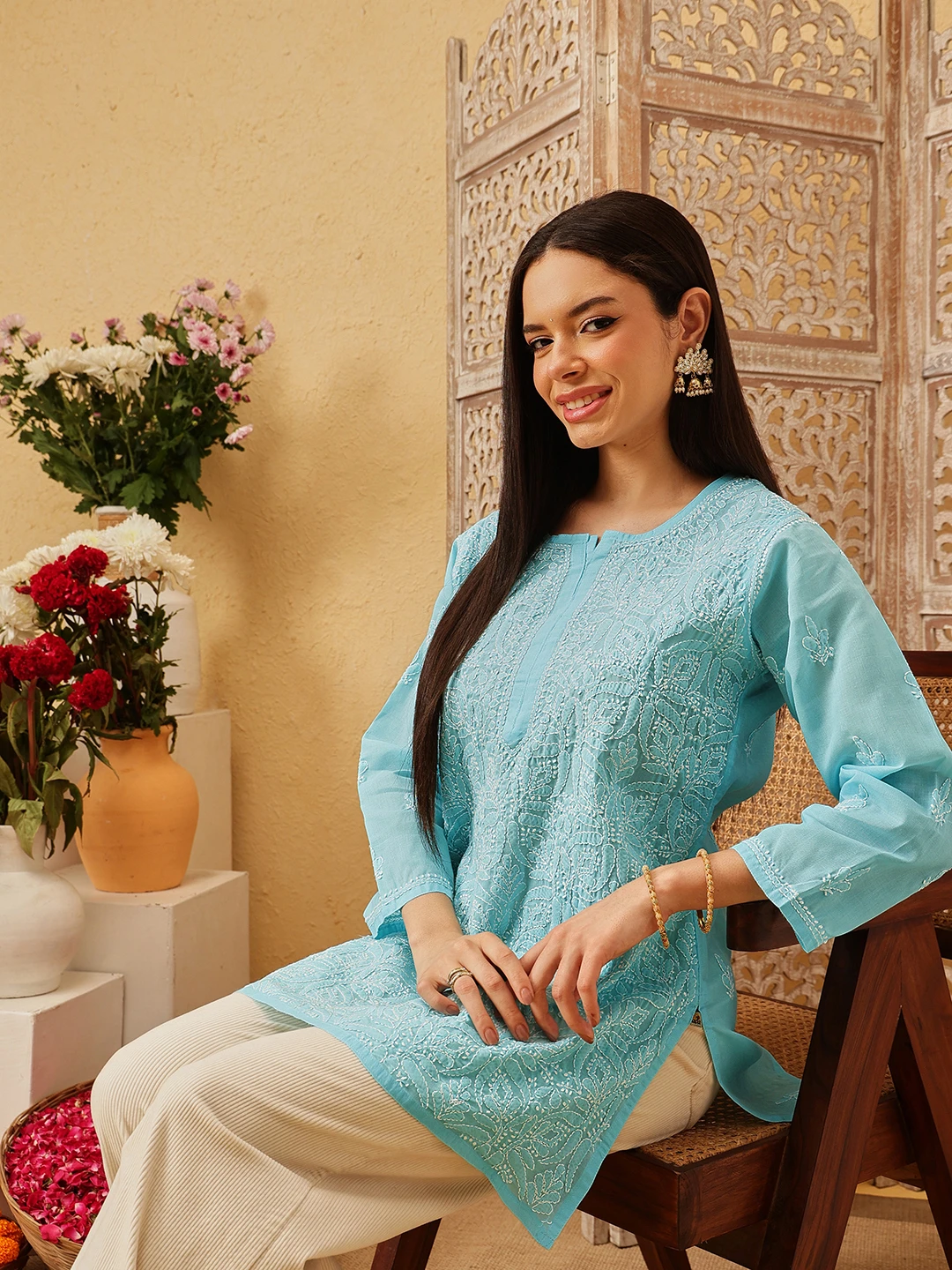 Ada Hand Embroidered Blue Cotton Lucknowi Chikankari Straight Kurti A911552