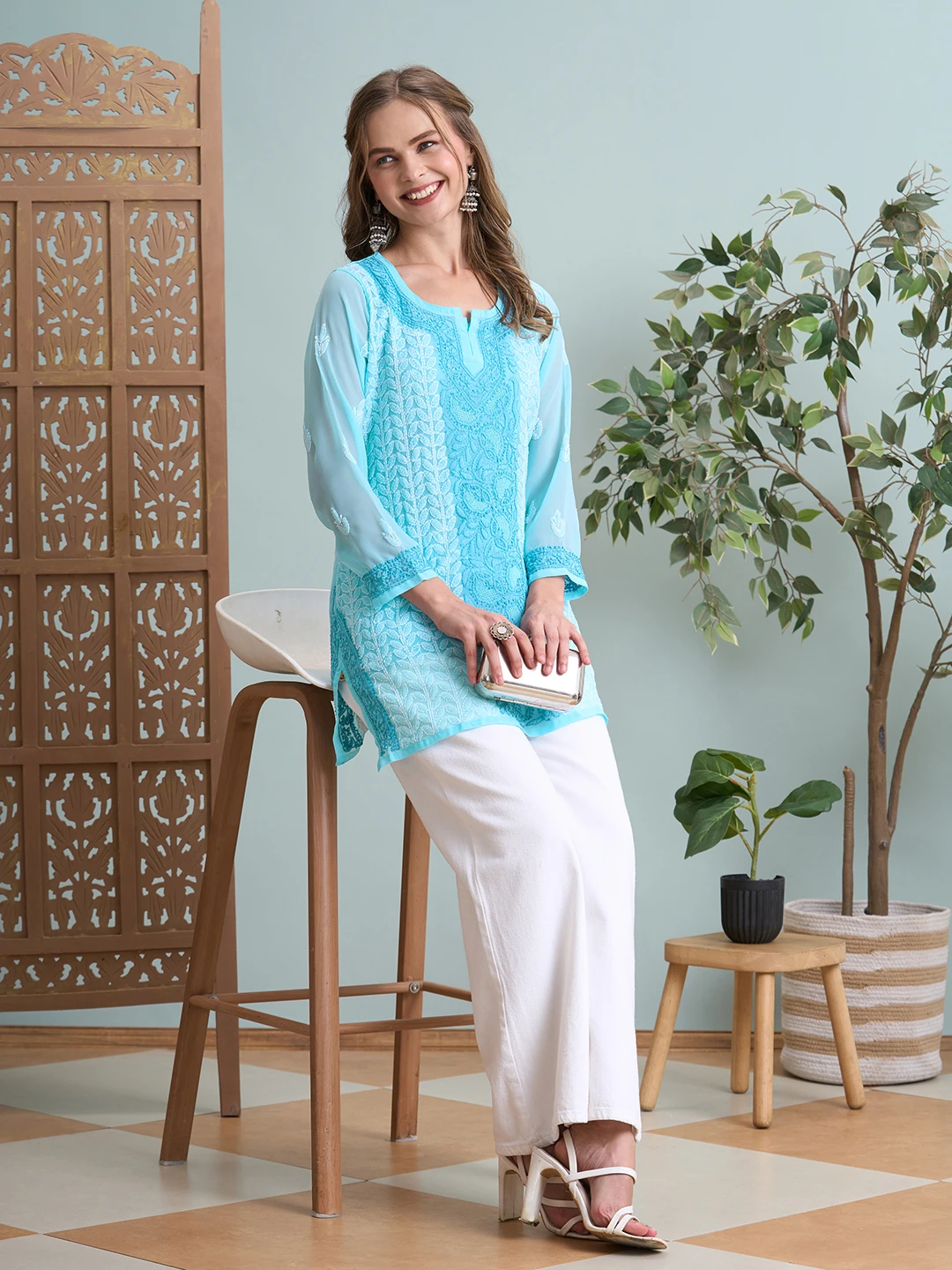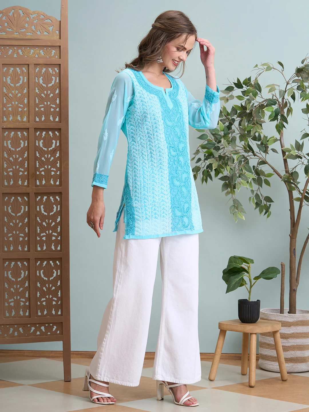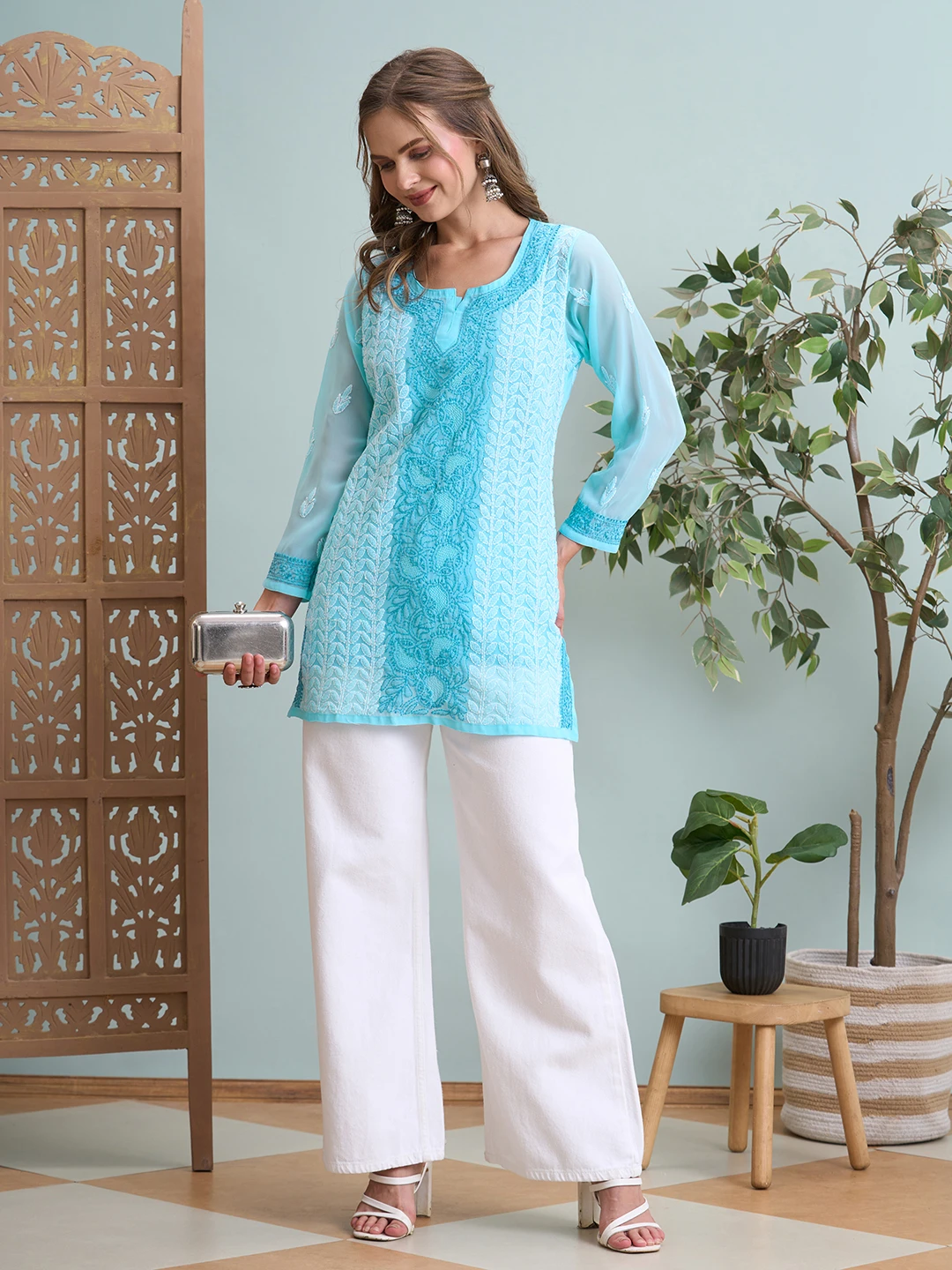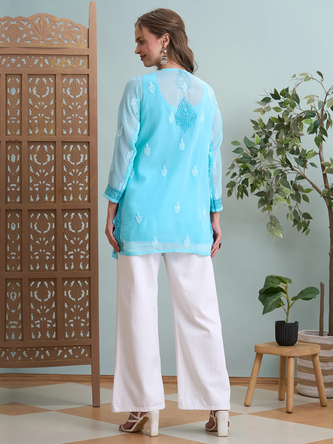 Ada Hand Embroidered Blue Georgette Lucknowi Chikankari Short Kurti A911519