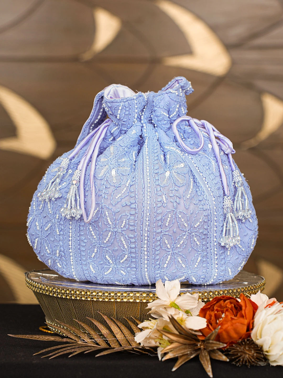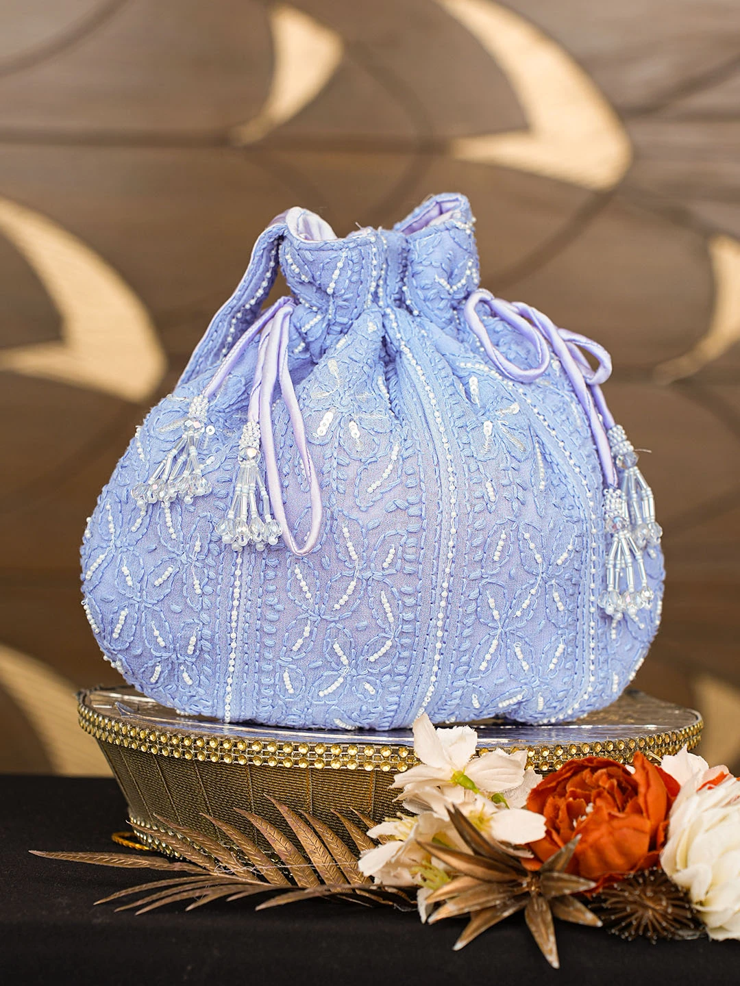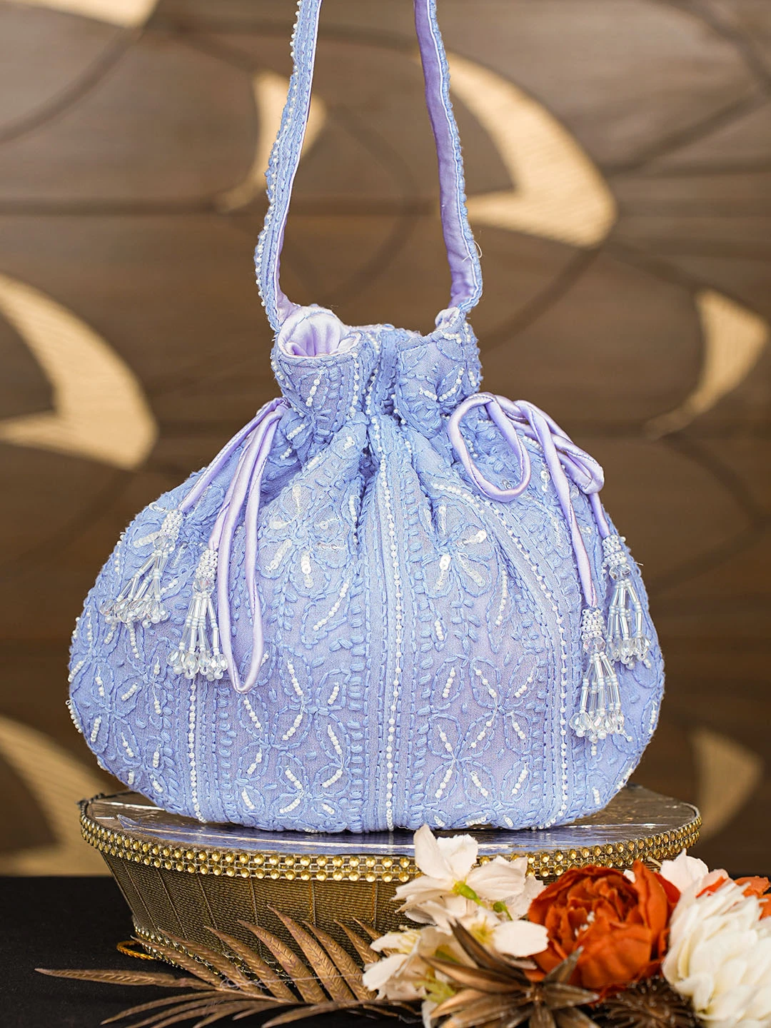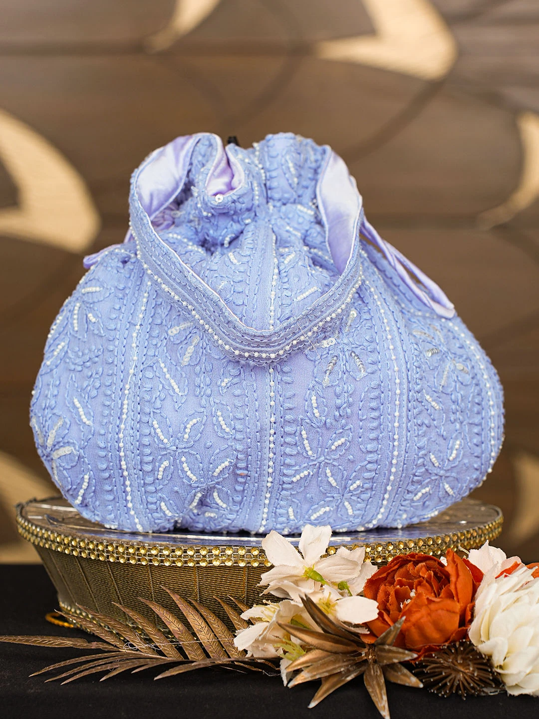 Ada Hand Embroidered Blue Viscose Georgette Lucknowi Chikankari Potli Bag With Pearl Work 01A854334
