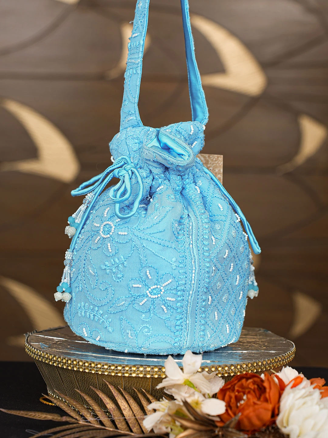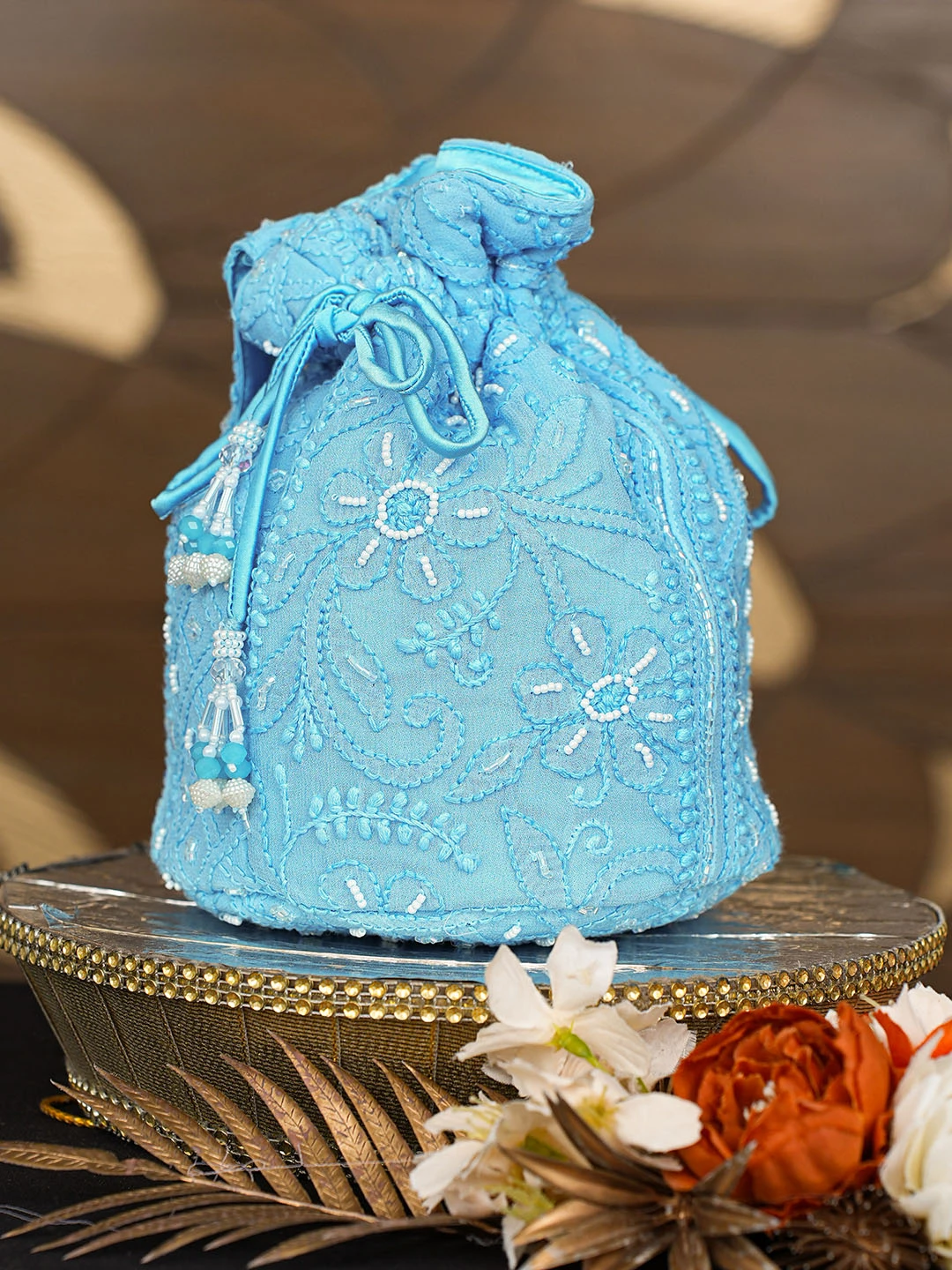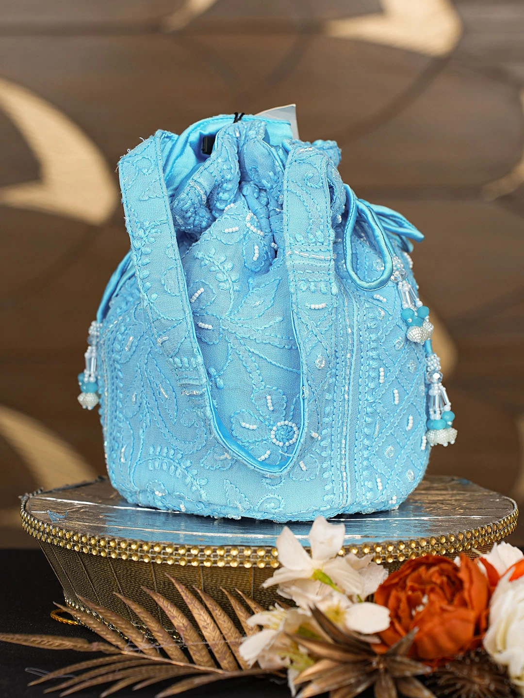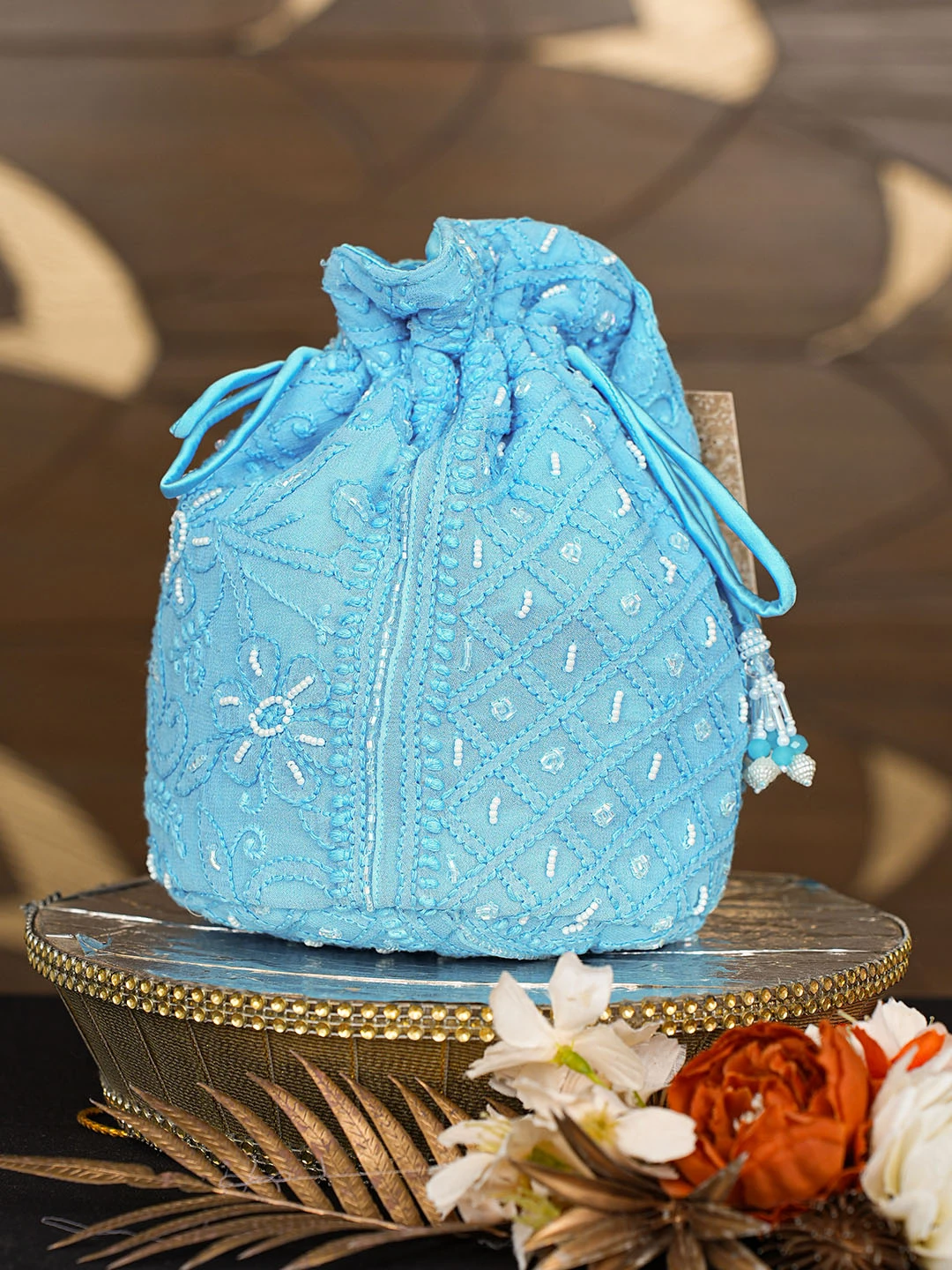 Ada Hand Embroidered Blue Viscose Georgette Lucknowi Chikankari Potli Bag With Pearl Work 01A854337
