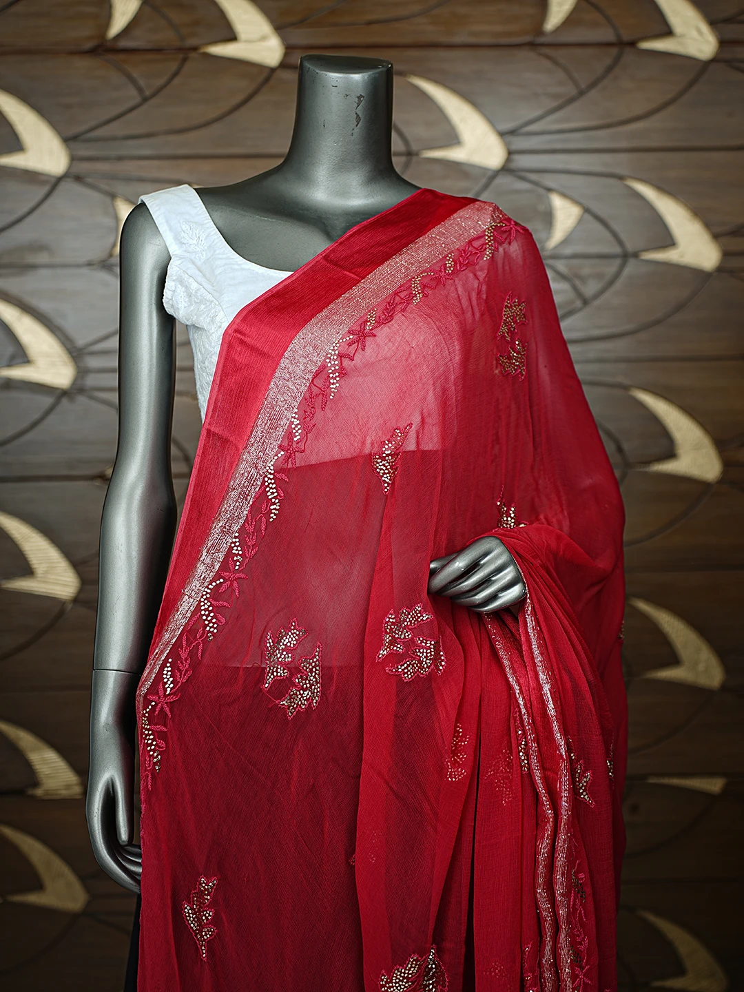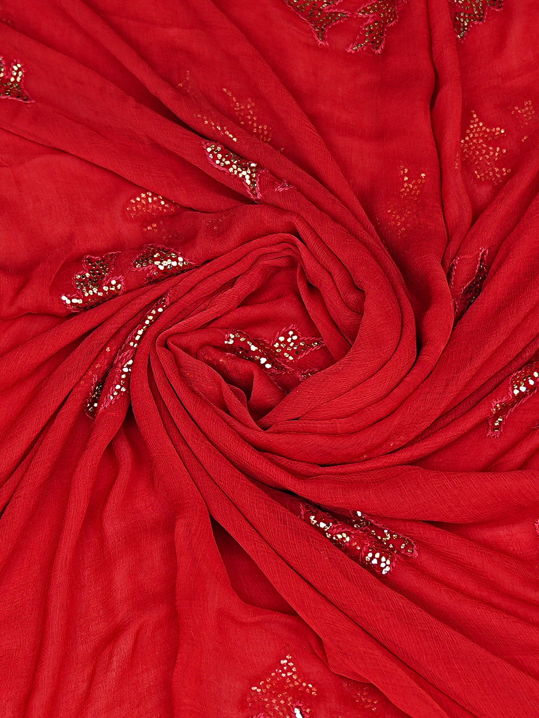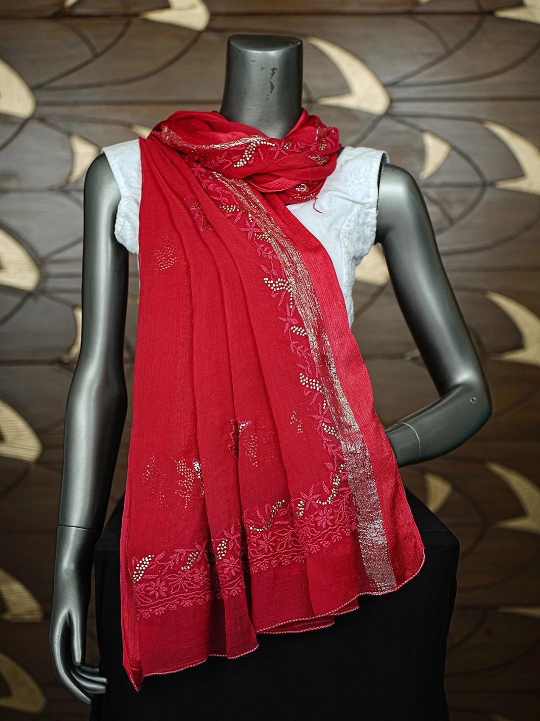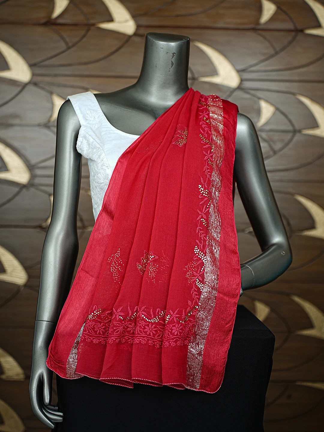 Ada Hand Embroidered Carmine Red Chiffon Lucknowi Chikankari Dupatta With Mukaish Work 01A620260