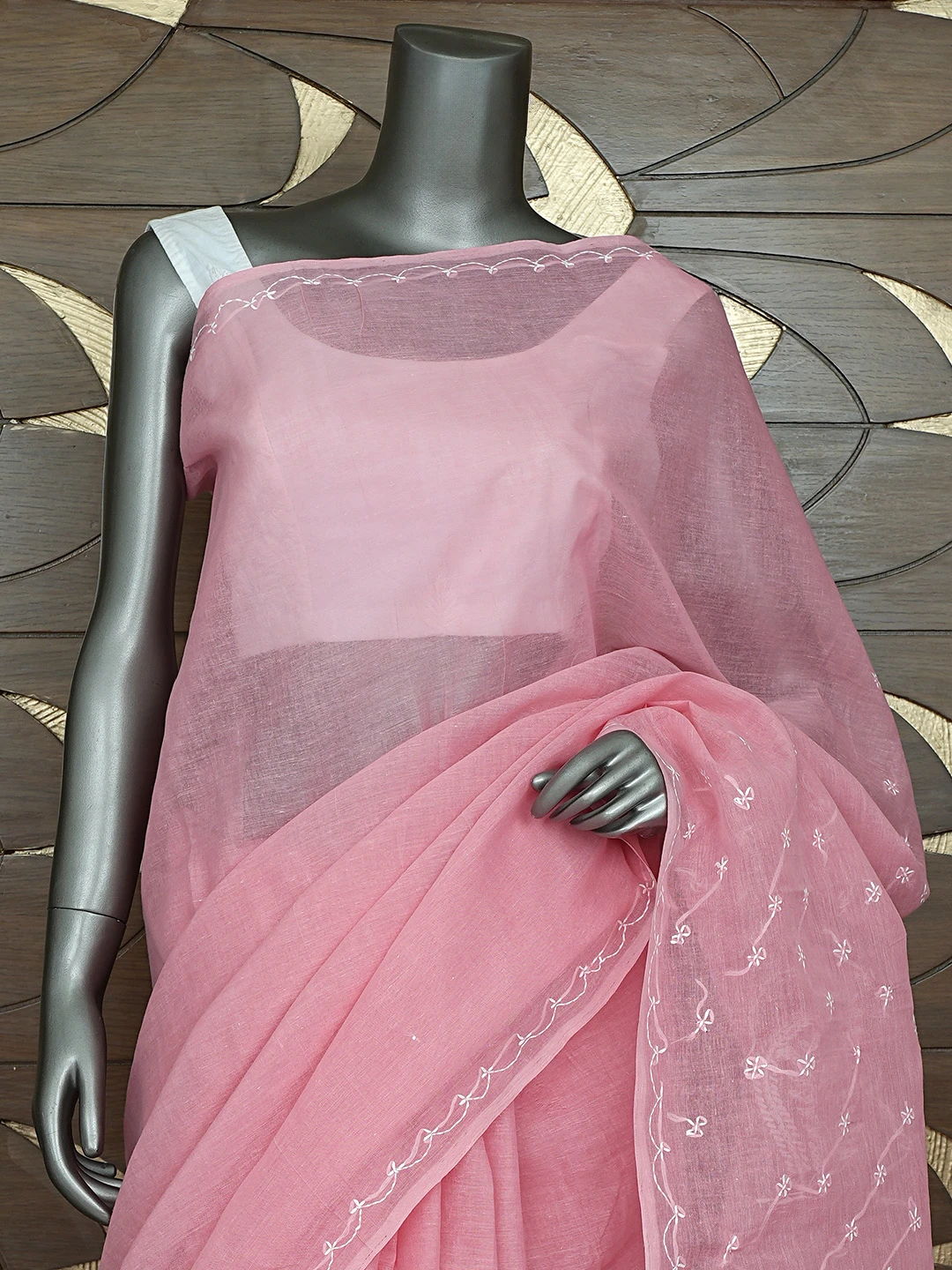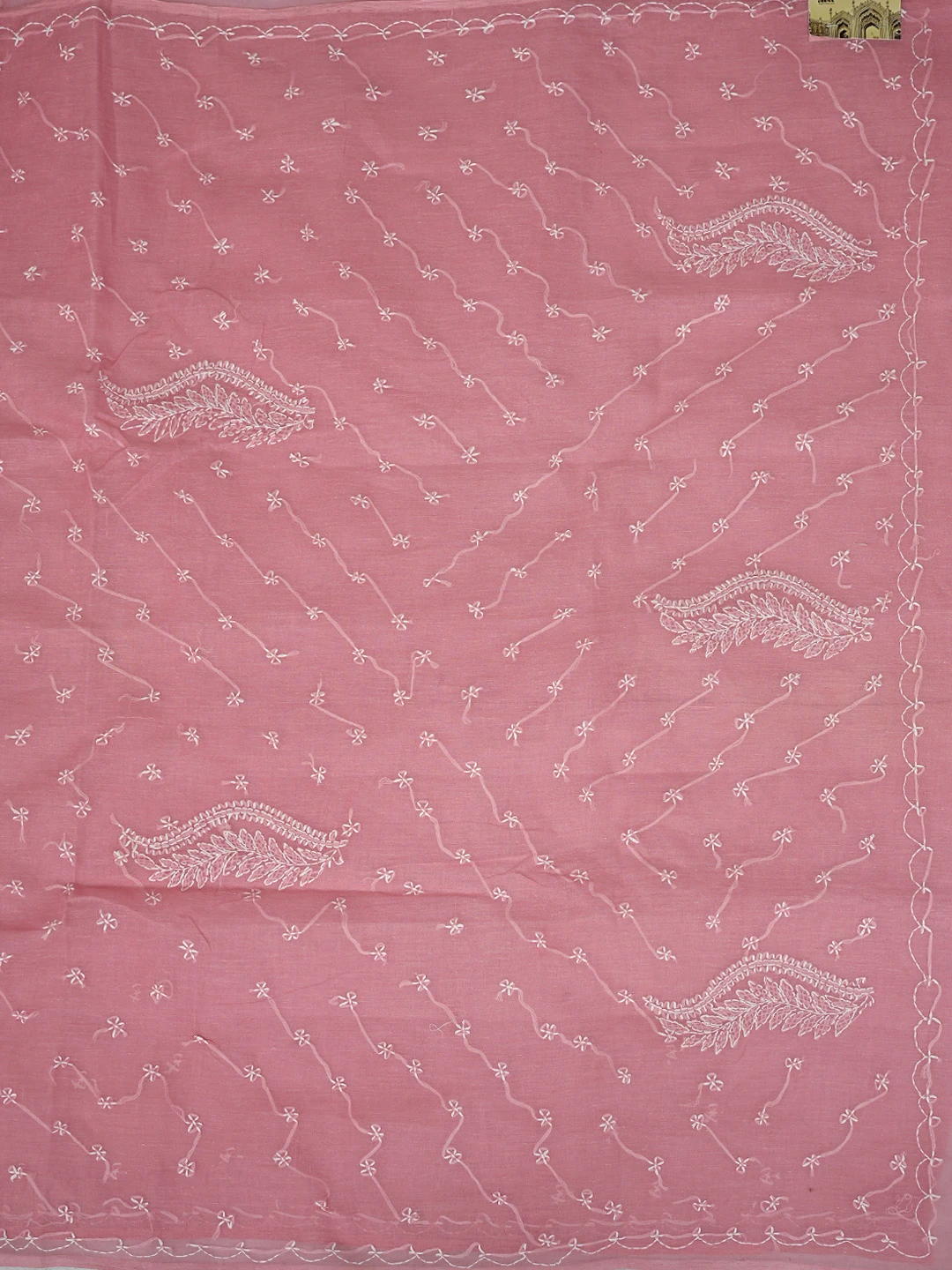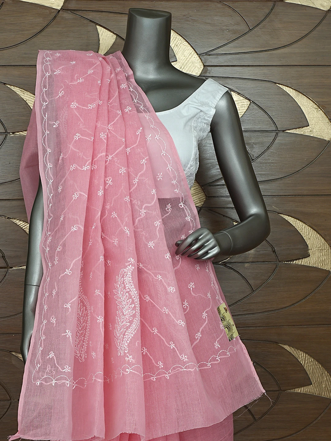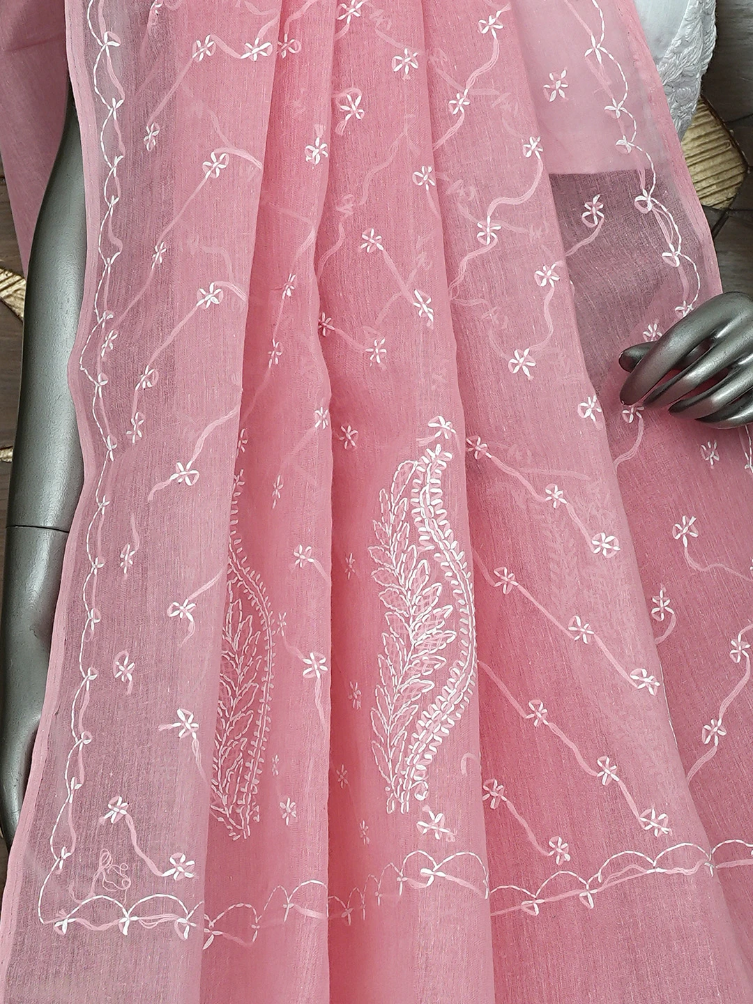Ada Hand Embroidered Carrot Pink Cotton Lucknowi Chikankari Saree and Blouse 01A882911