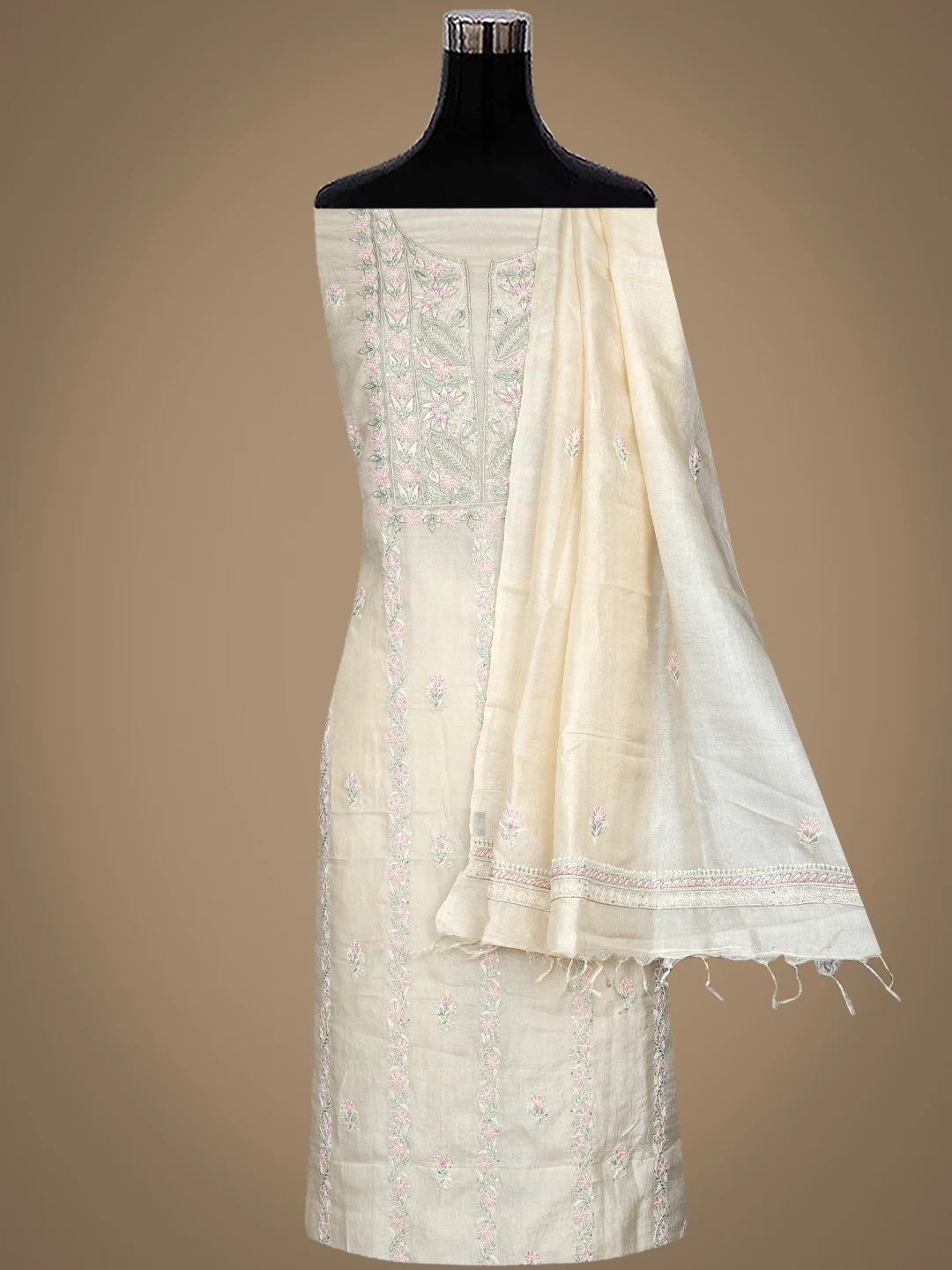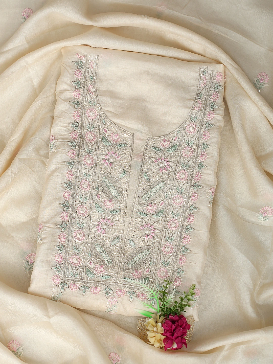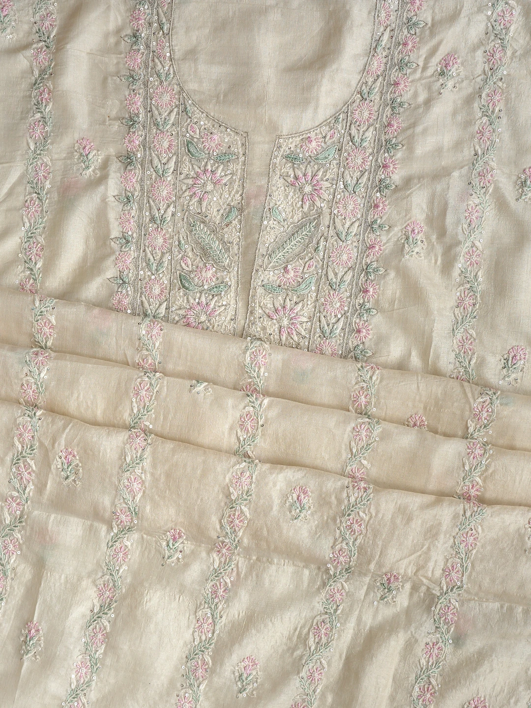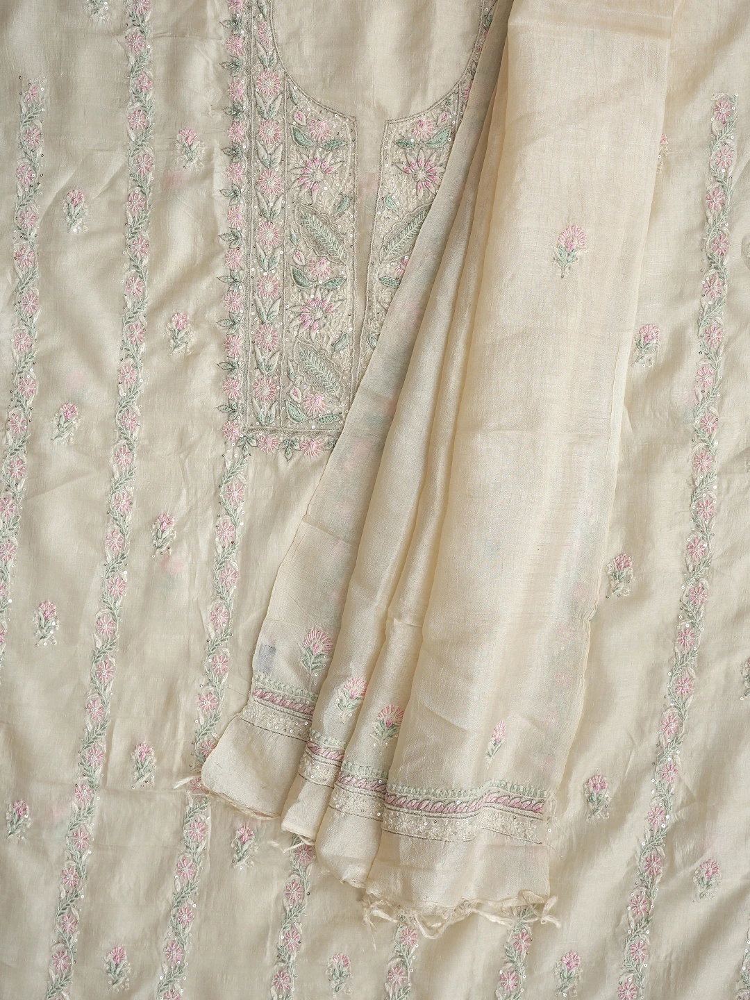 Ada Hand Embroidered Cream Tussar Silk Lucknowi Chikankari Unstitched Kurta Dupatta Set With Sequinned Work 01A843837