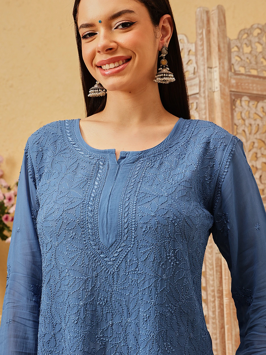 Ada Hand Embroidered Dark Blue Georgette Lucknowi Chikankari Short Kurti A911543