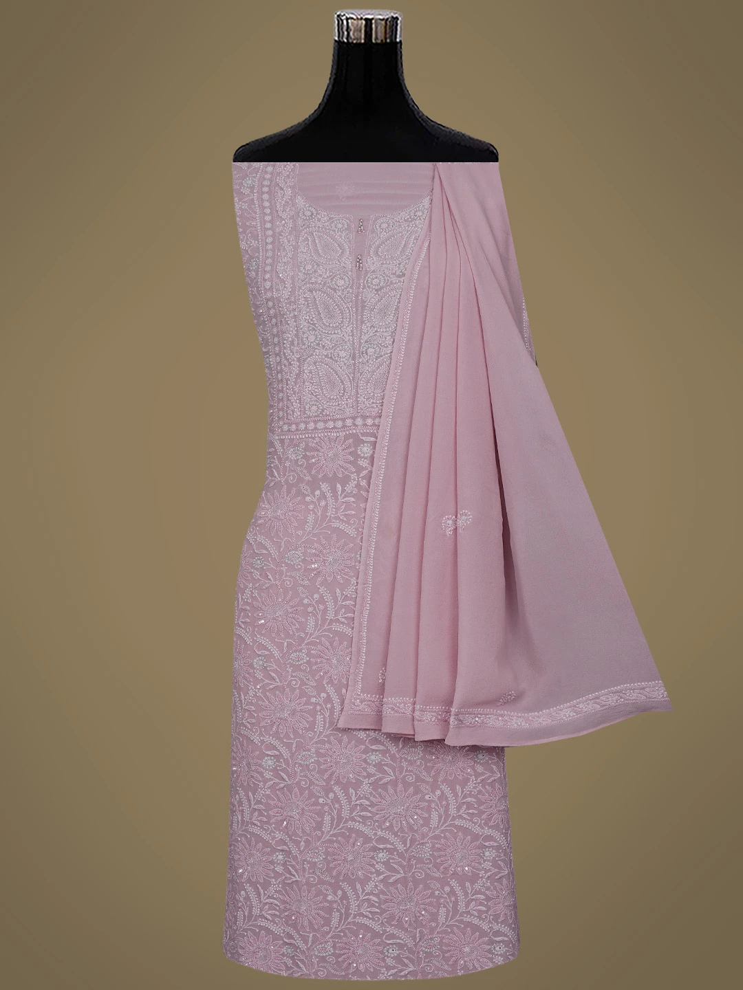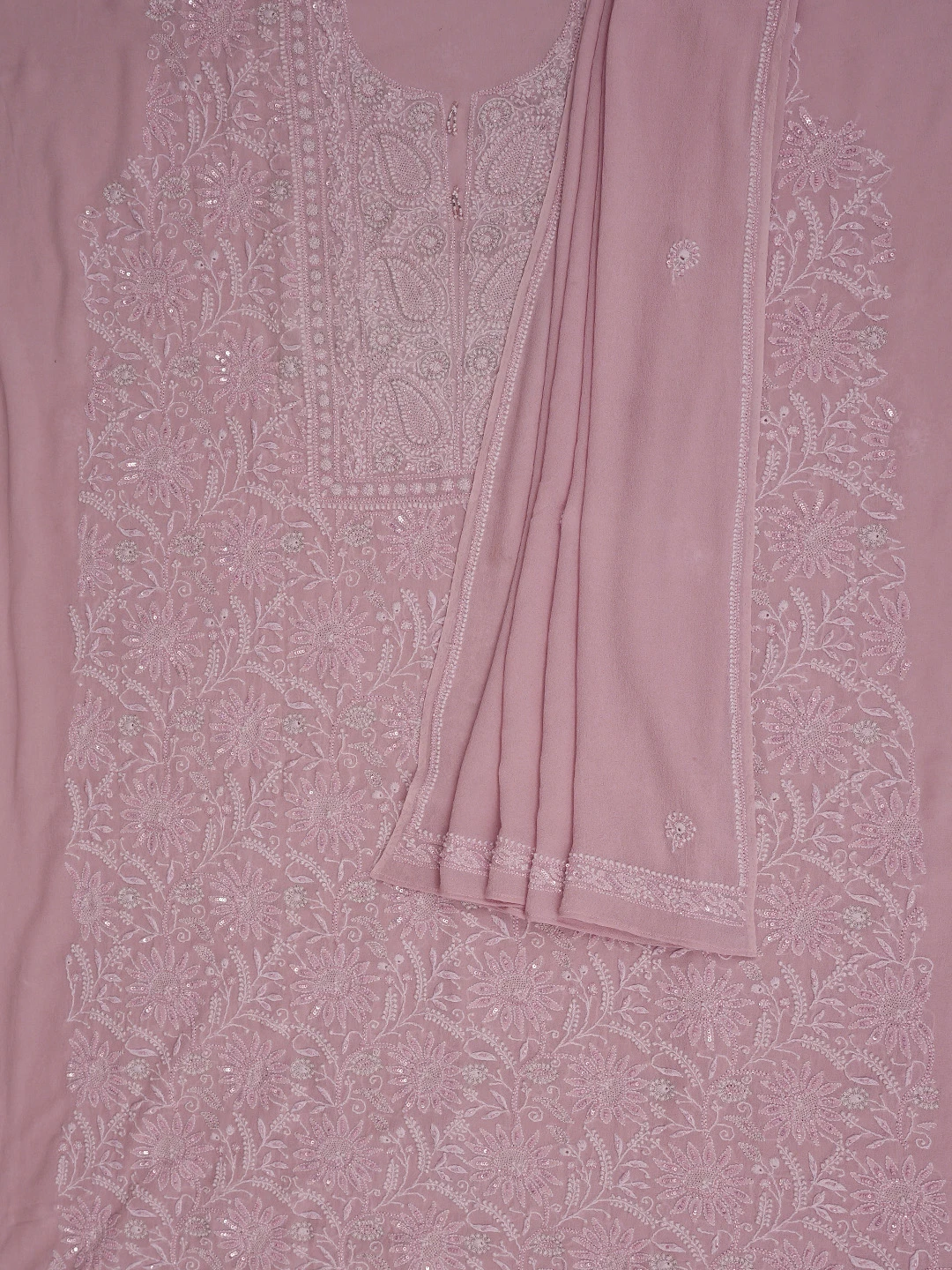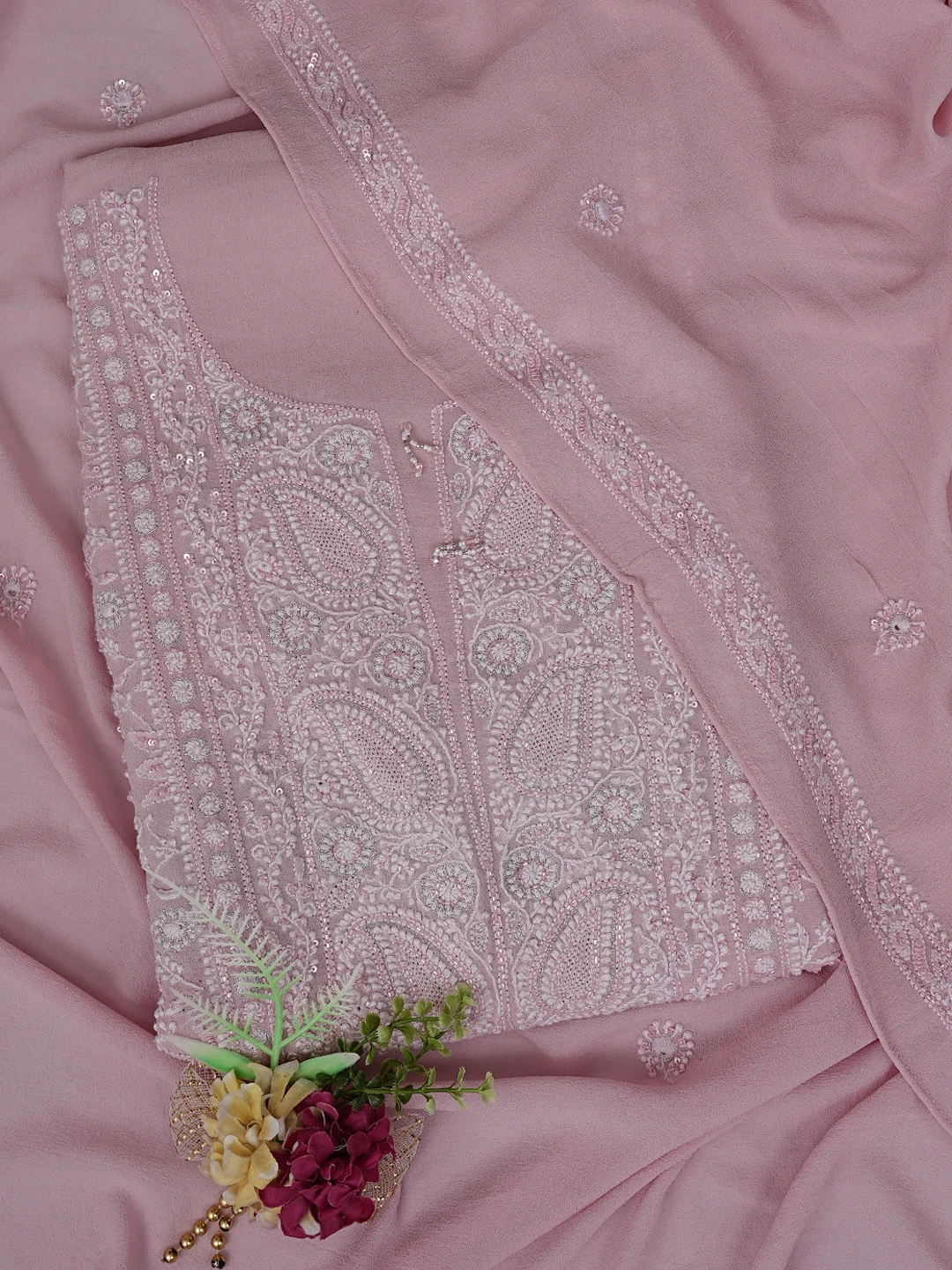 Ada Hand Embroidered Dusty Peach Pure Georgette Lucknowi Chikankari Unstitched Kurta Dupatta Set With Sequinned Work 01A580670