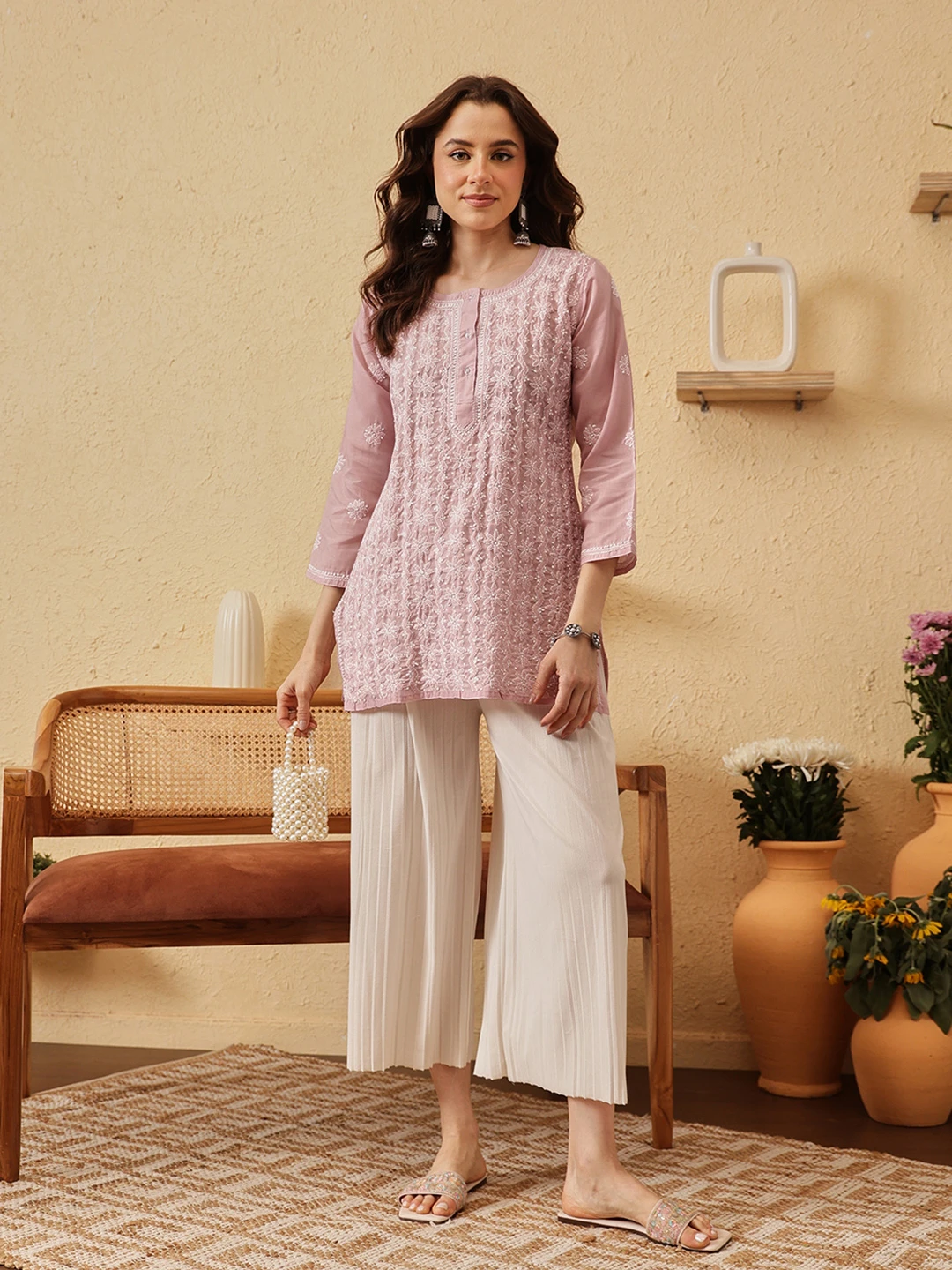 Ada Hand Embroidered Dusty Pink Cotton Lucknowi Chikankari Short Kurti A911529