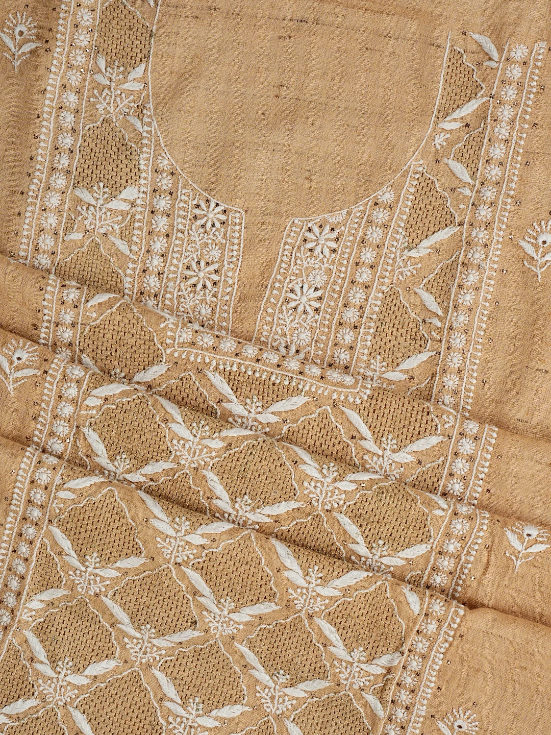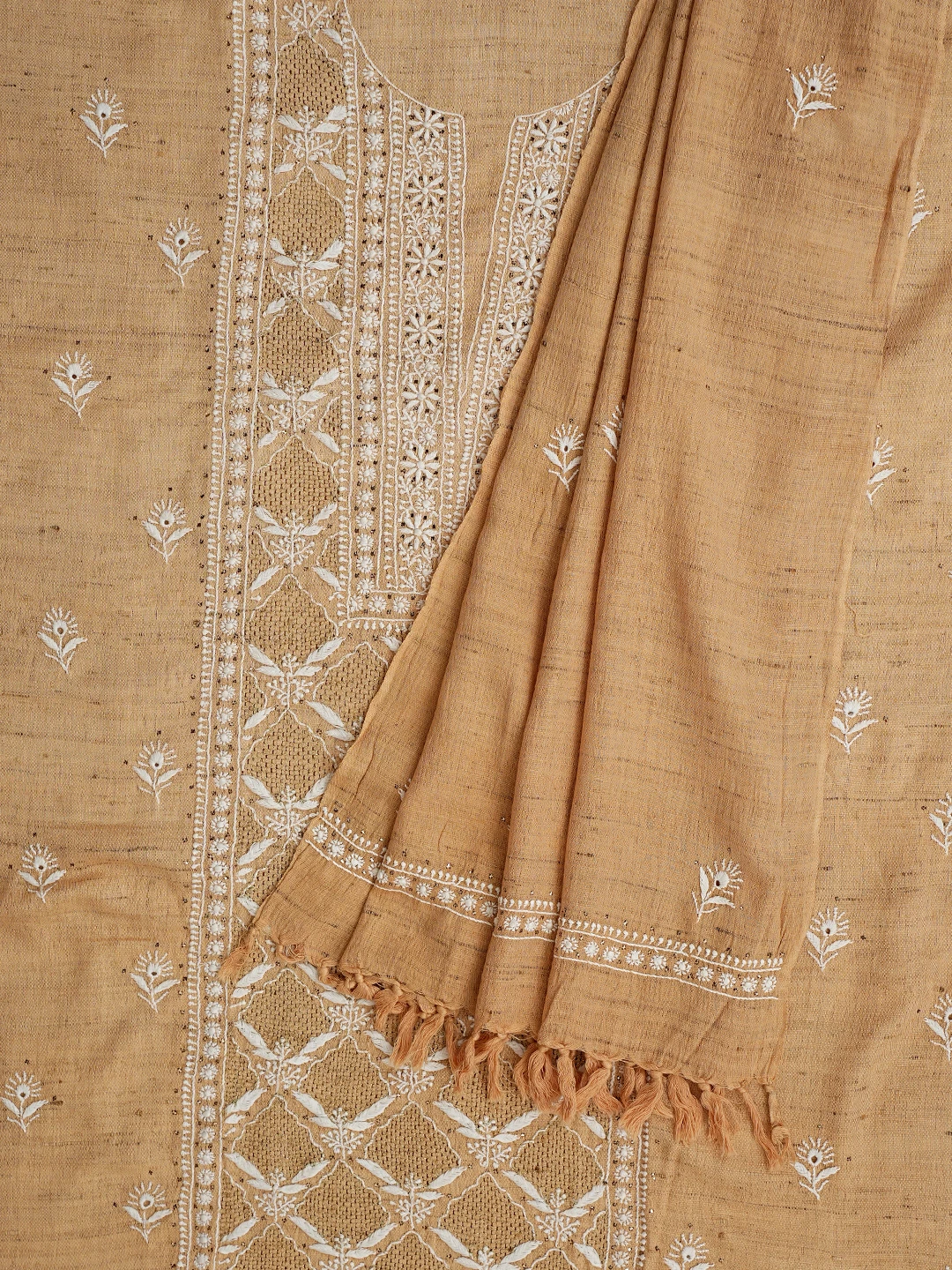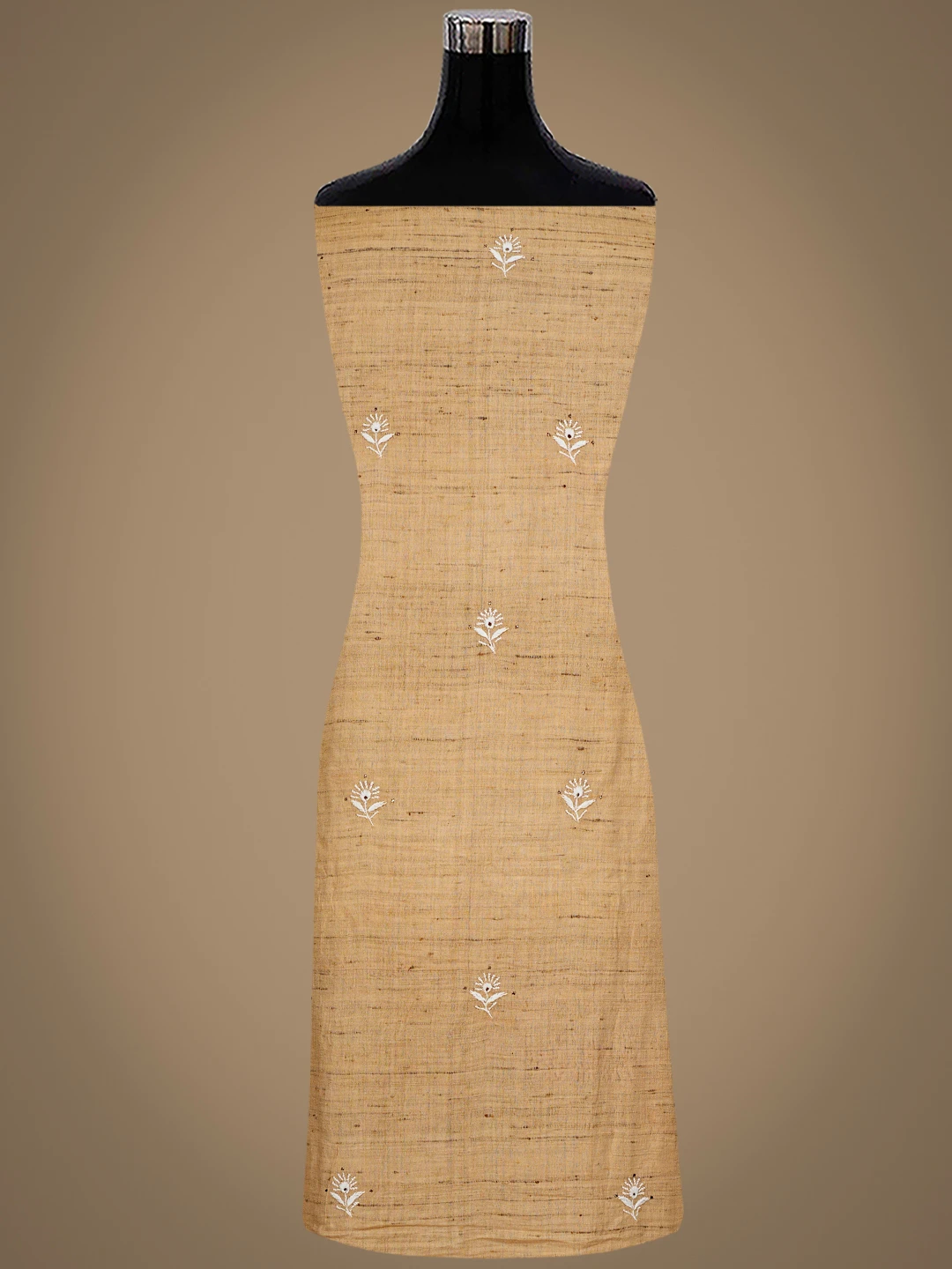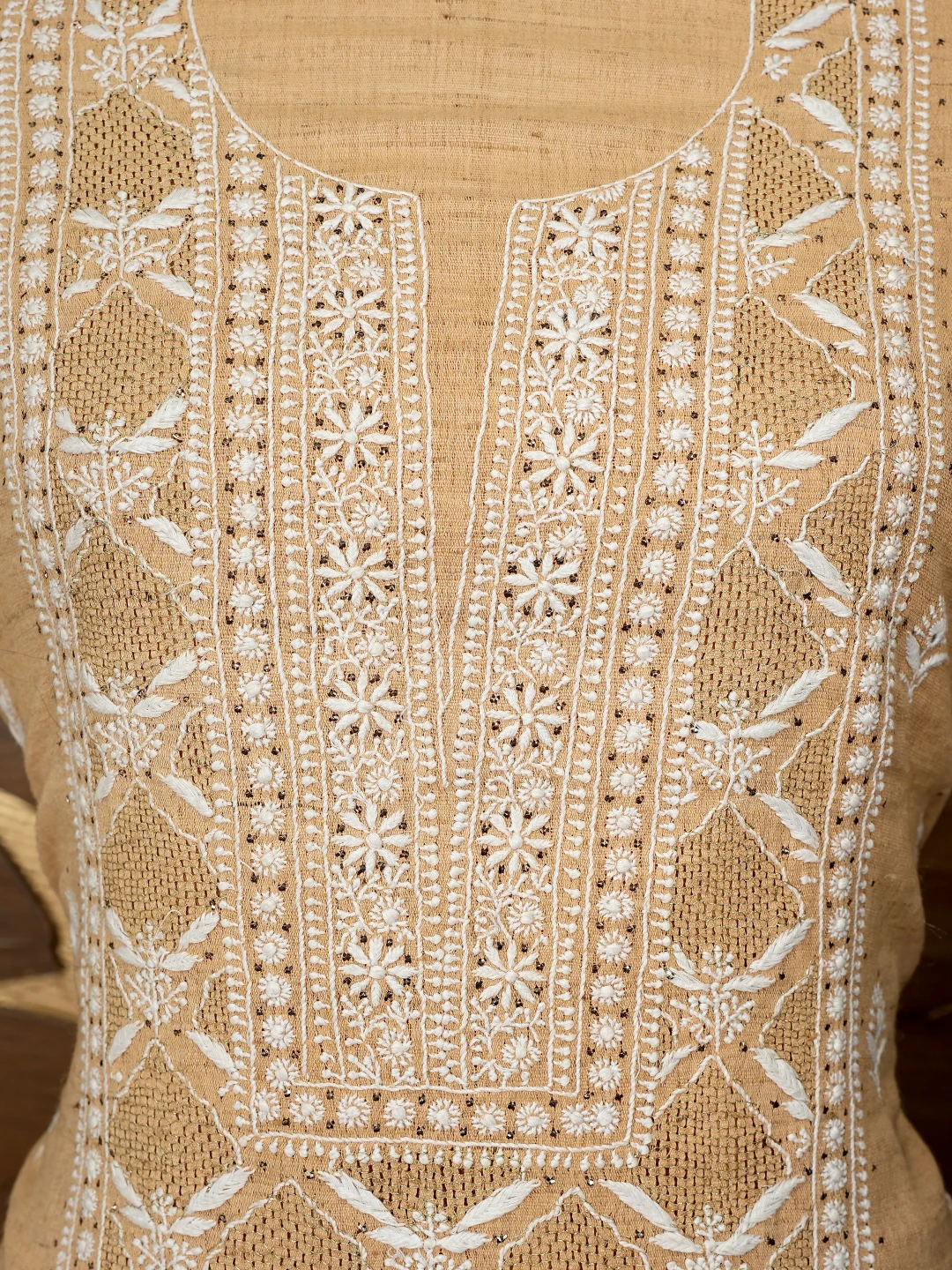 Ada Hand Embroidered Earth Yellow Fawn Khadi Lucknowi Chikankari Unstitched Kurta Dupatta Set With Mukaish Work 01A507072
