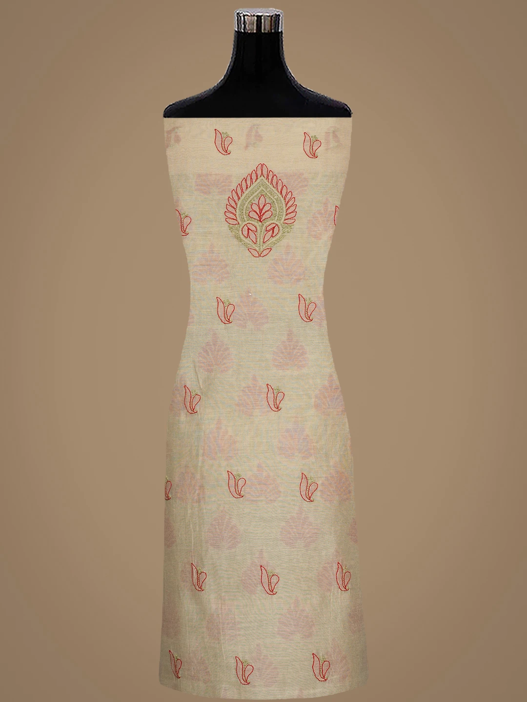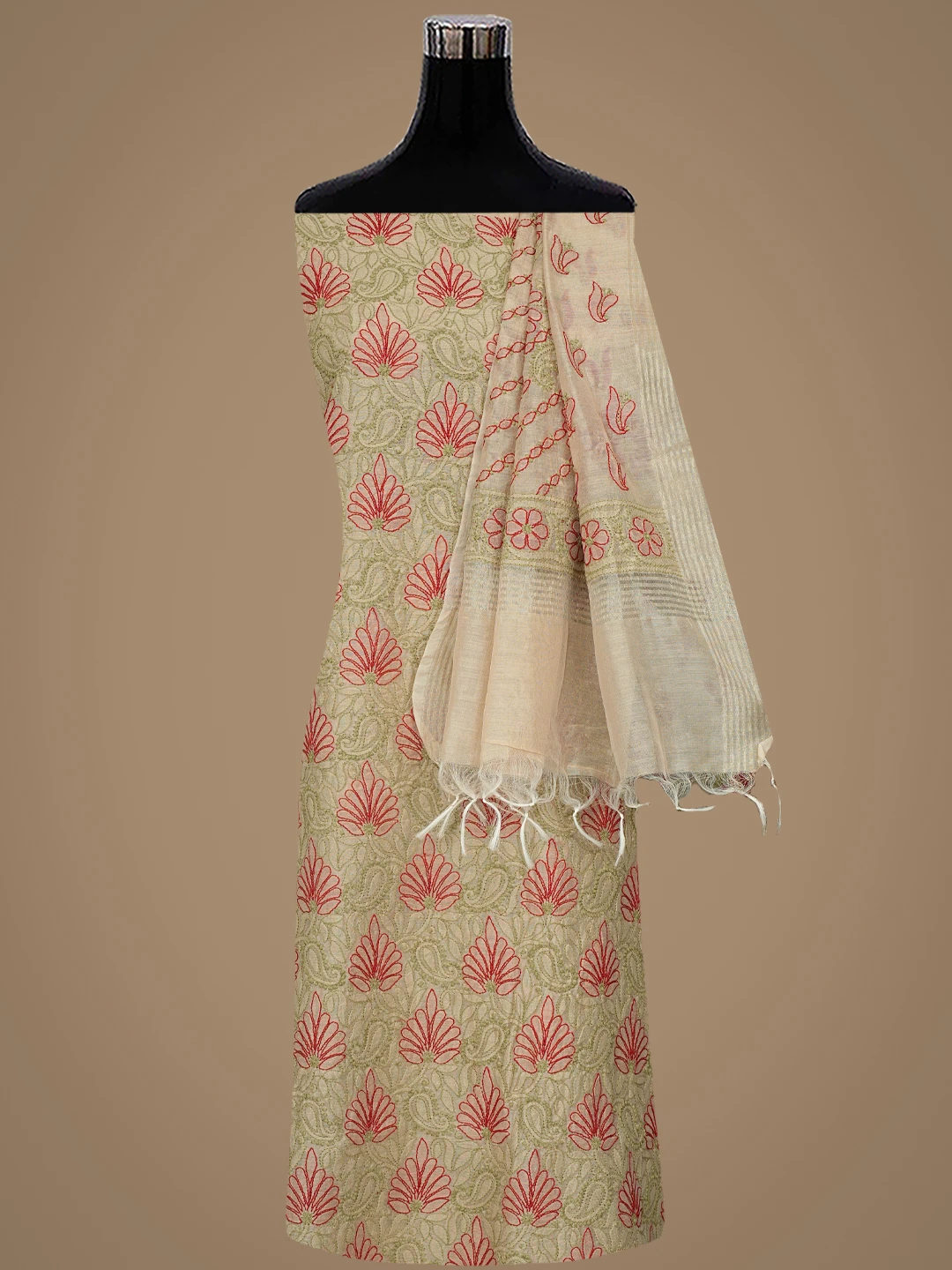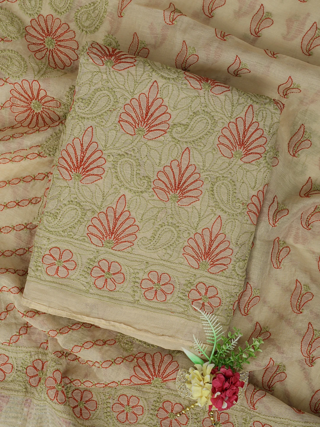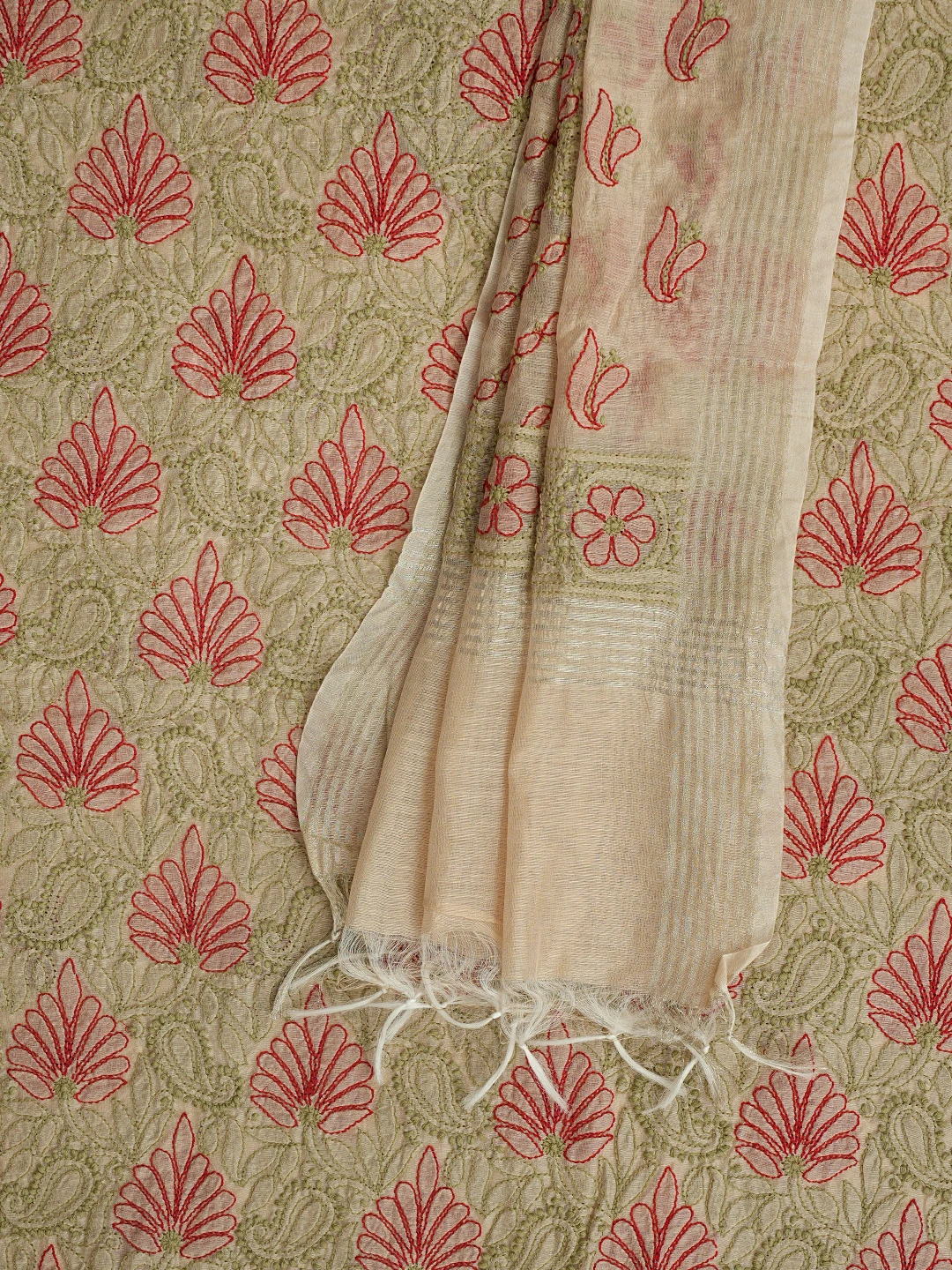 Ada Hand Embroidered Fawn Chanderi Lucknowi Chikankari Unstitched Kurta Dupatta Set 01A870994