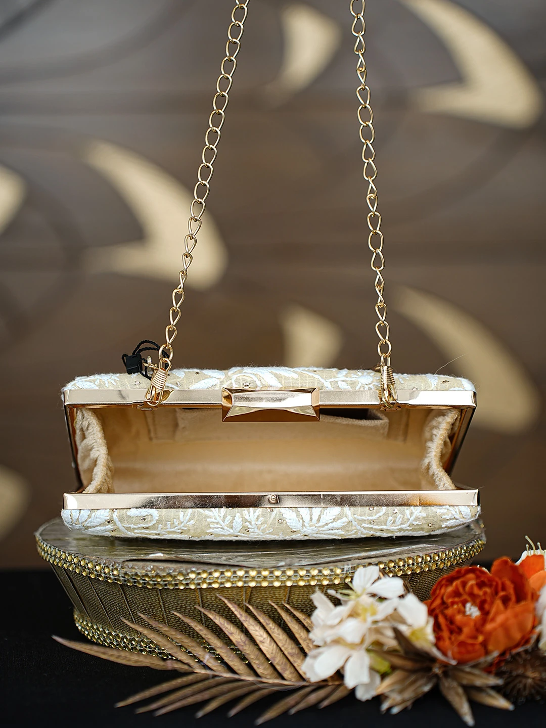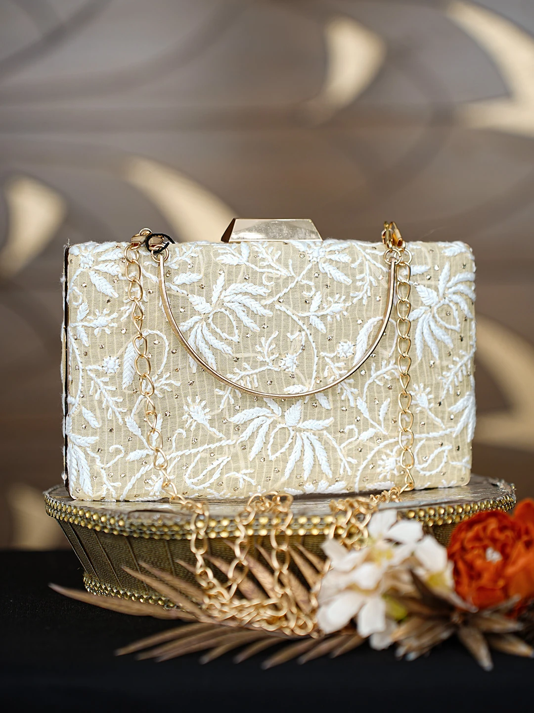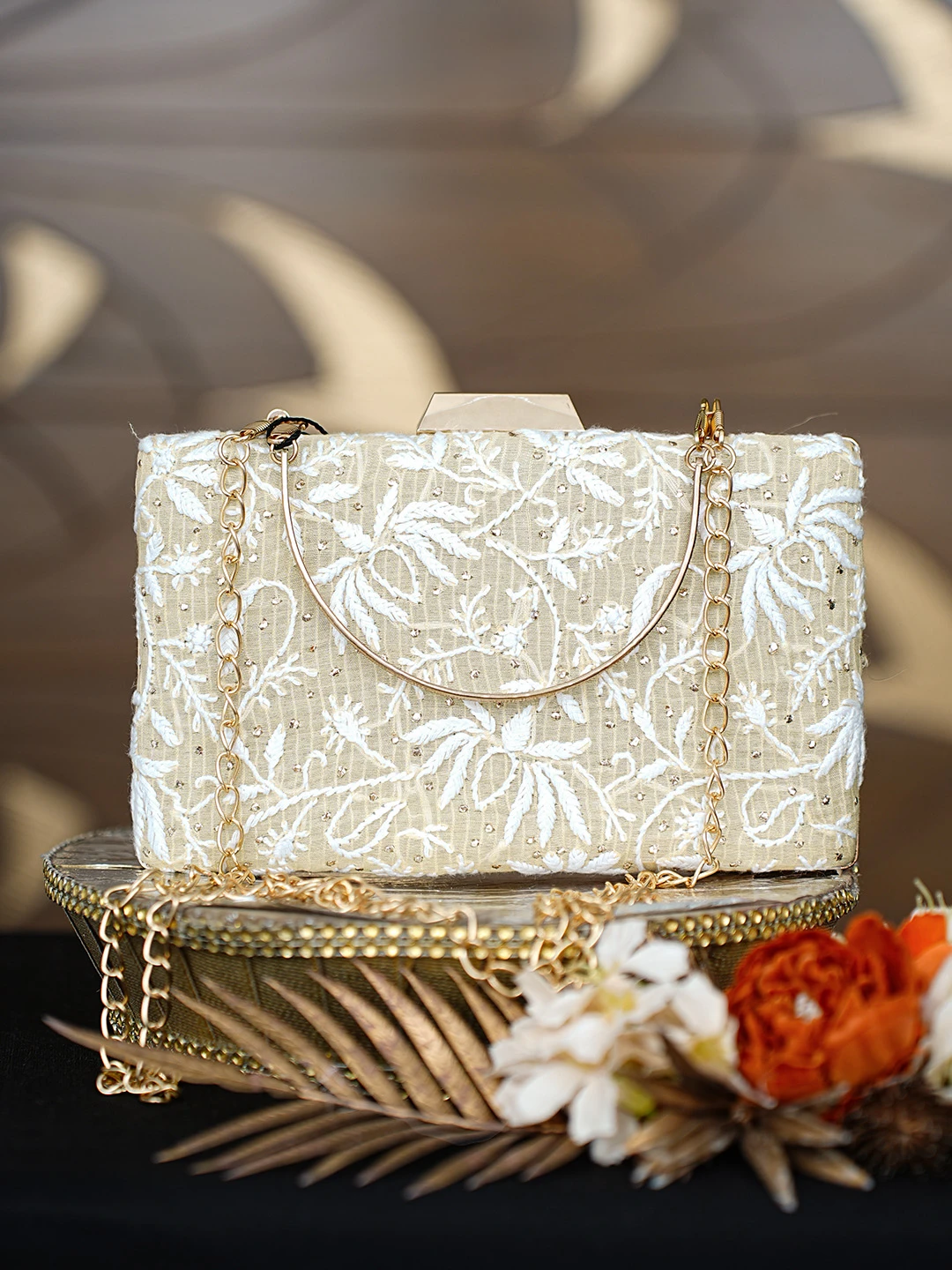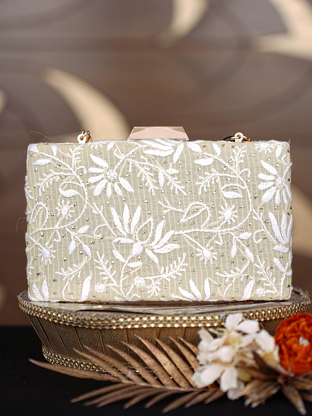 Ada Hand Embroidered Fawn Silk Lucknowi Chikankari Clutch With Mukaish Work 01A758993