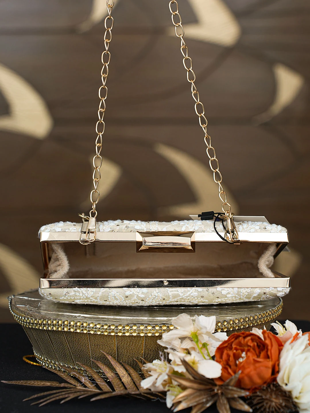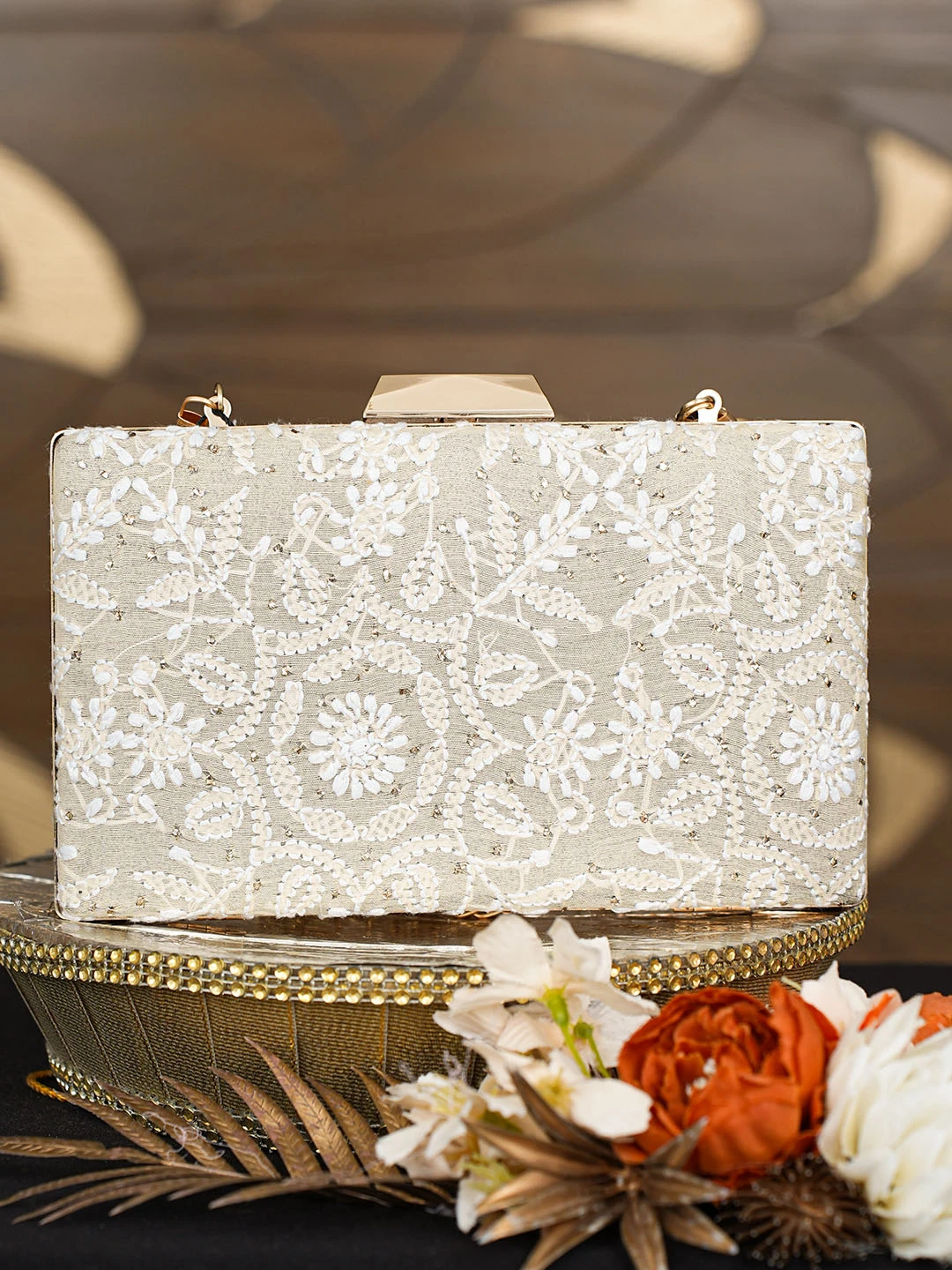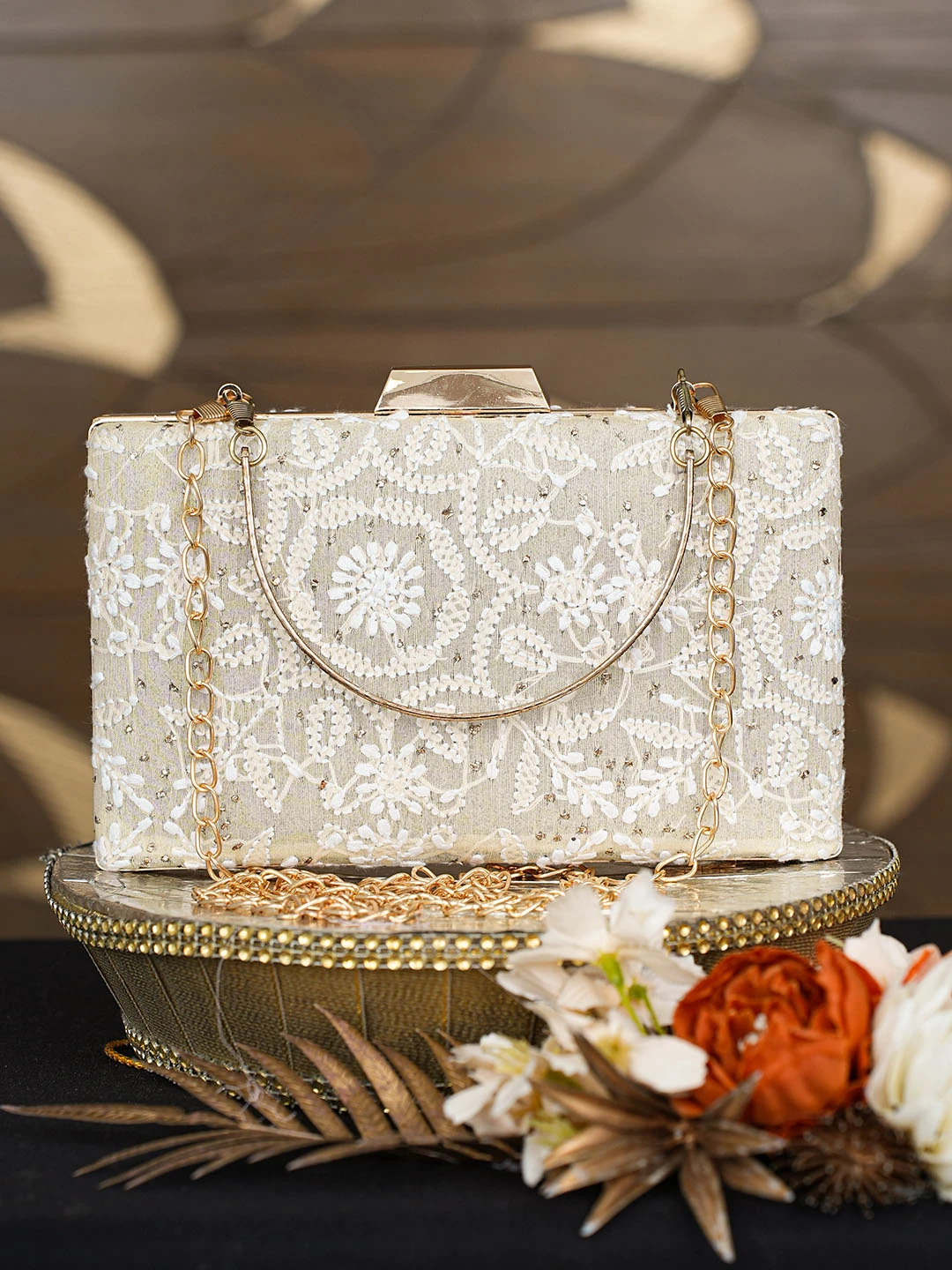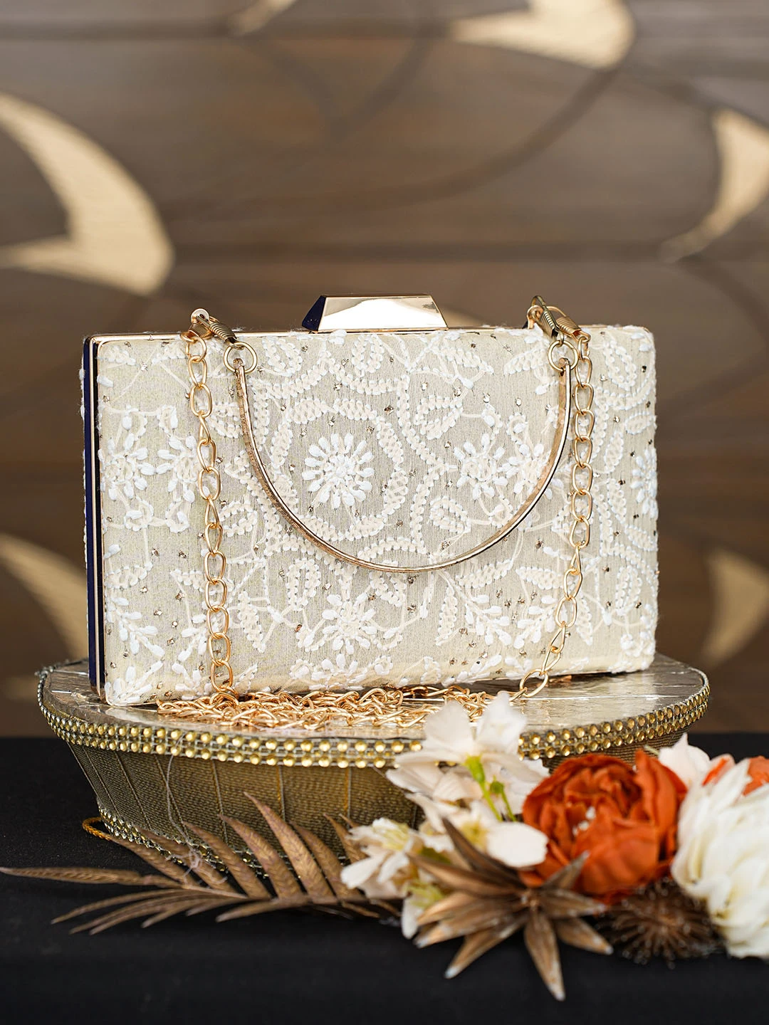 Ada Hand Embroidered Fawn Silk Lucknowi Chikankari Clutch With Mukaish Work 01A791417