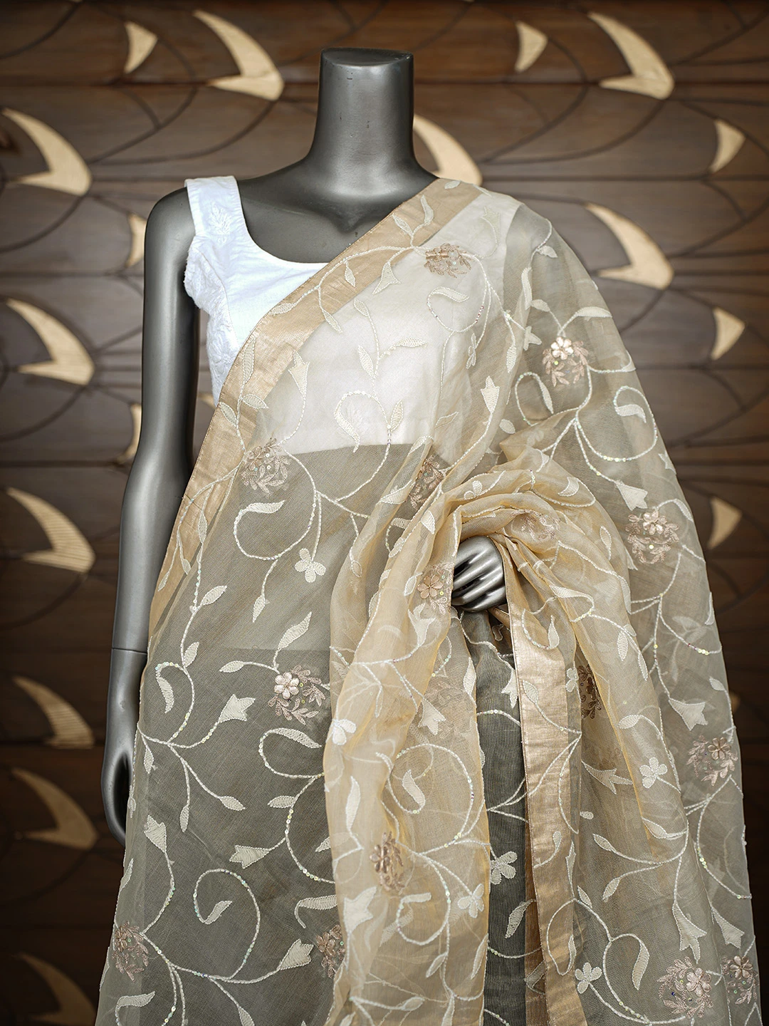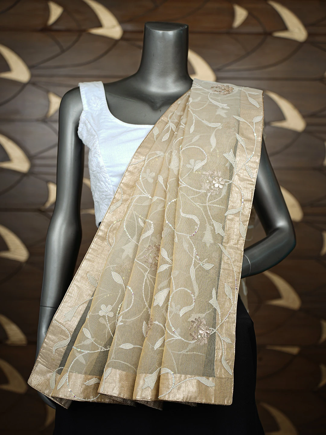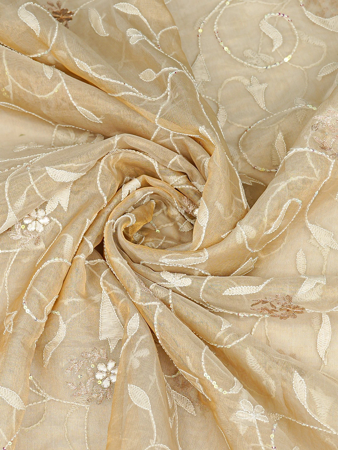 Ada Hand Embroidered Fawn Tissue Lucknowi Chikankari Dupatta With Sequinned Work 01A367905