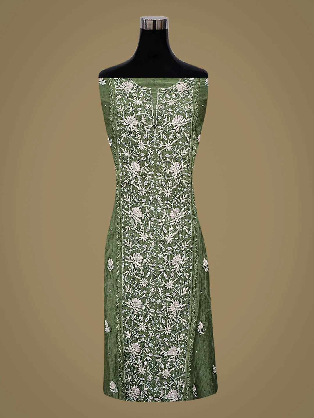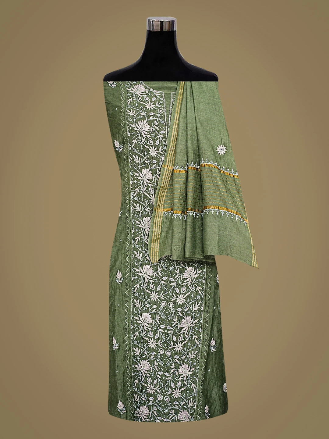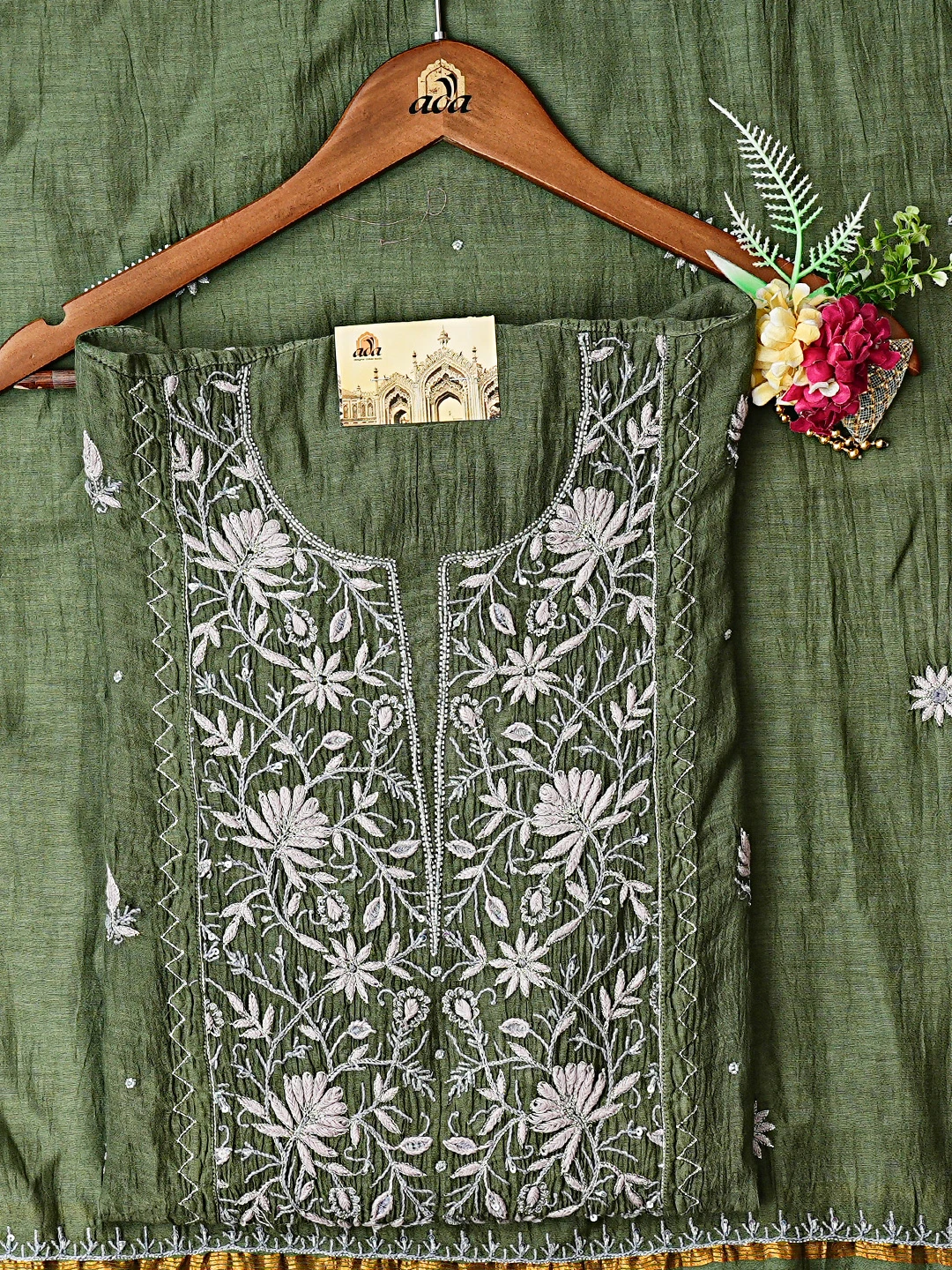 Ada Hand Embroidered Green Chanderi Lucknowi Chikankari Semi-Stitched Kurta Dupatta Set With Zari Taar Work 01A657831