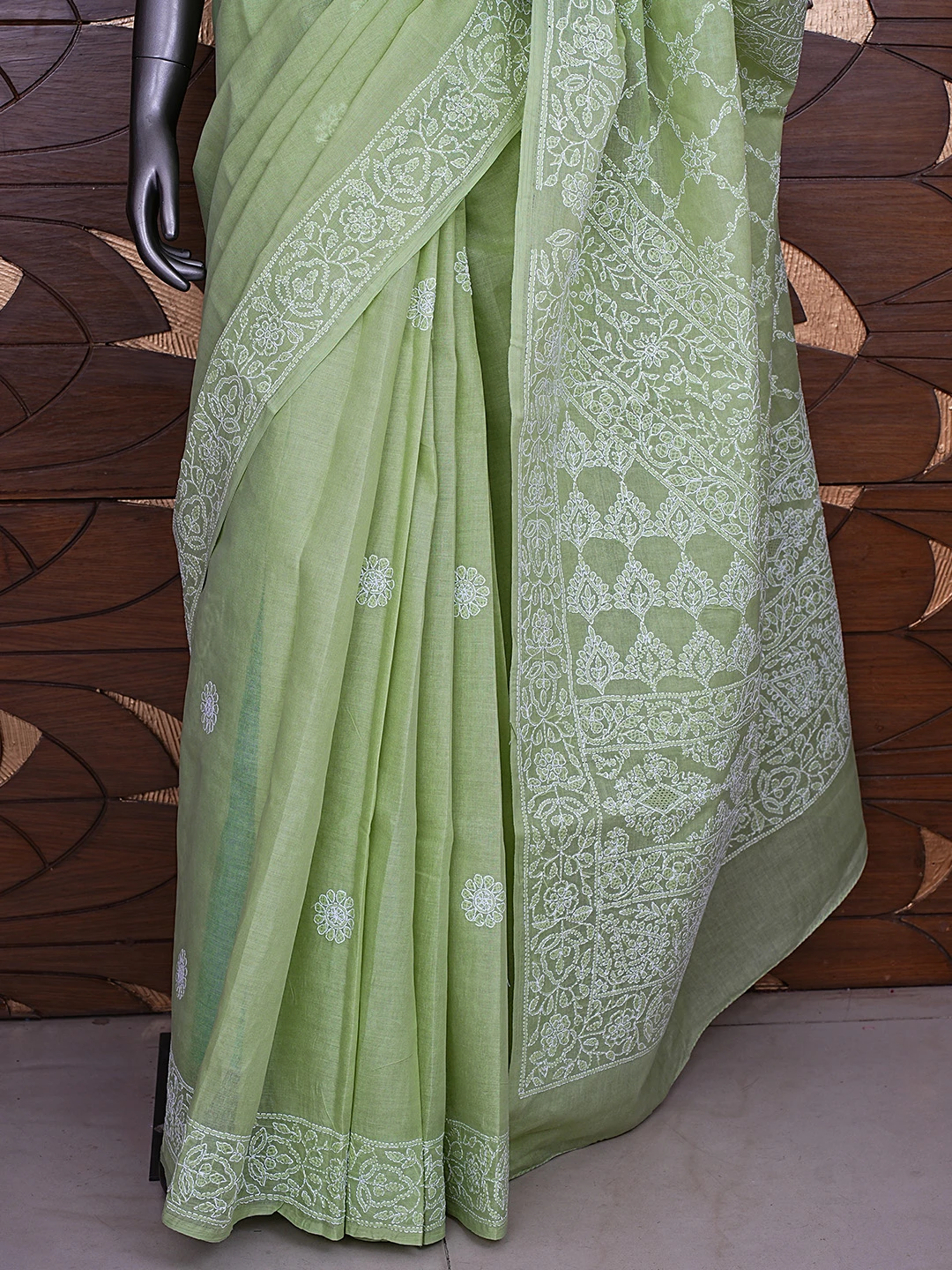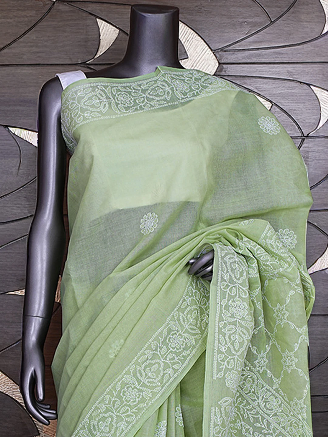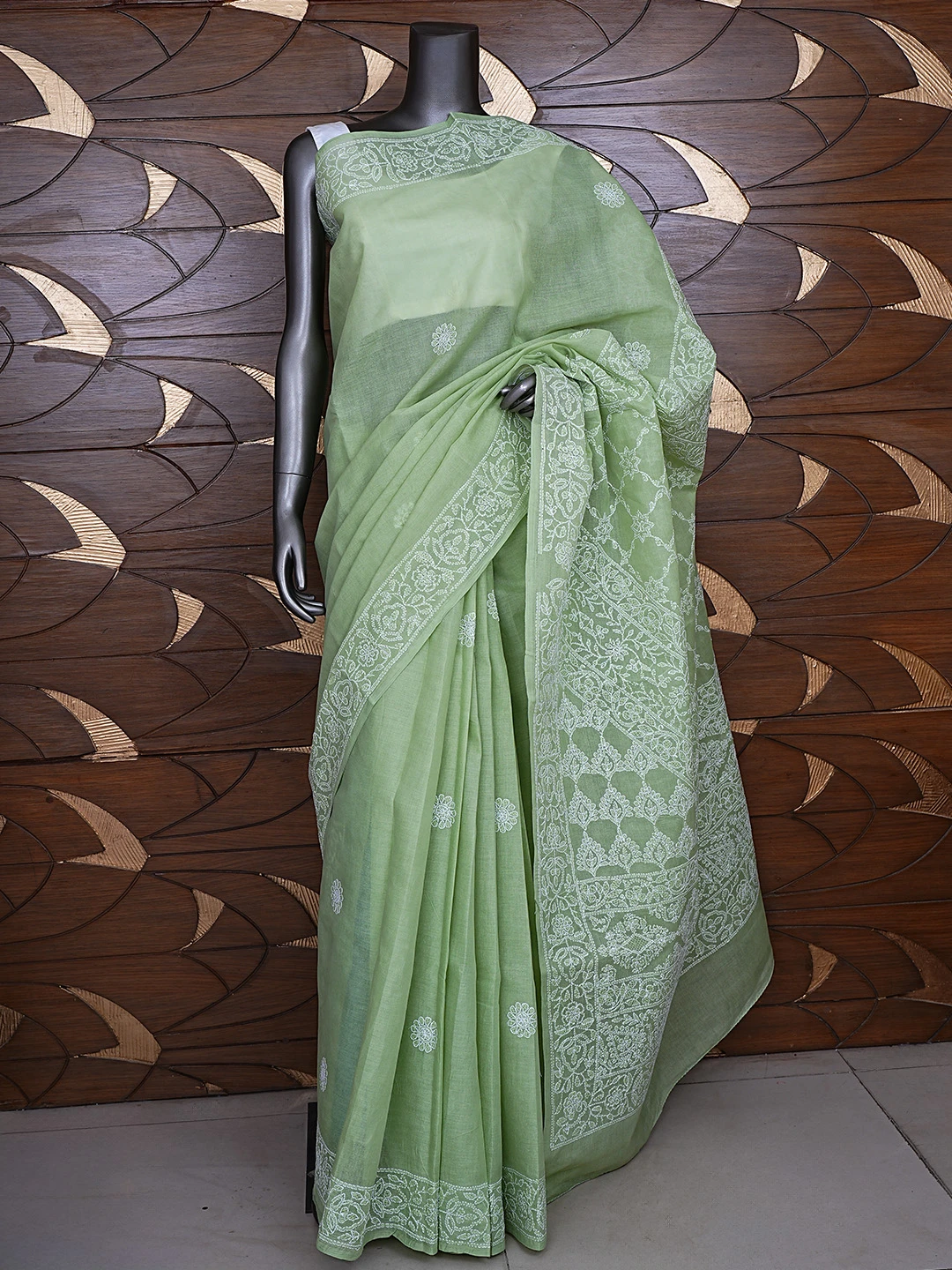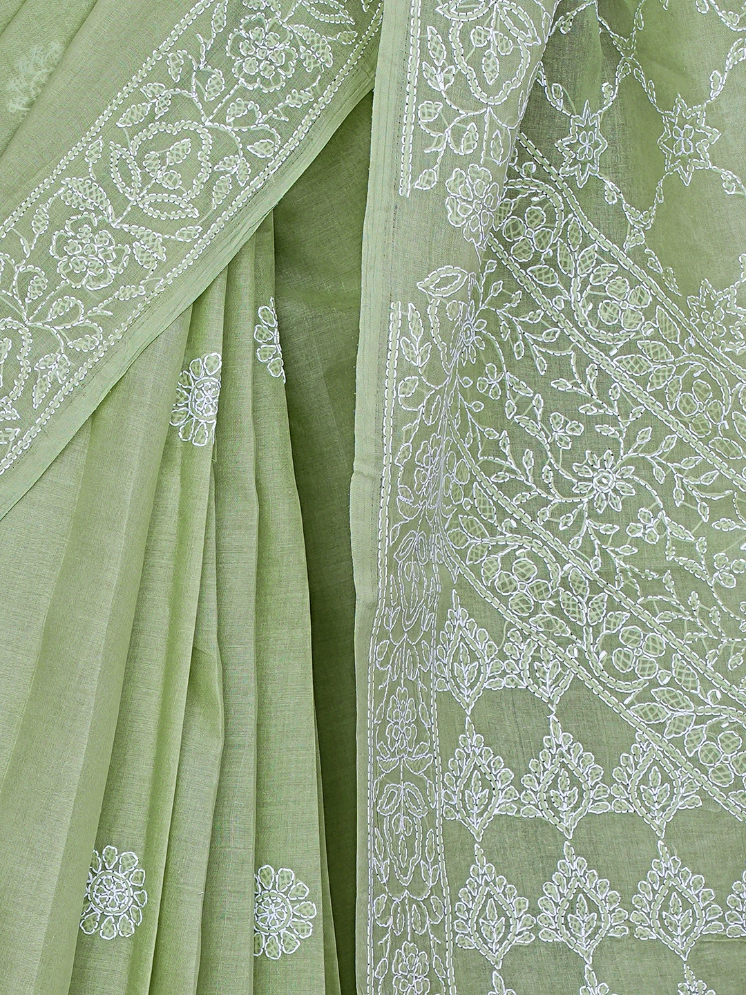 Ada Hand Embroidered Green Cotton Lucknowi Chikankari Saree With Blouse 01A872936