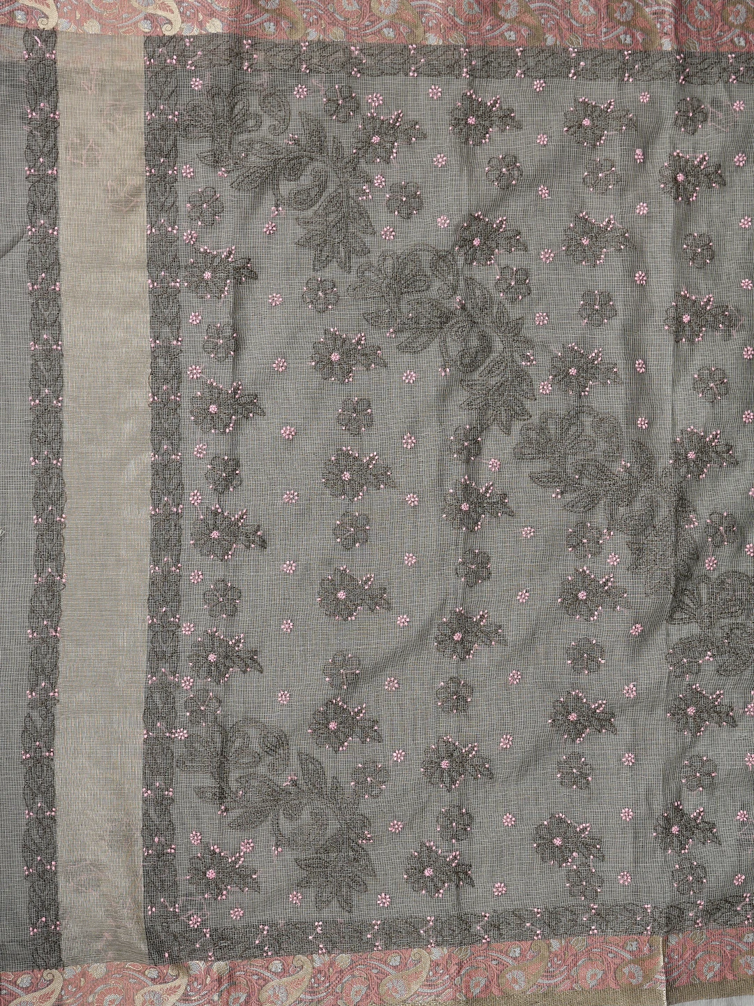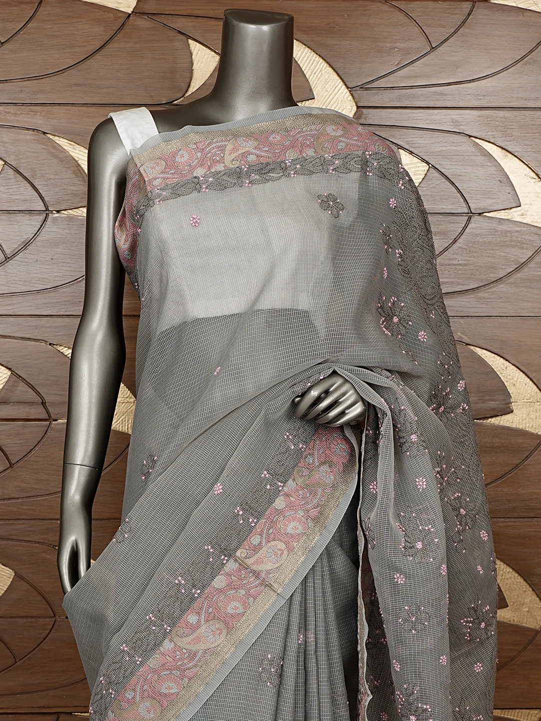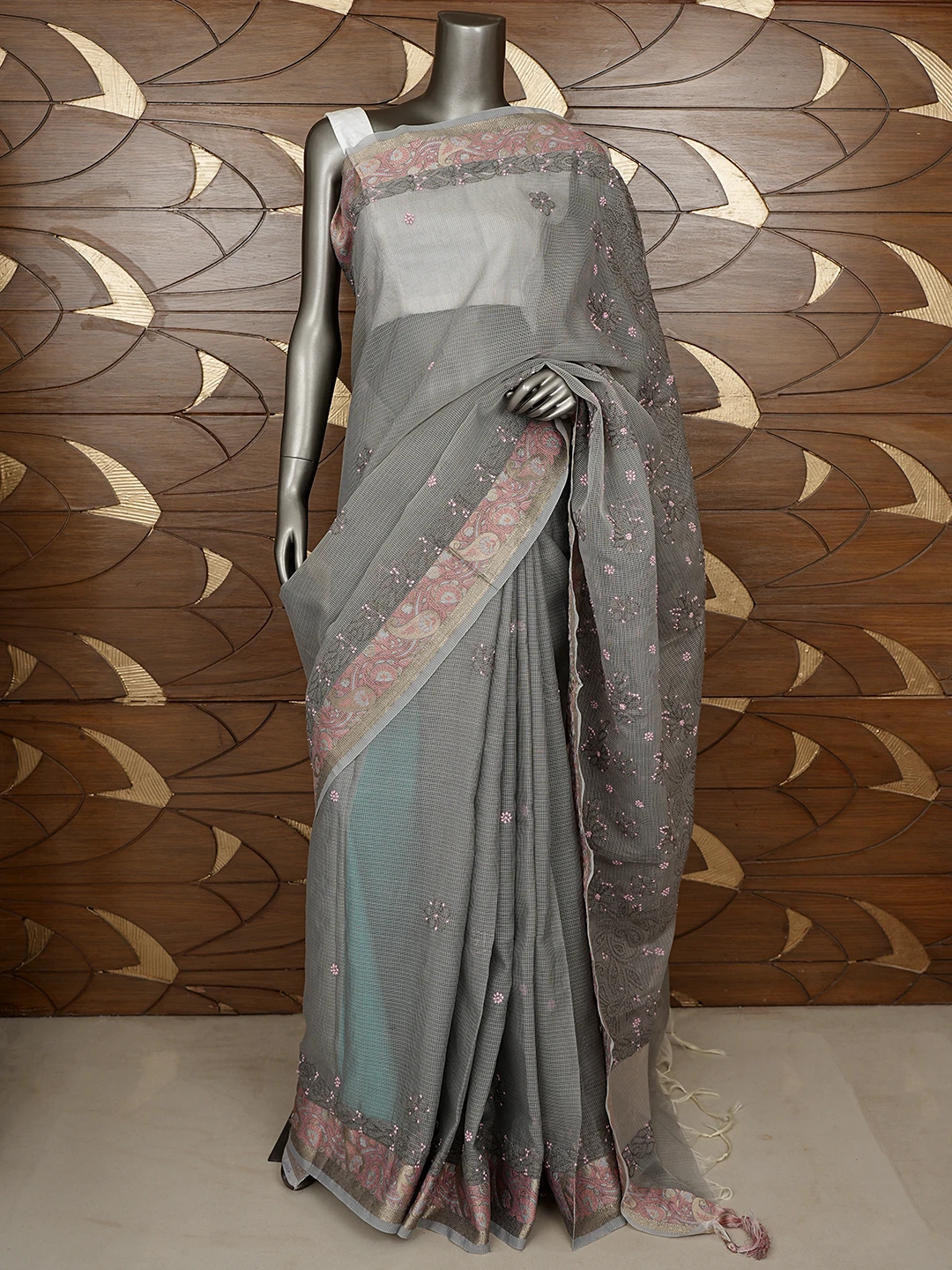 Ada Hand Embroidered Grey Chanderi Lucknowi Chikankari Saree With Blouse 01A877302