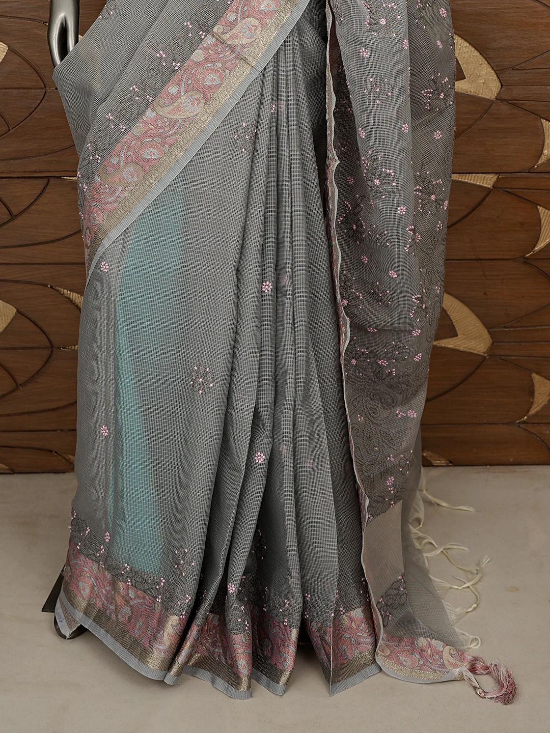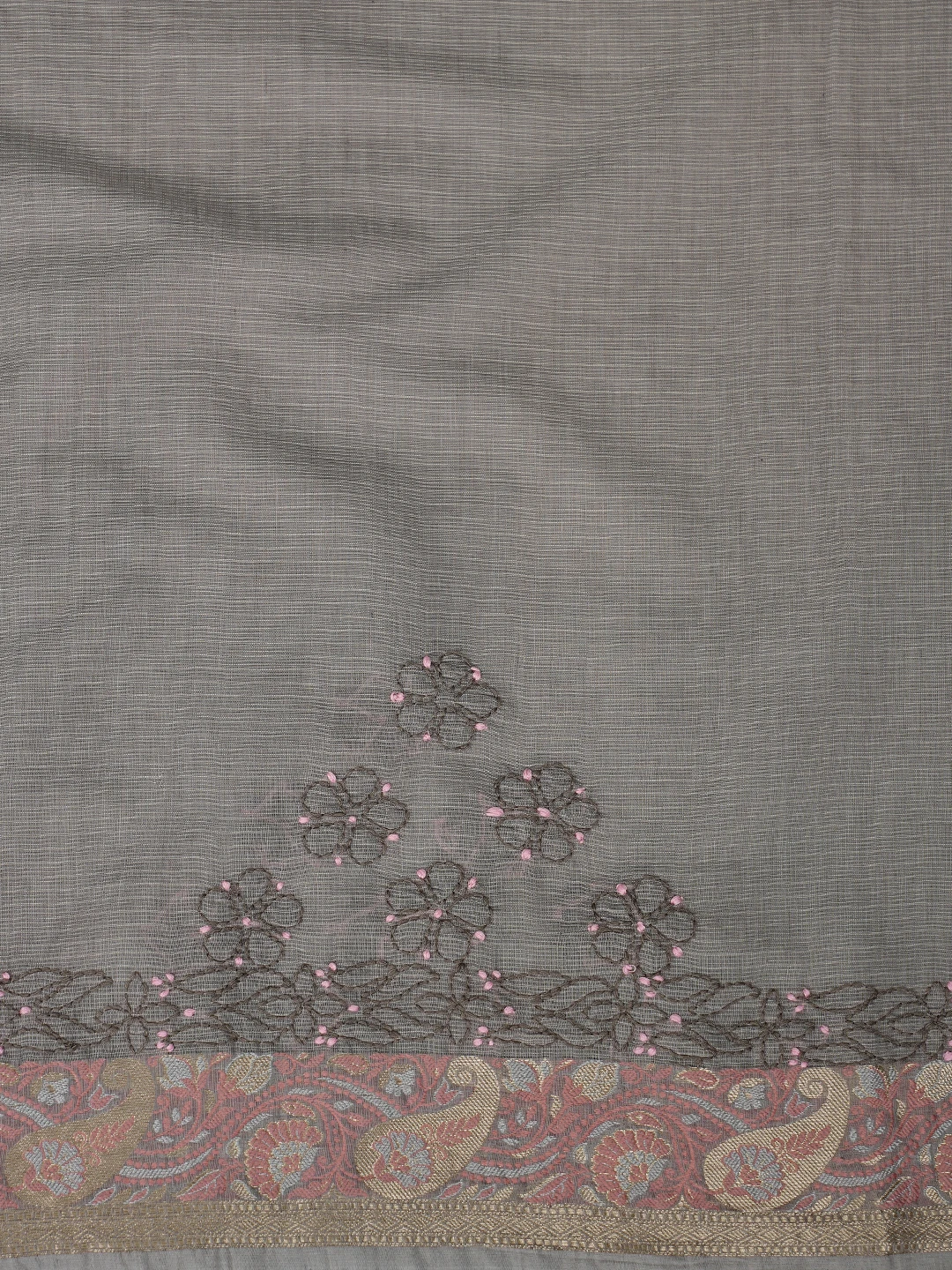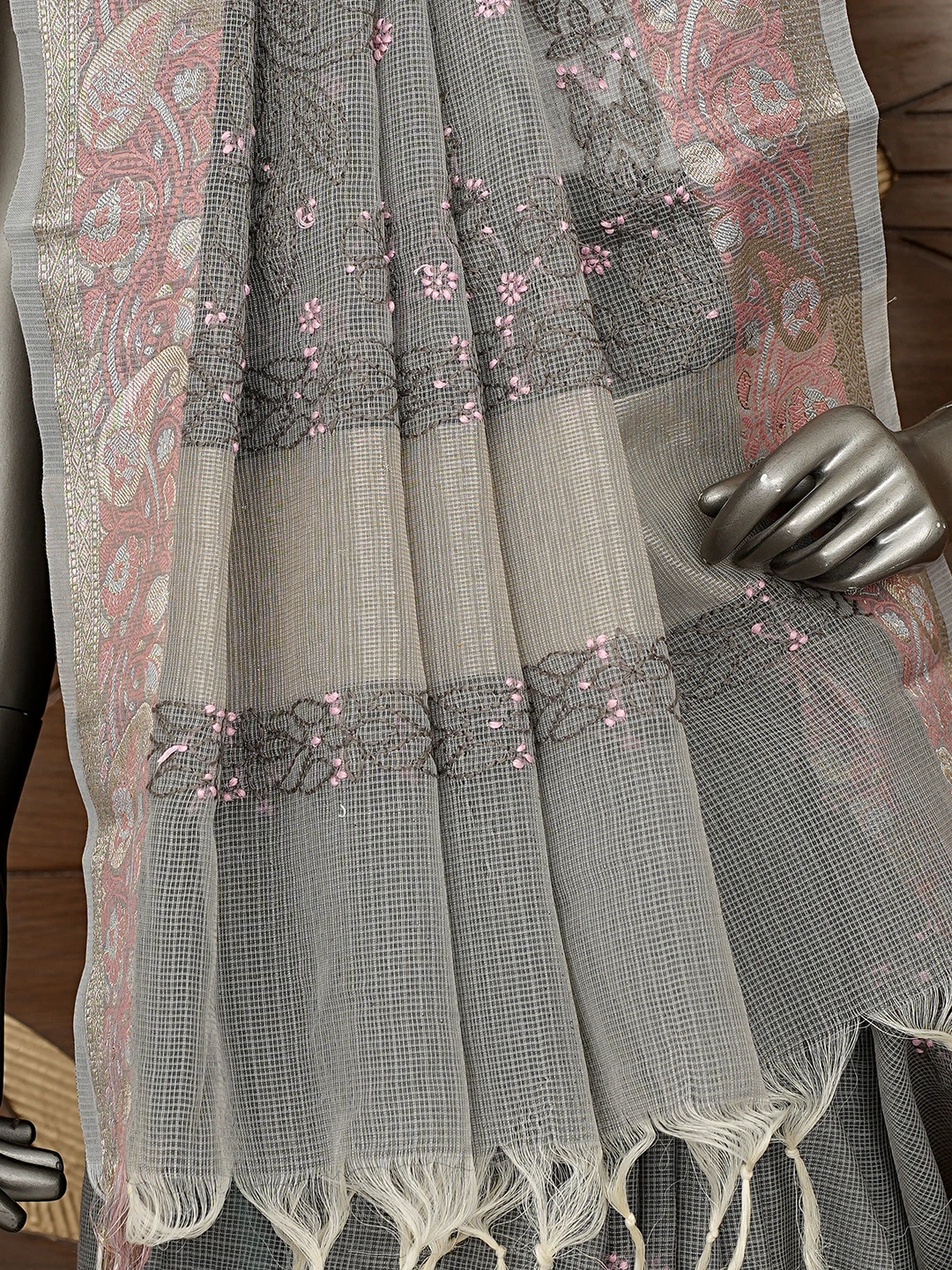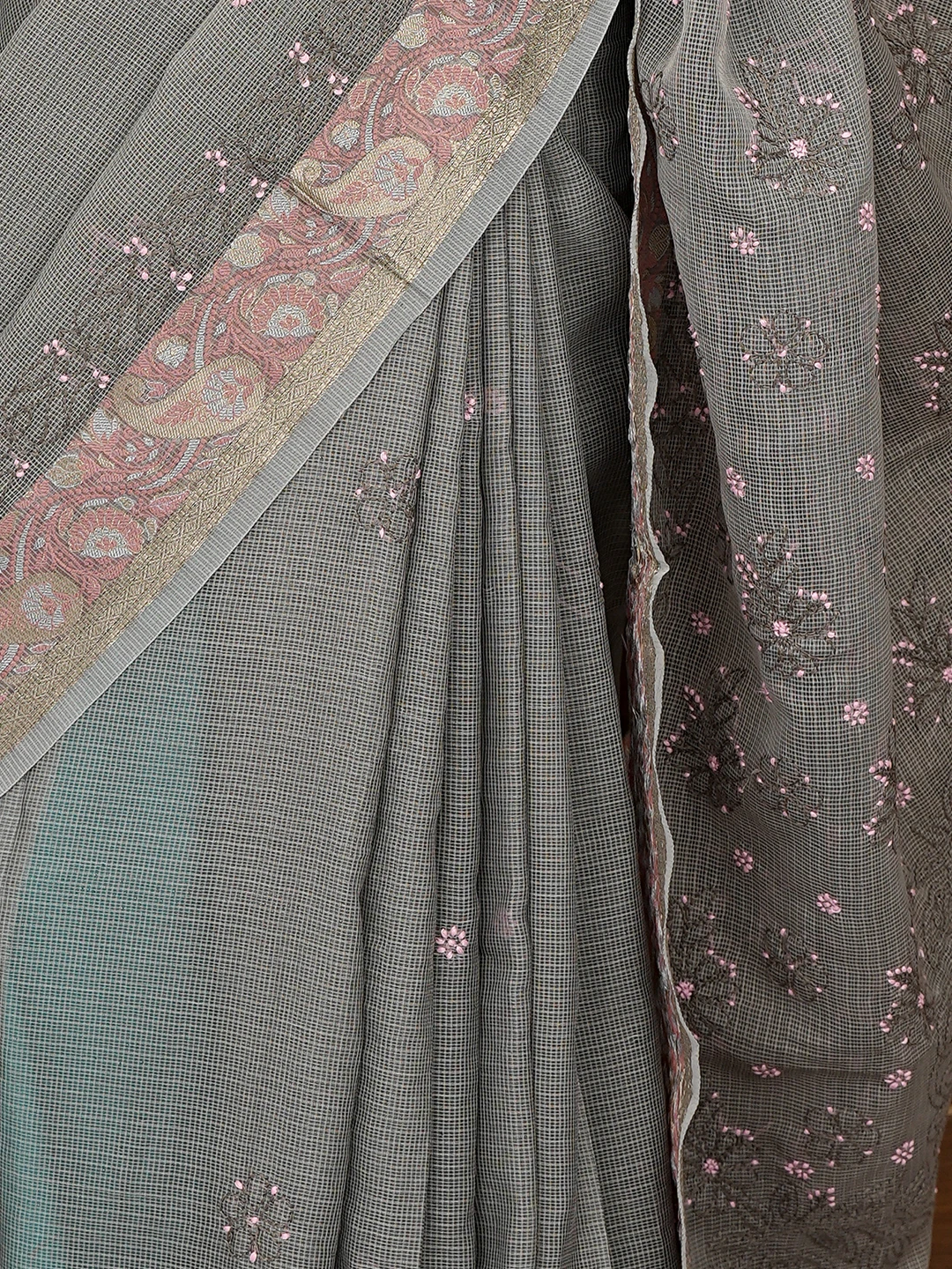 Ada Hand Embroidered Grey Chanderi Lucknowi Chikankari Saree With Blouse 01A877302
