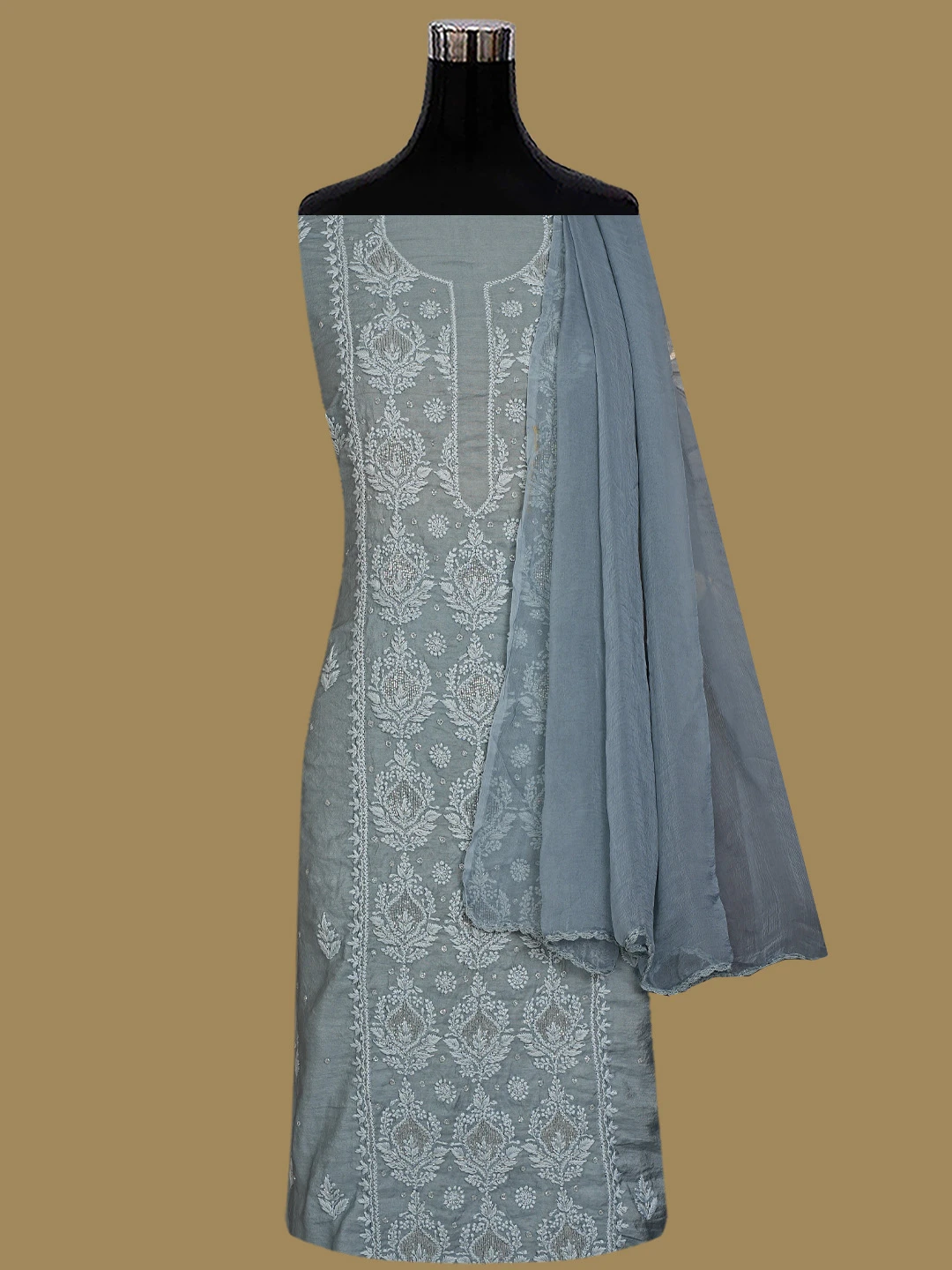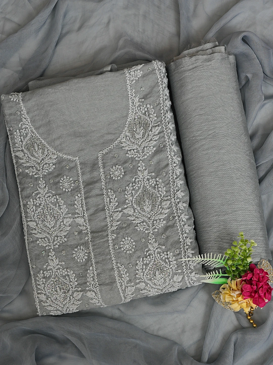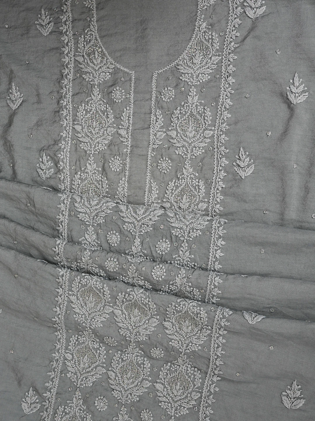Ada Hand Embroidered Grey Chanderi Lucknowi Chikankari Unstitched Suit Piece With Cutdana Work 01A788693