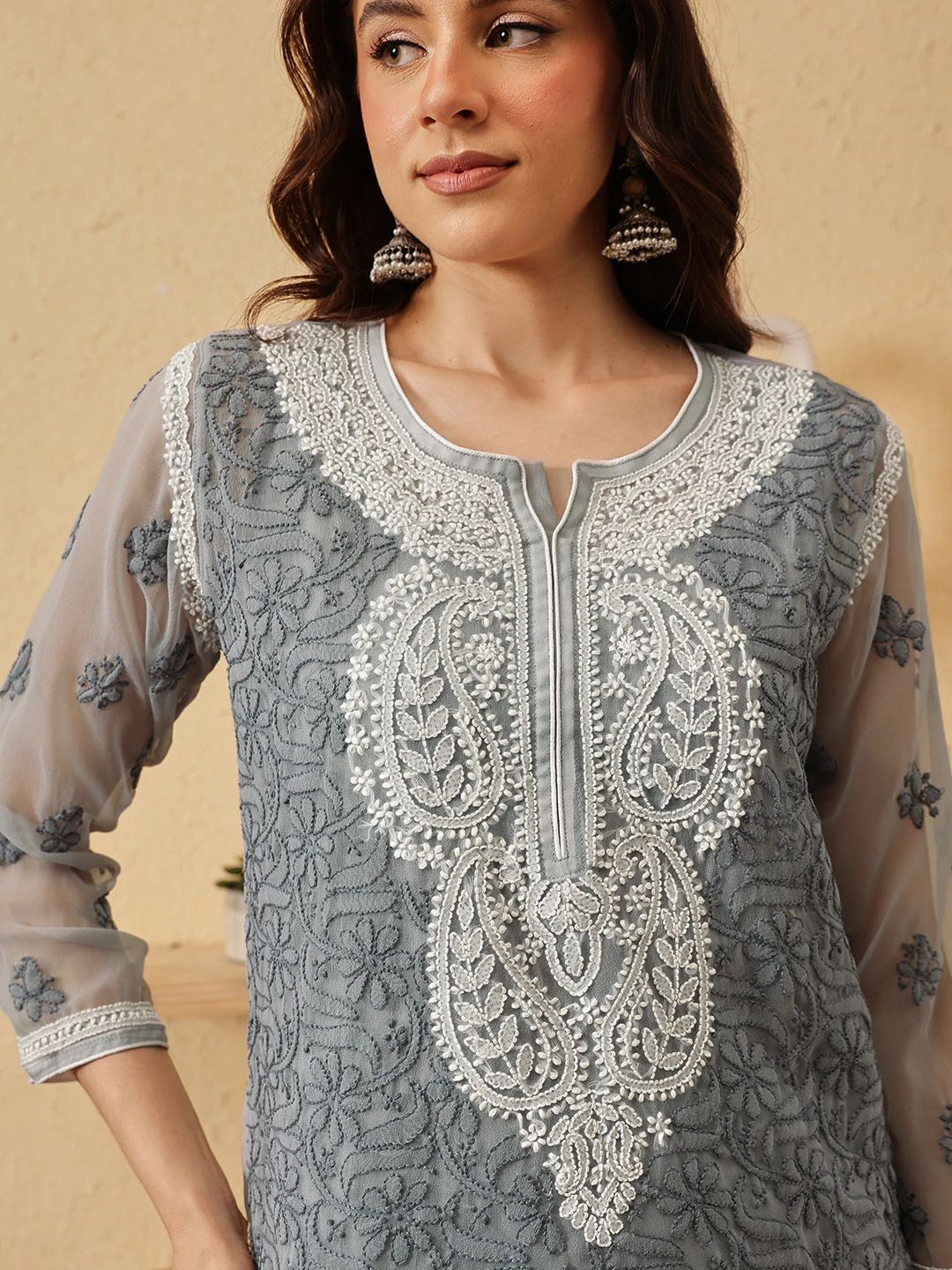 Ada Hand Embroidered Grey Georgette Lucknowi Chikankari Kurti With Slip A911200
