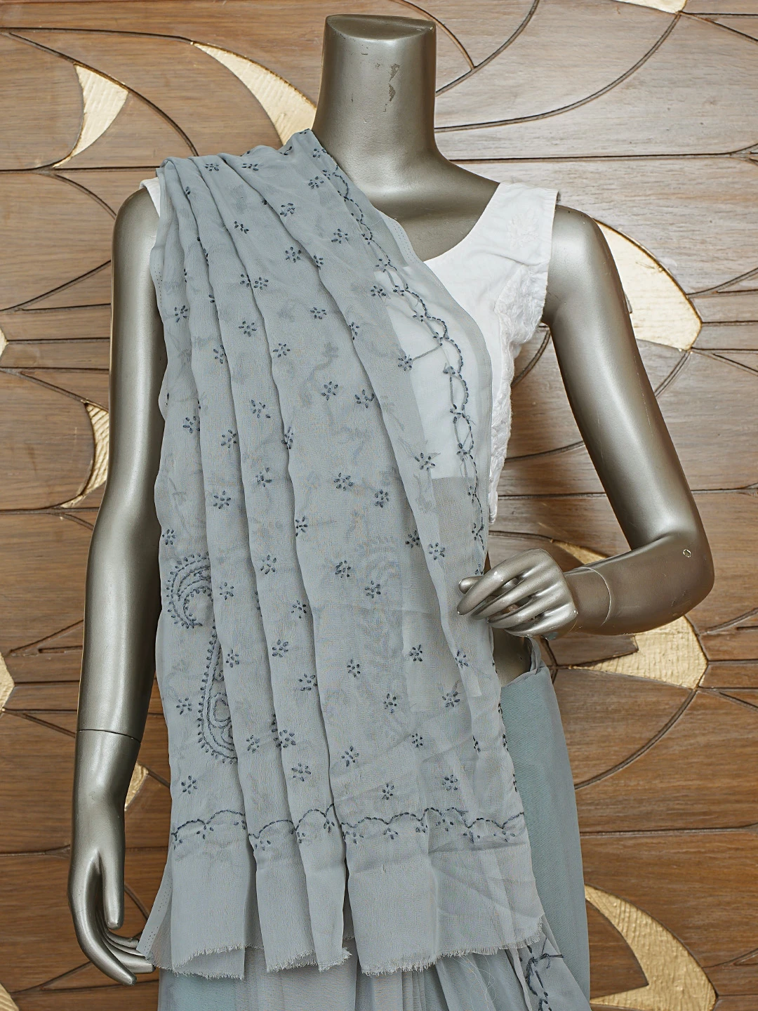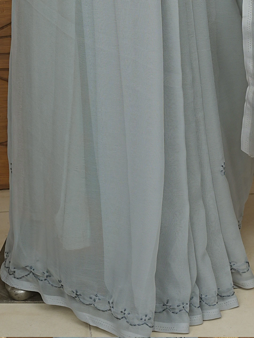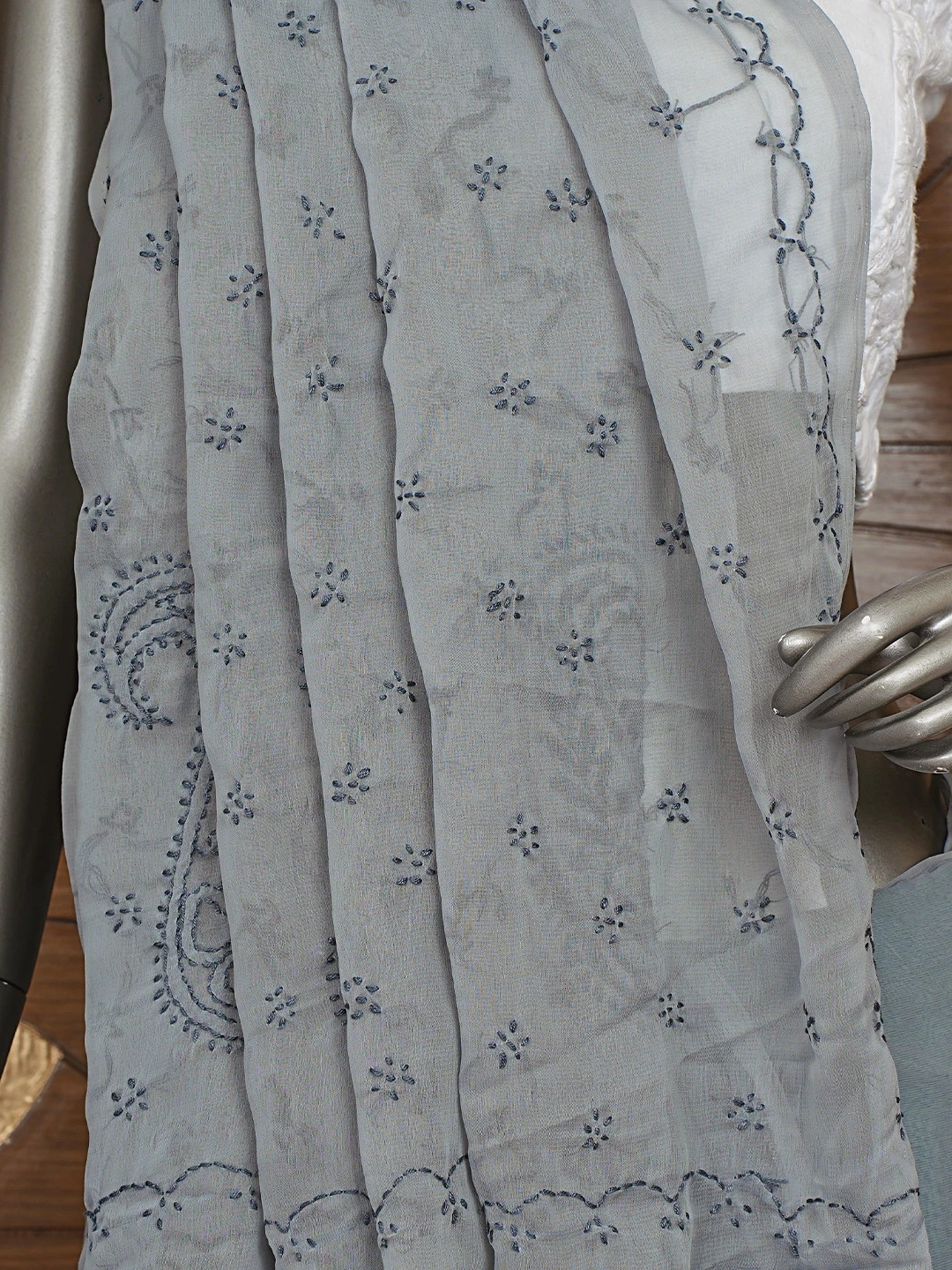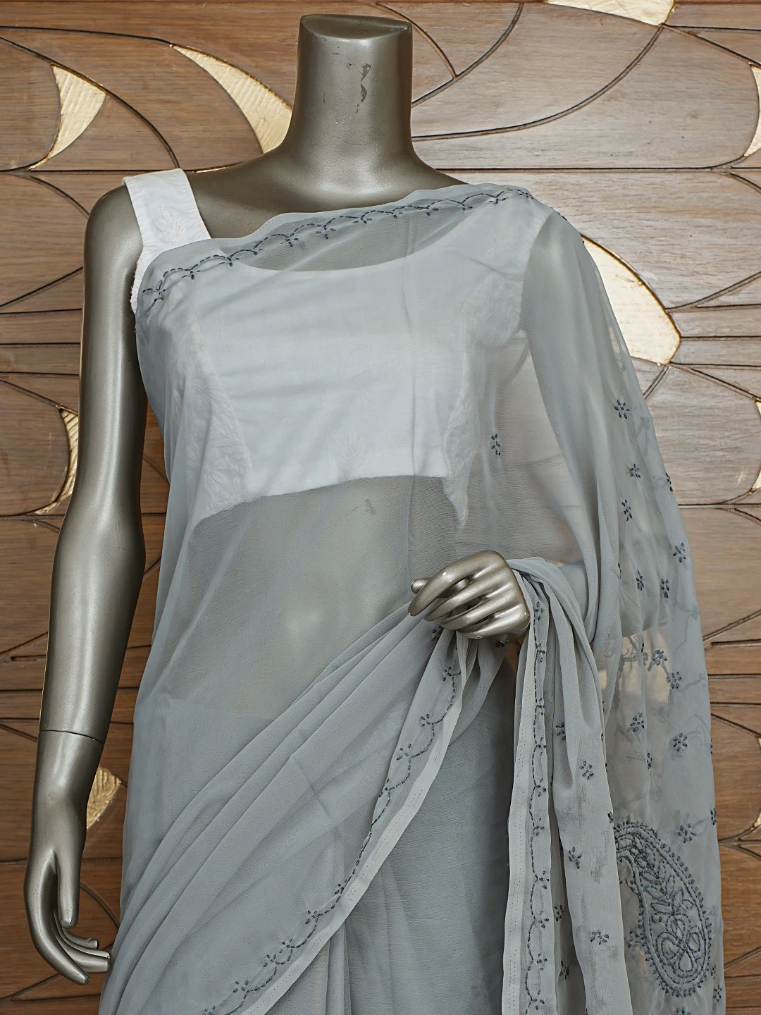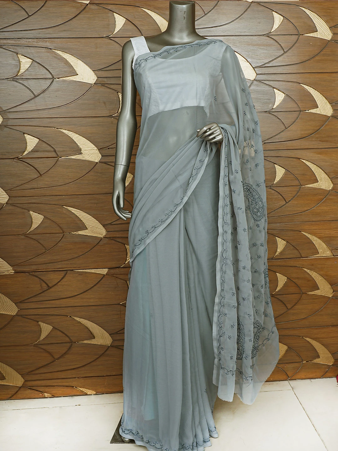 Ada Hand Embroidered Grey Georgette Lucknowi Chikankari Saree With Blouse 01A853721