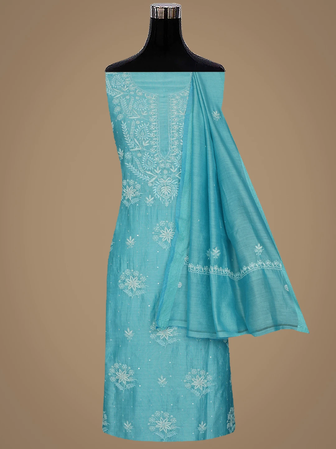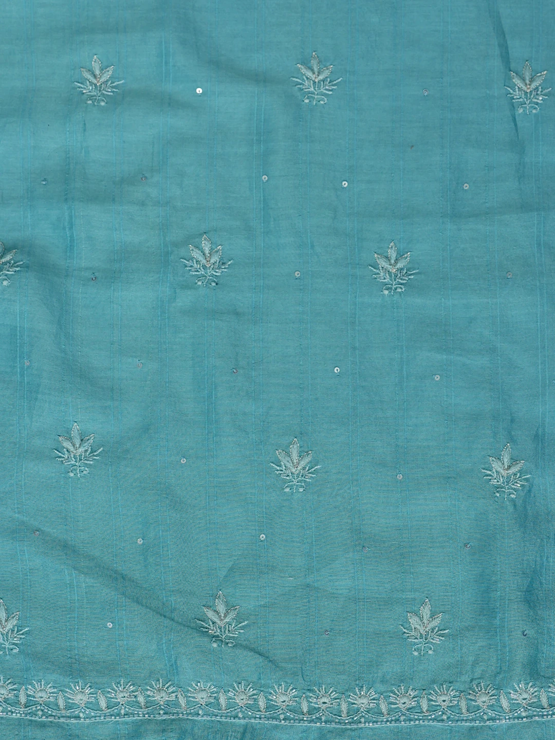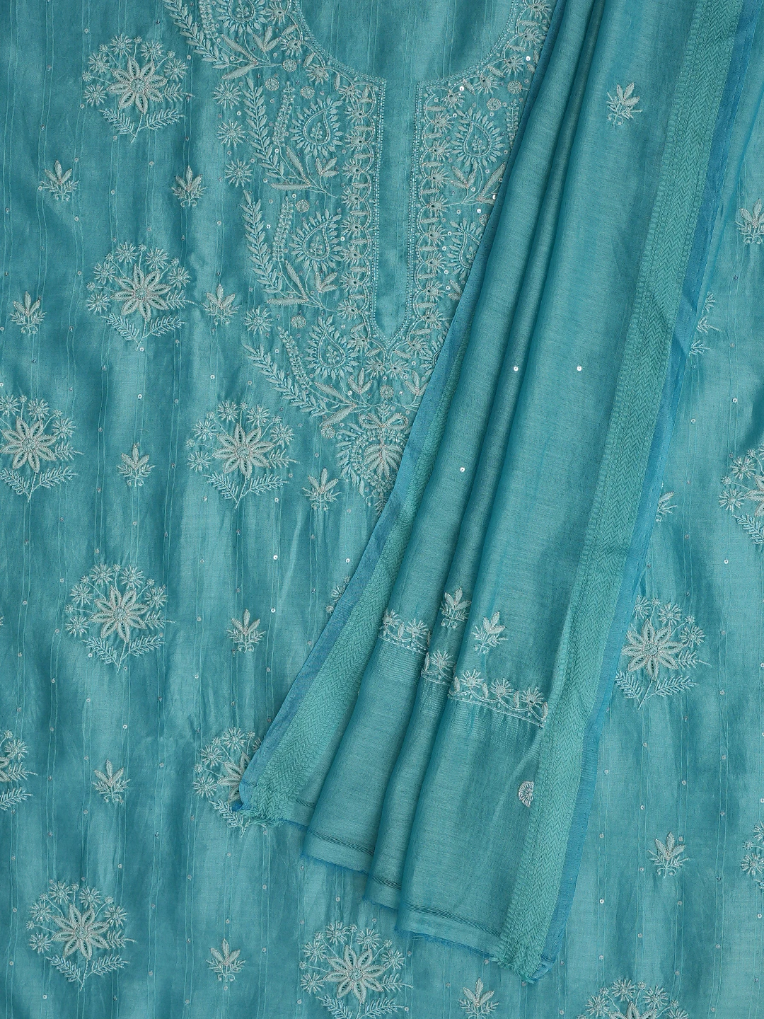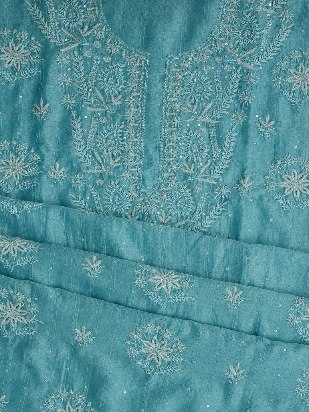 Ada Hand Embroidered Keppel Turquoise Chanderi Lucknowi Chikankari Unstitched Kurta Dupatta Set With Sequinned Work 01A776464