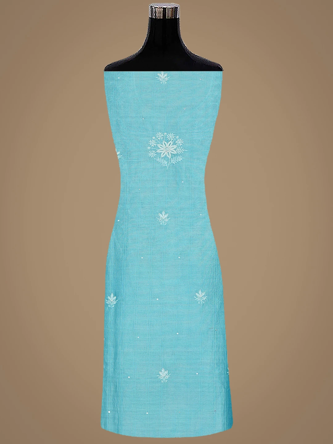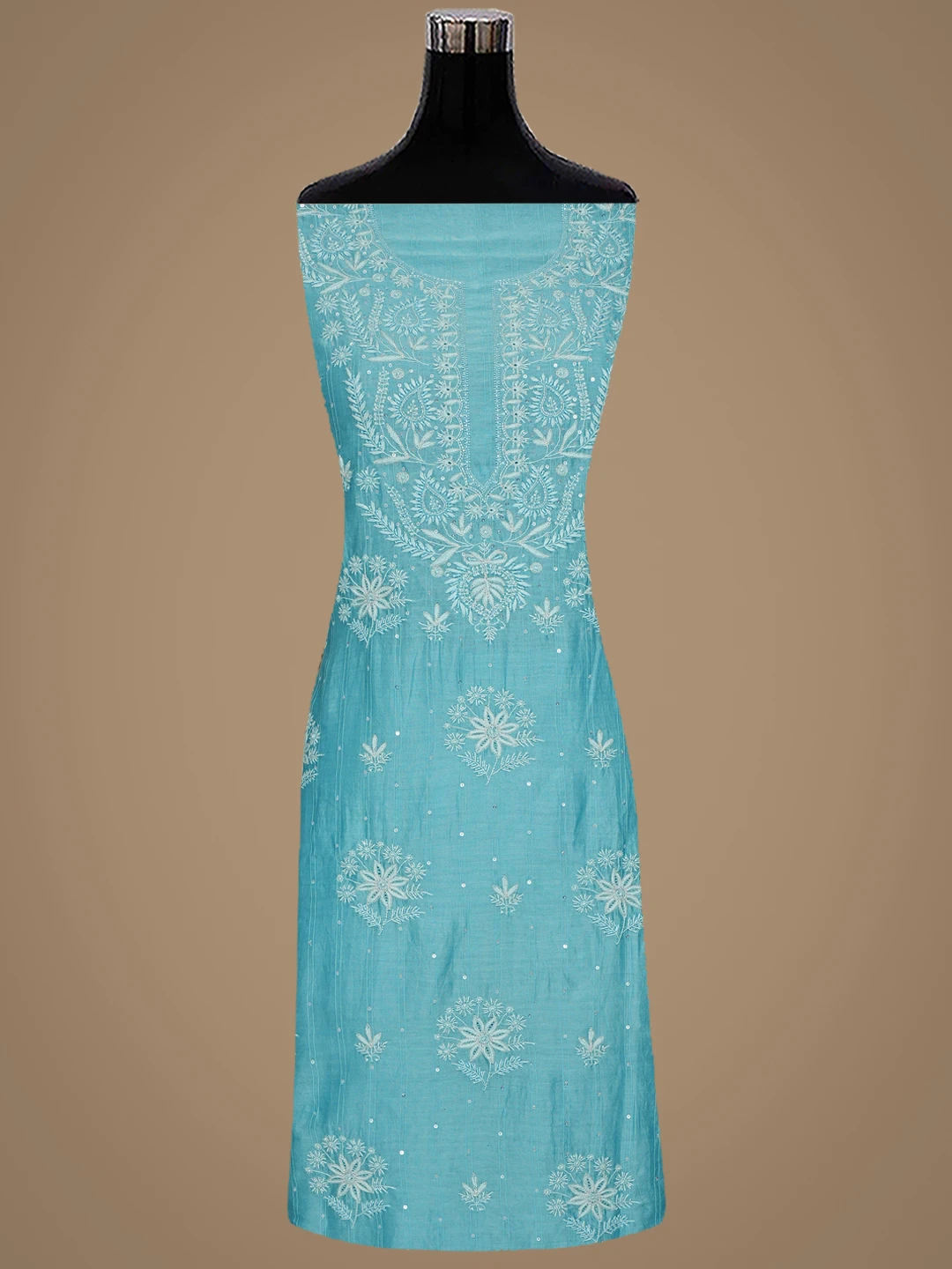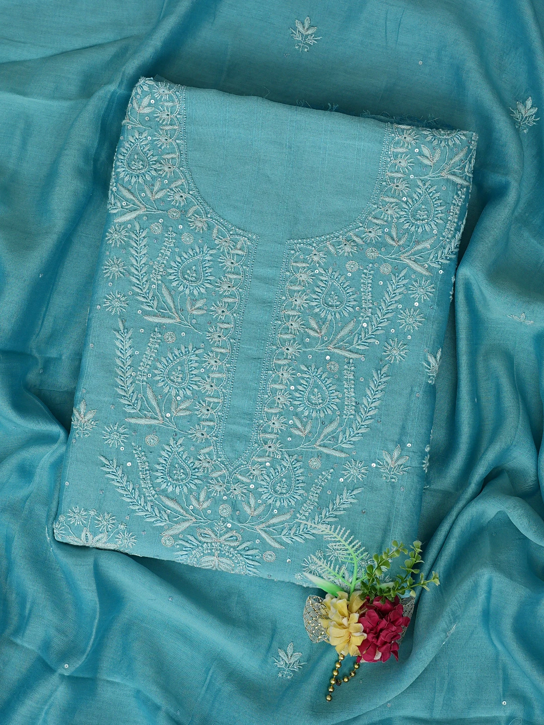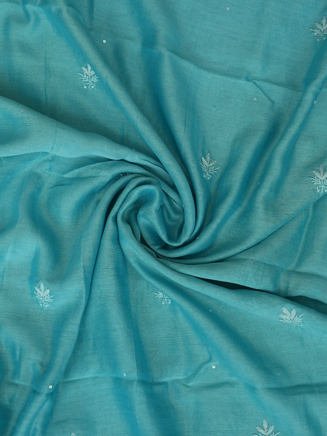 Ada Hand Embroidered Keppel Turquoise Chanderi Lucknowi Chikankari Unstitched Kurta Dupatta Set With Sequinned Work 01A776464
