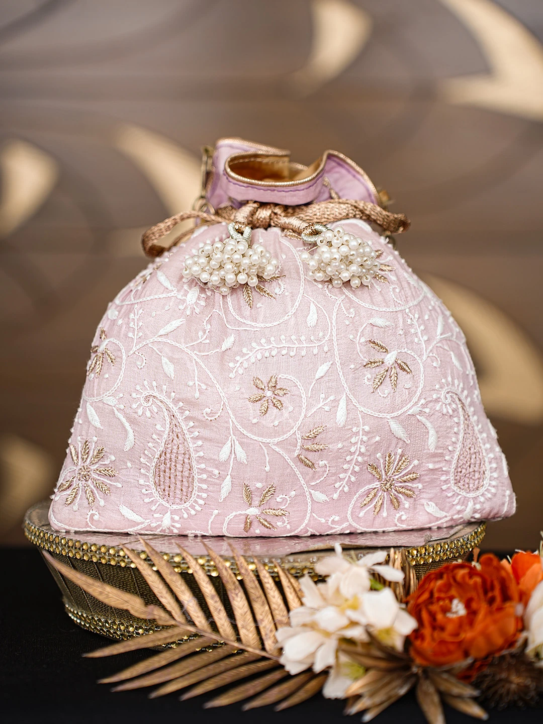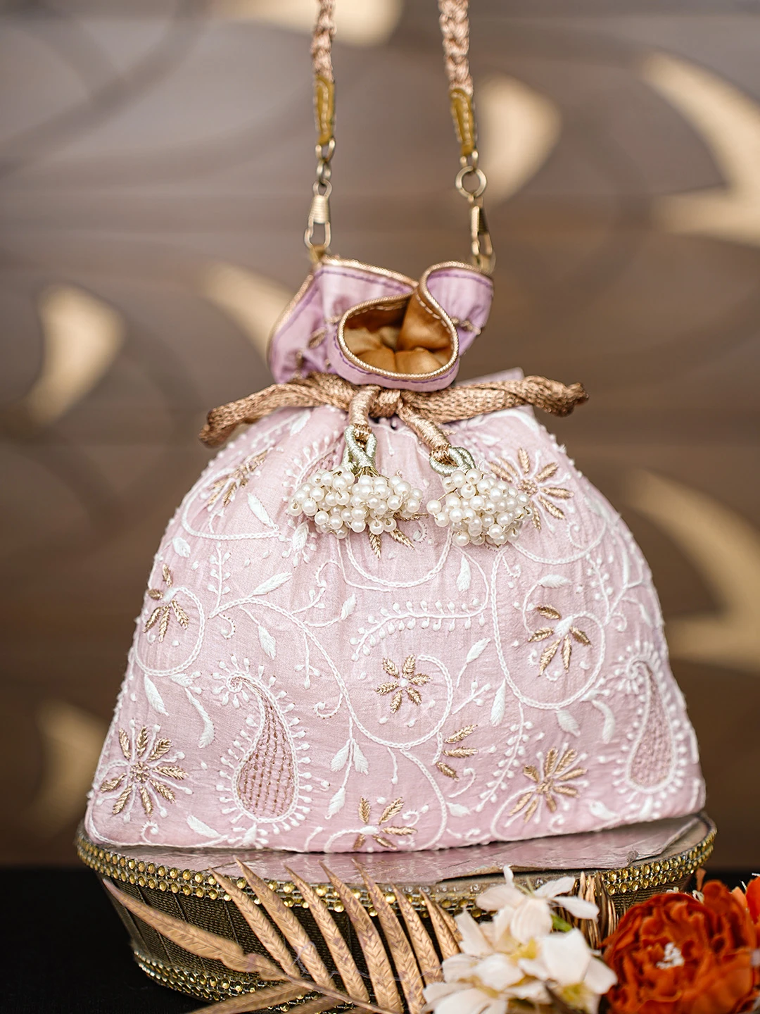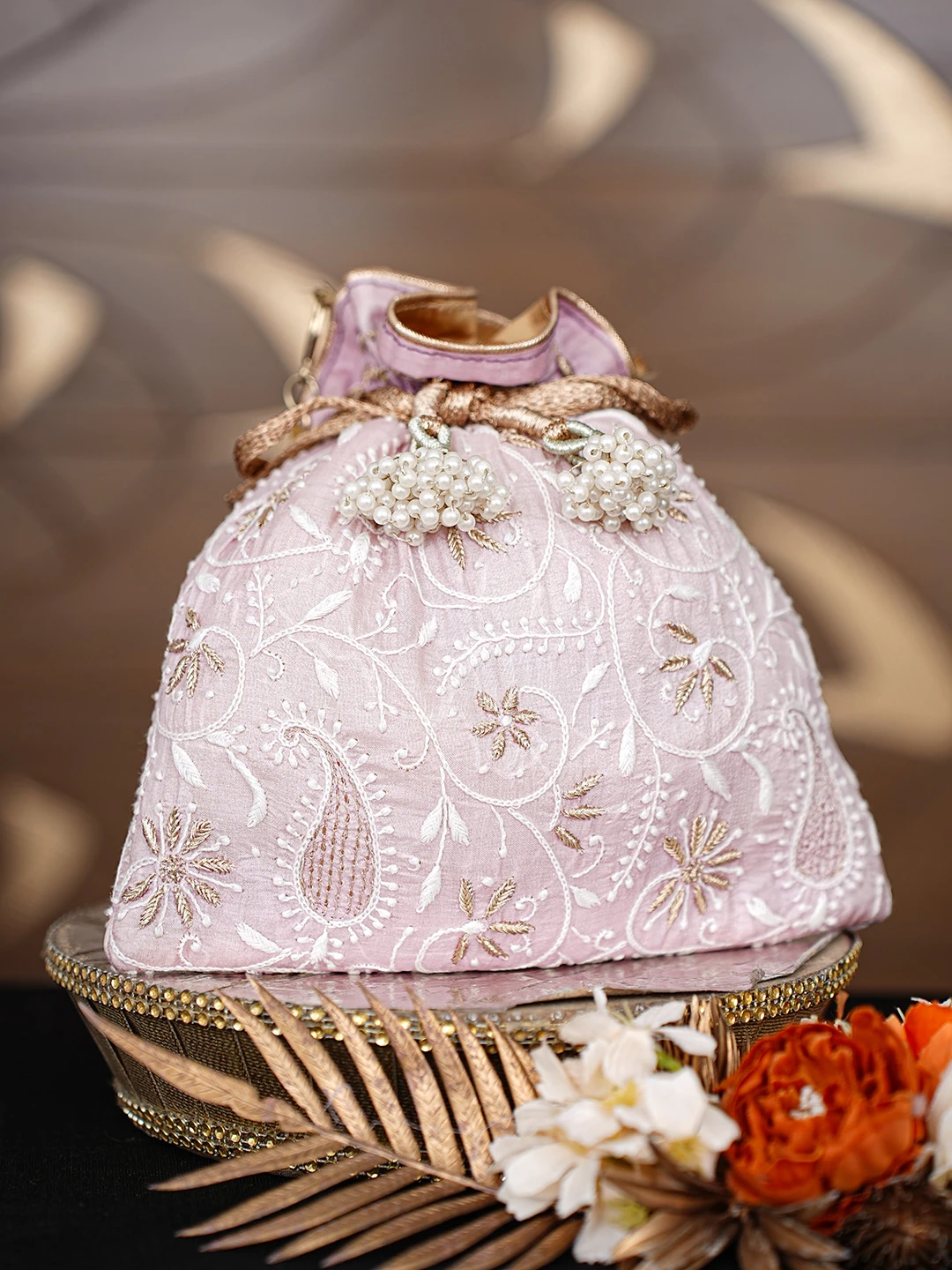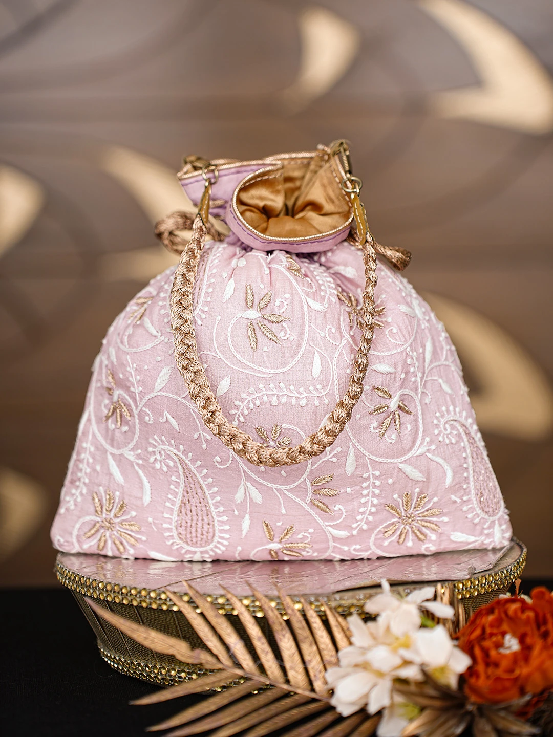 Ada Hand Embroidered Lavender Silk Lucknowi Chikankari Potli Bag With Zari Work 01A621544