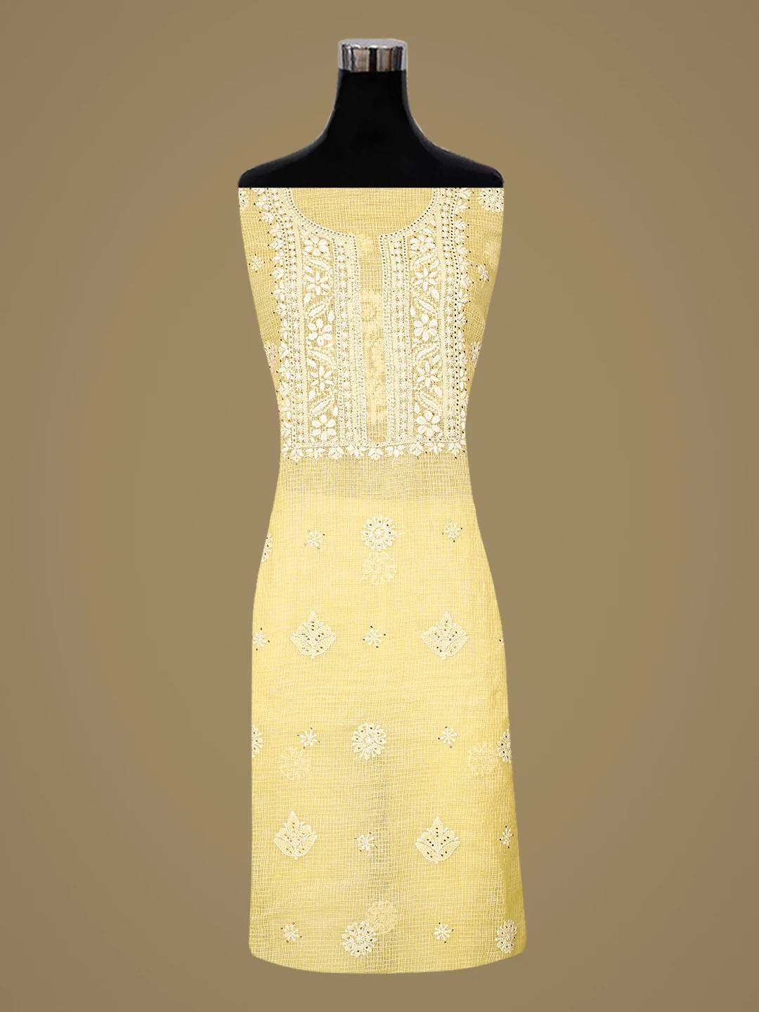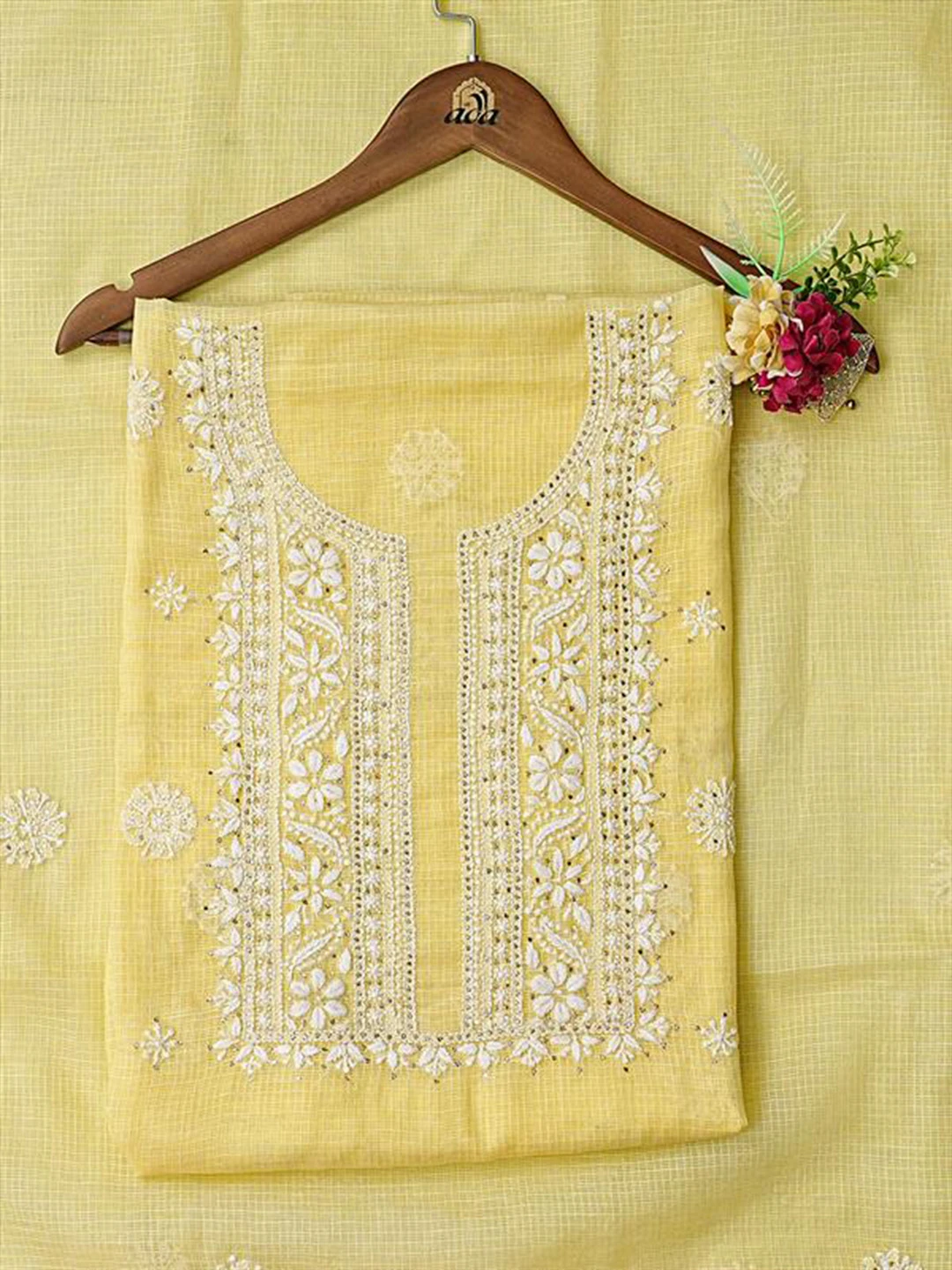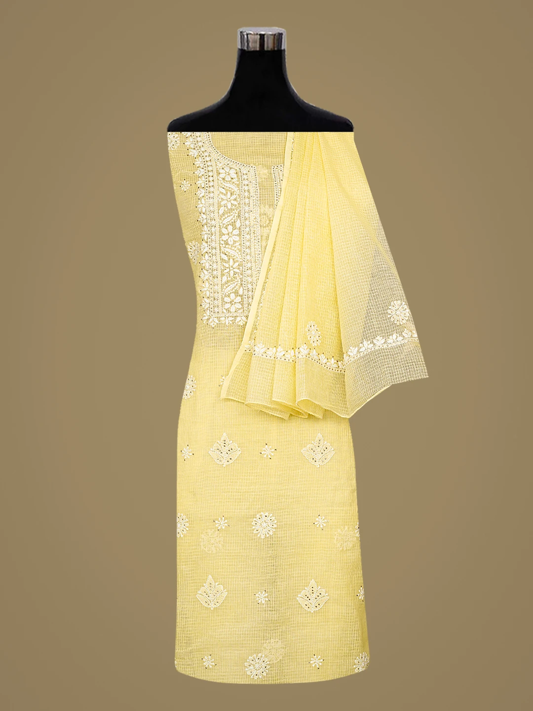 Ada Hand Embroidered Lemon Kota Lucknowi Chikankari Unstitched Kurta Dupatta Set With Mukaish Work 01A574061