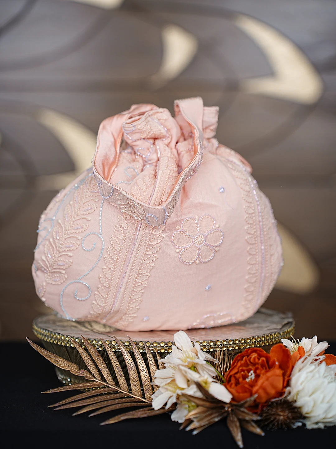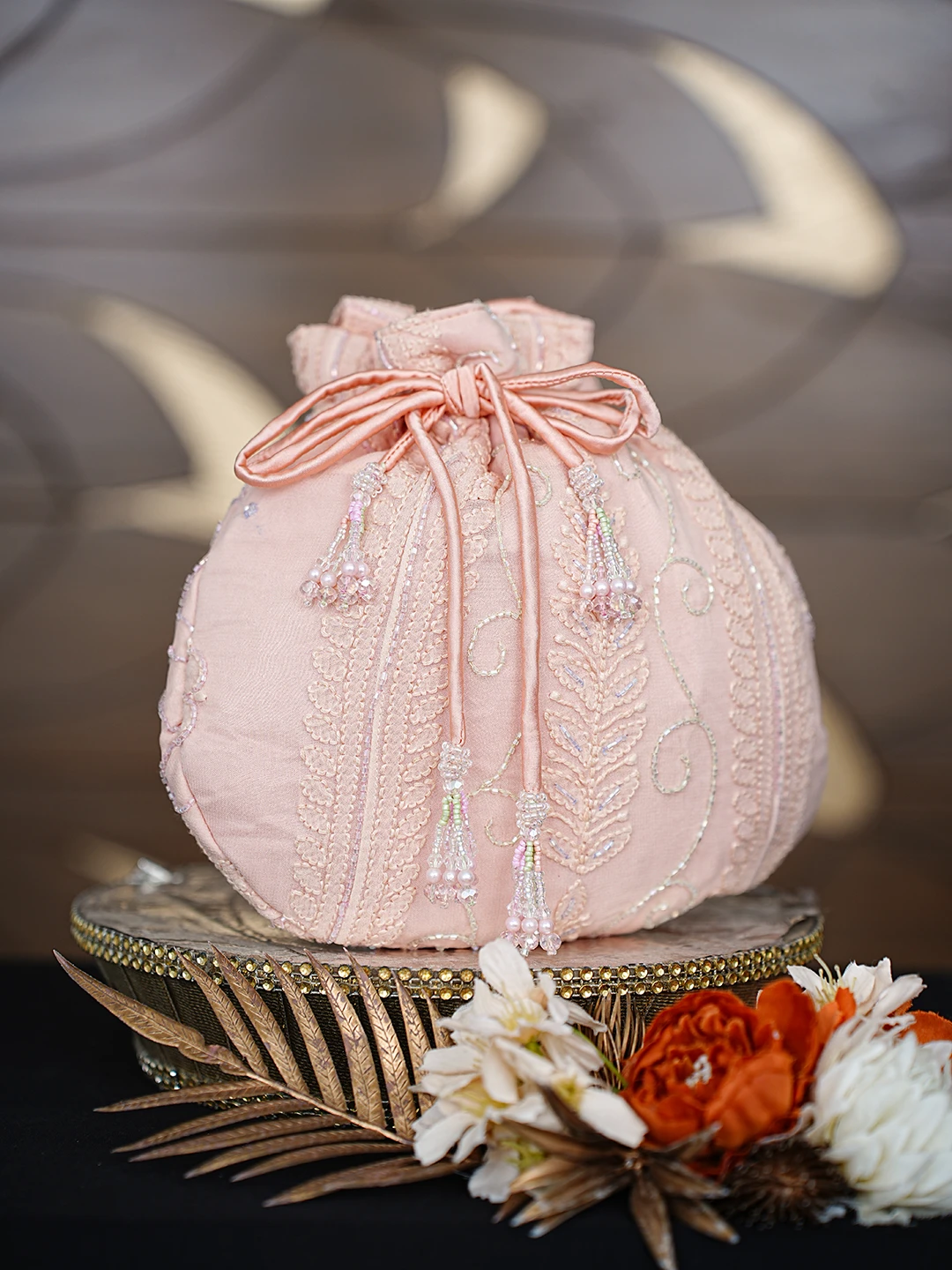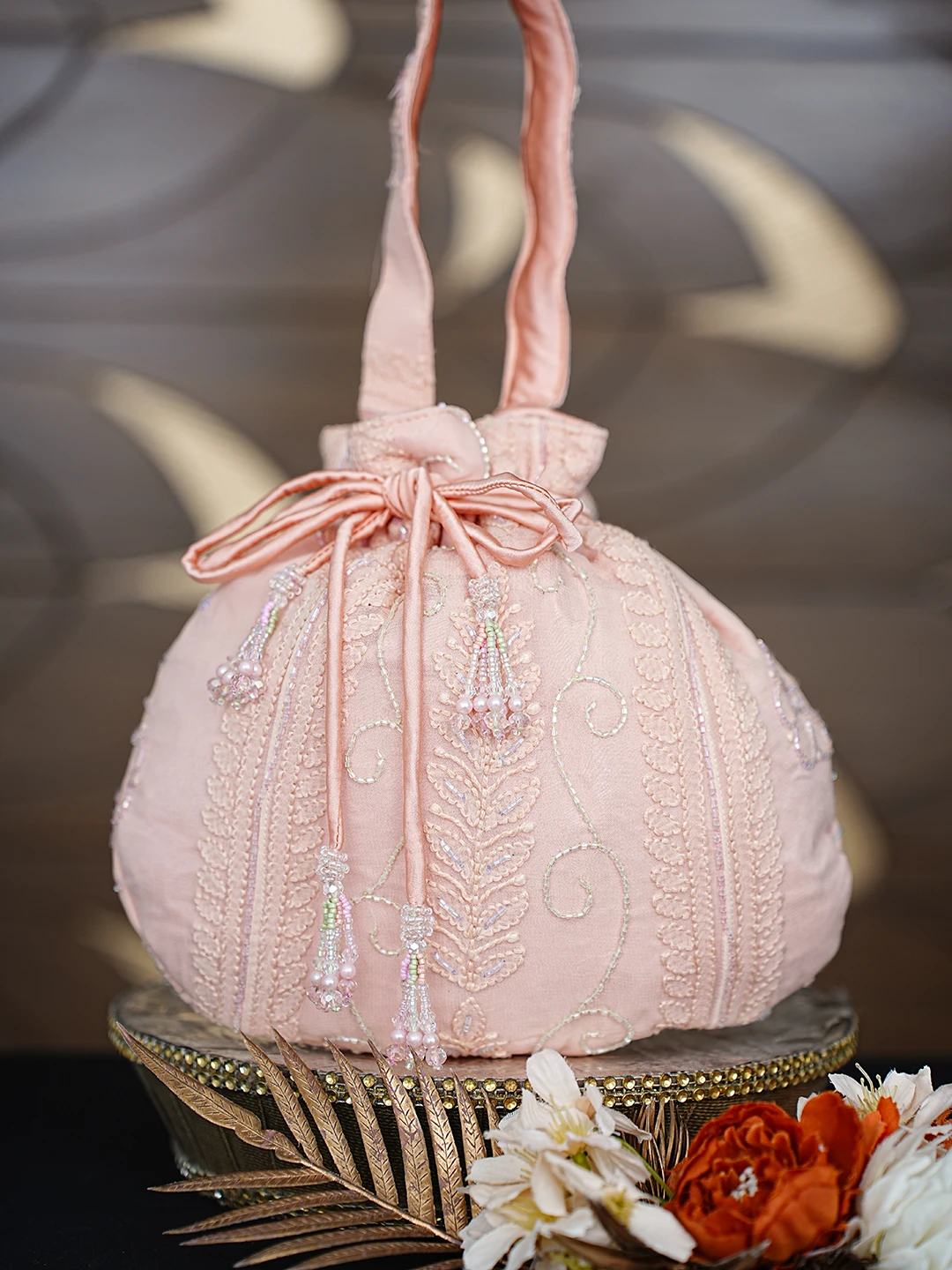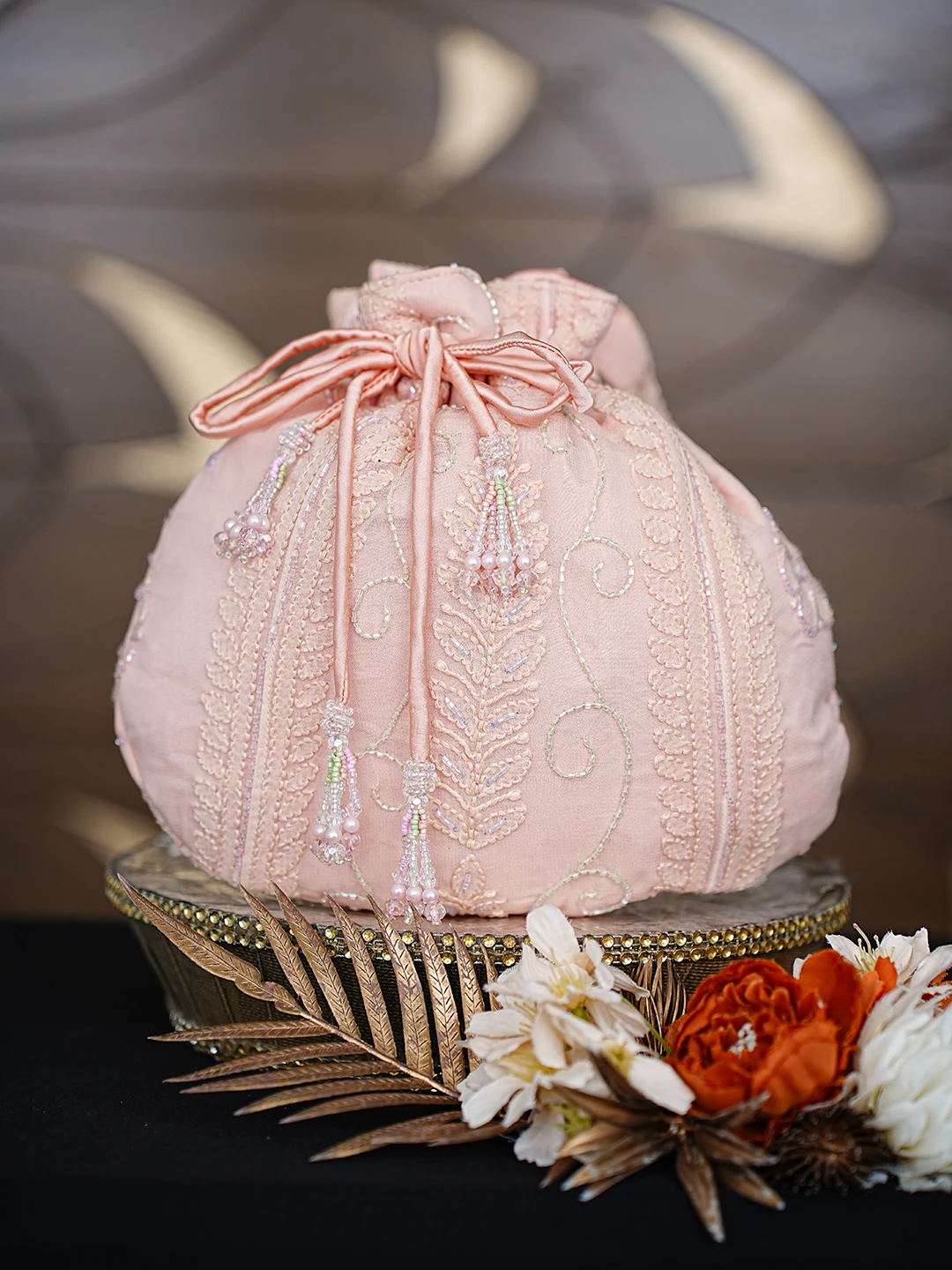 Ada Hand Embroidered Light Peach Faux Georgette Lucknowi Chikankari Potli Bag With Cutdana Work 01A862595