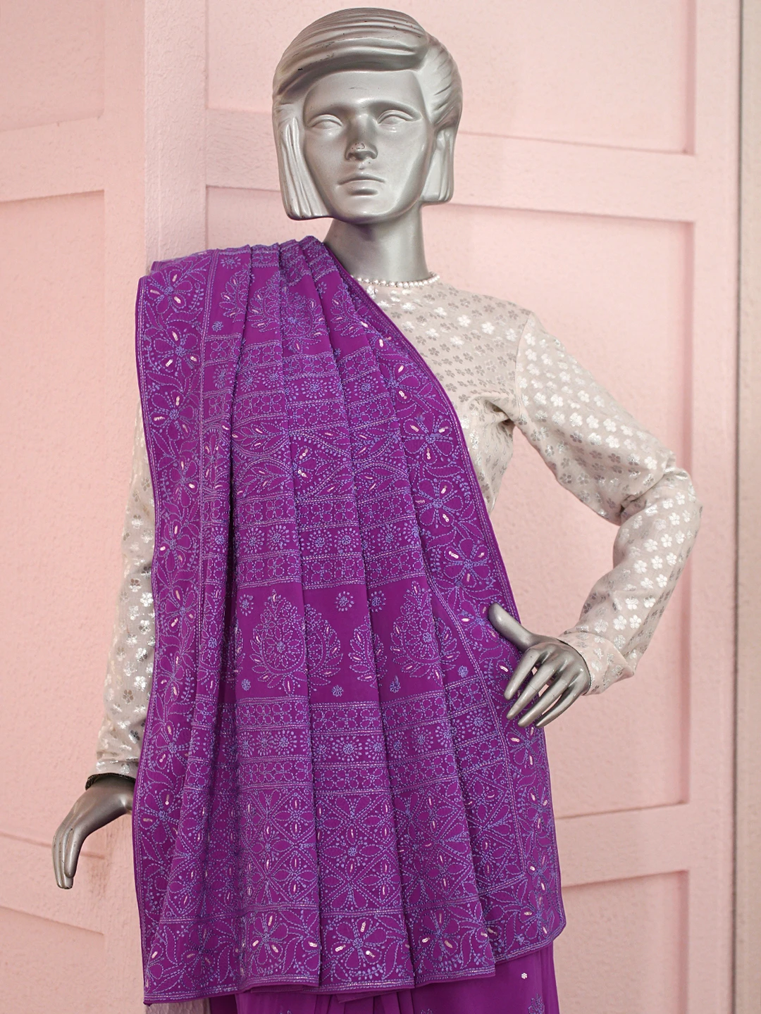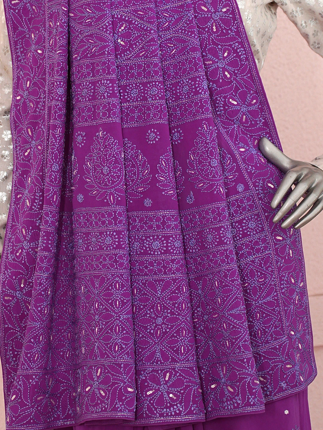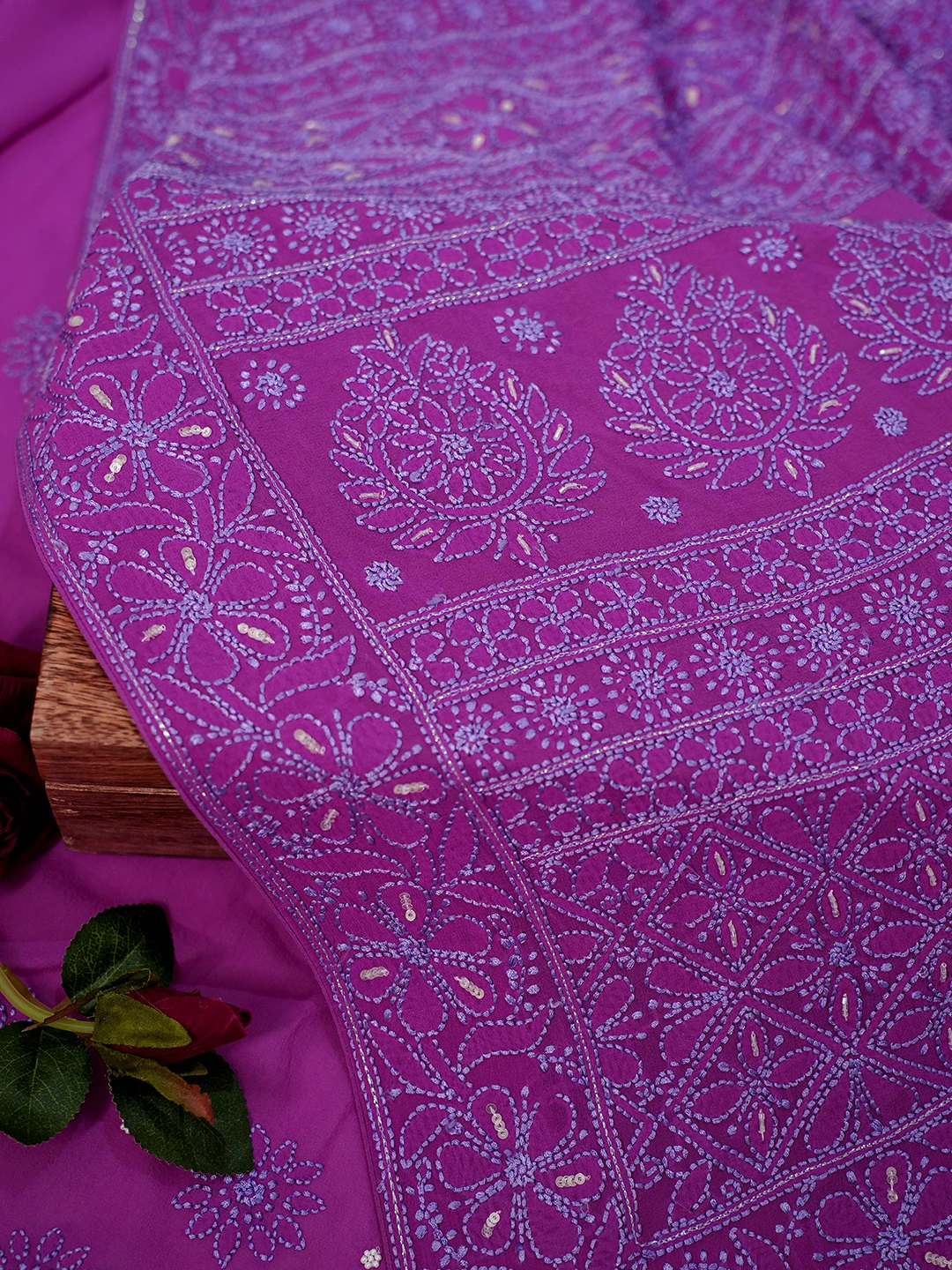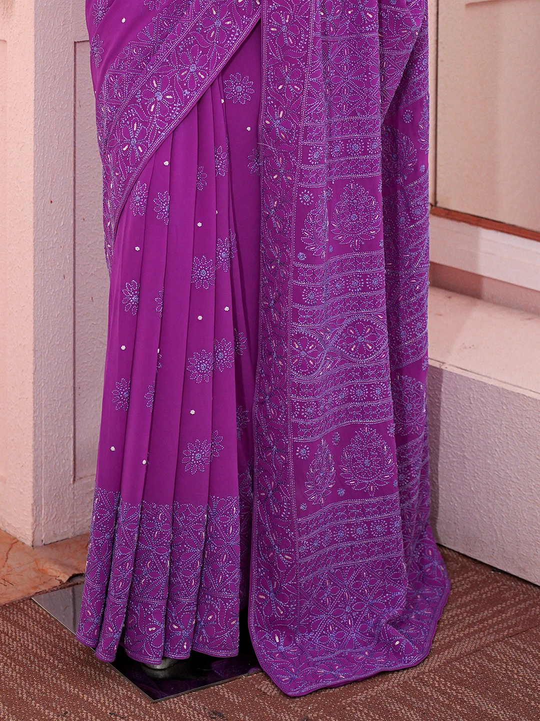 Ada Hand Embroidered Magenta Pure Georgette Lucknowi Chikankari Saree With Blouse With Cutdana Work 01A860827
