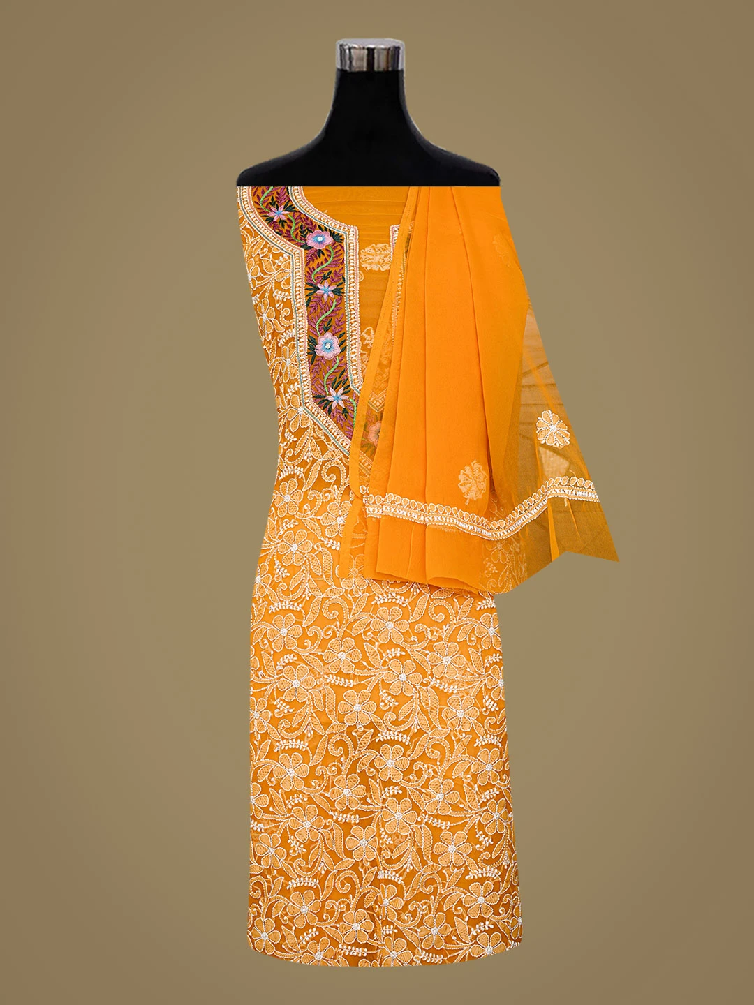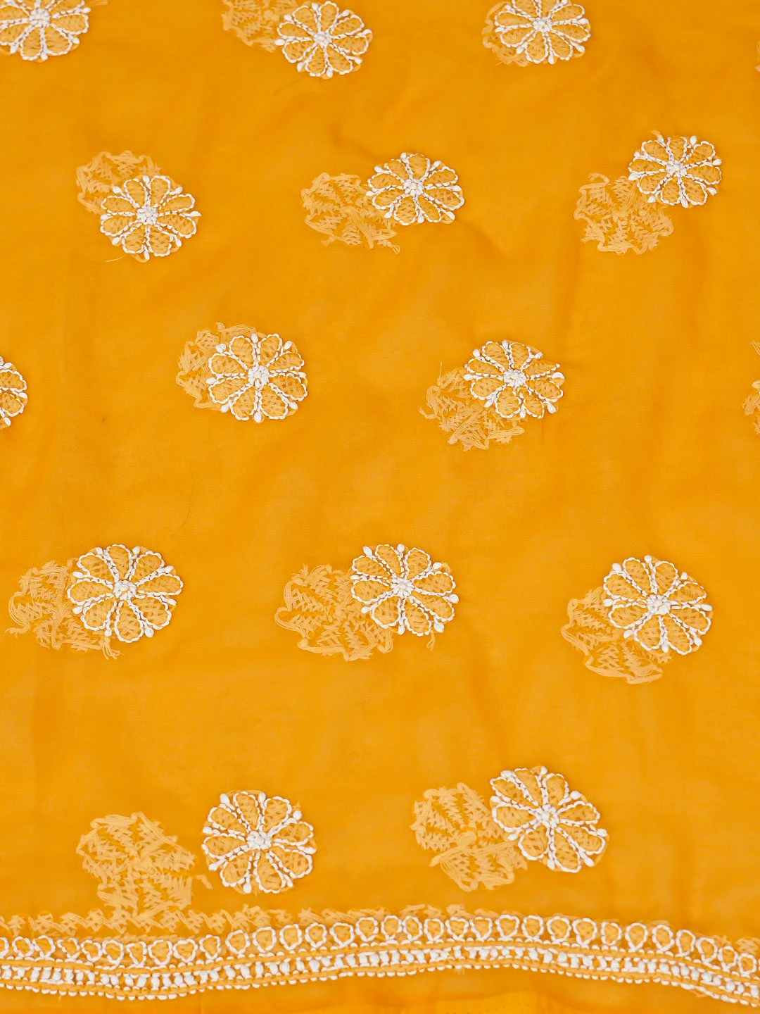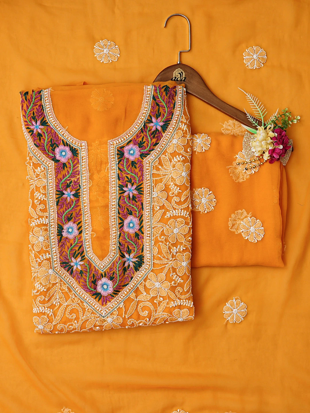 Ada Hand Embroidered Mustard Georgette Lucknowi Chikankari Unstitched Suit Piece With Parsi Work 01A345675