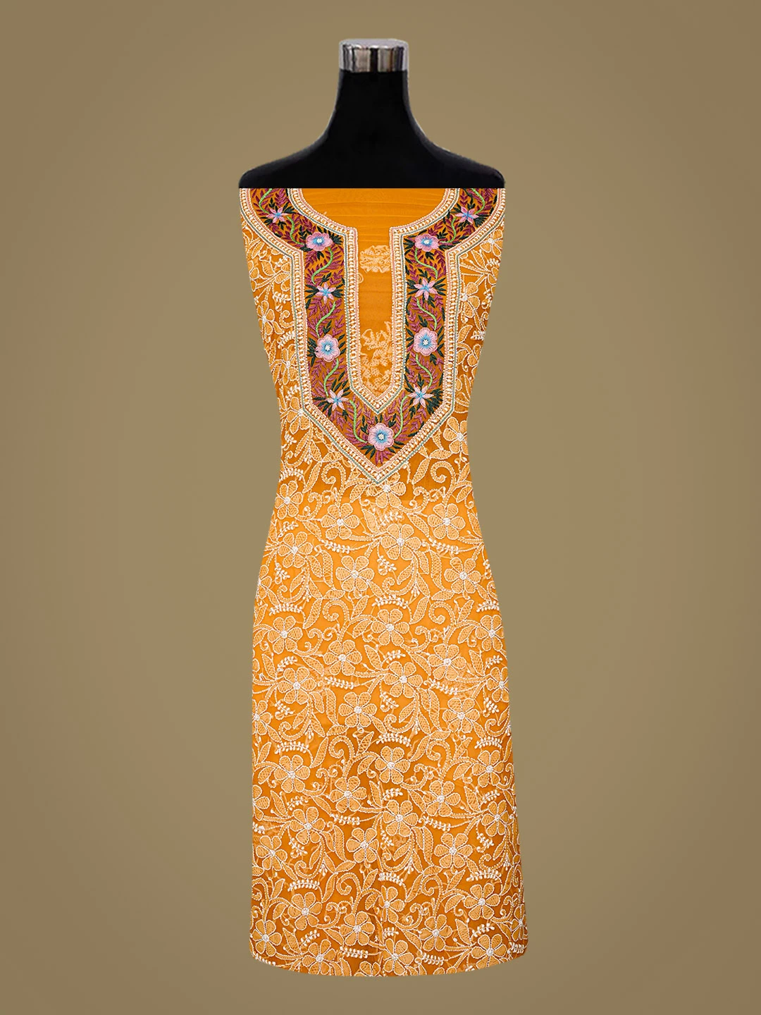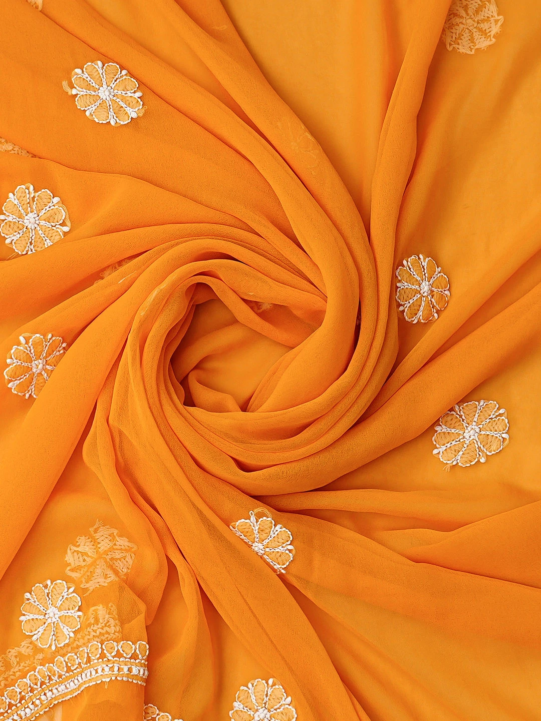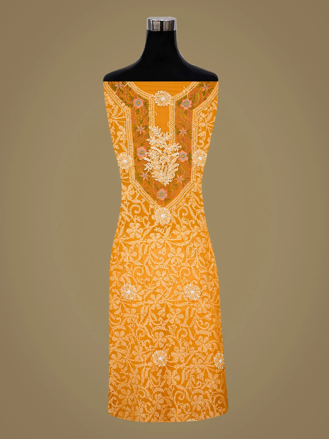 Ada Hand Embroidered Mustard Georgette Lucknowi Chikankari Unstitched Suit Piece With Parsi Work 01A345675