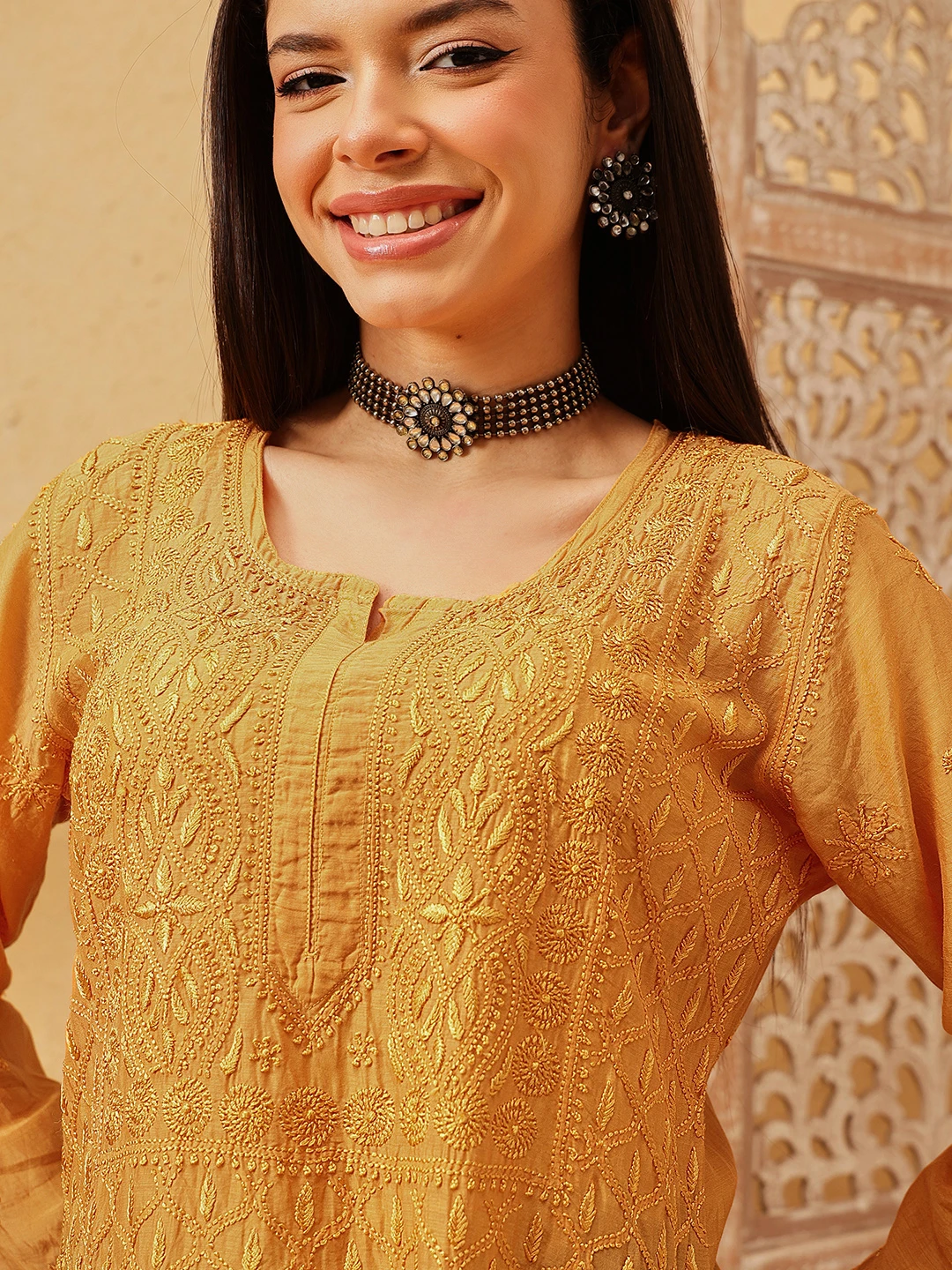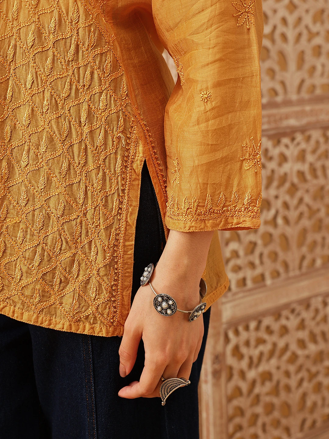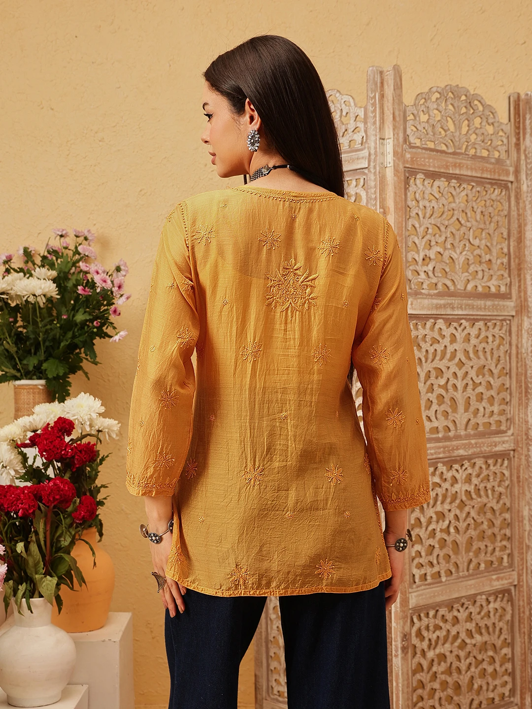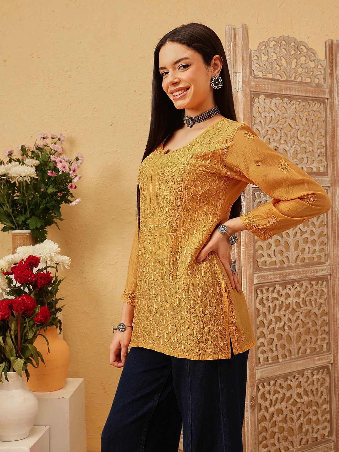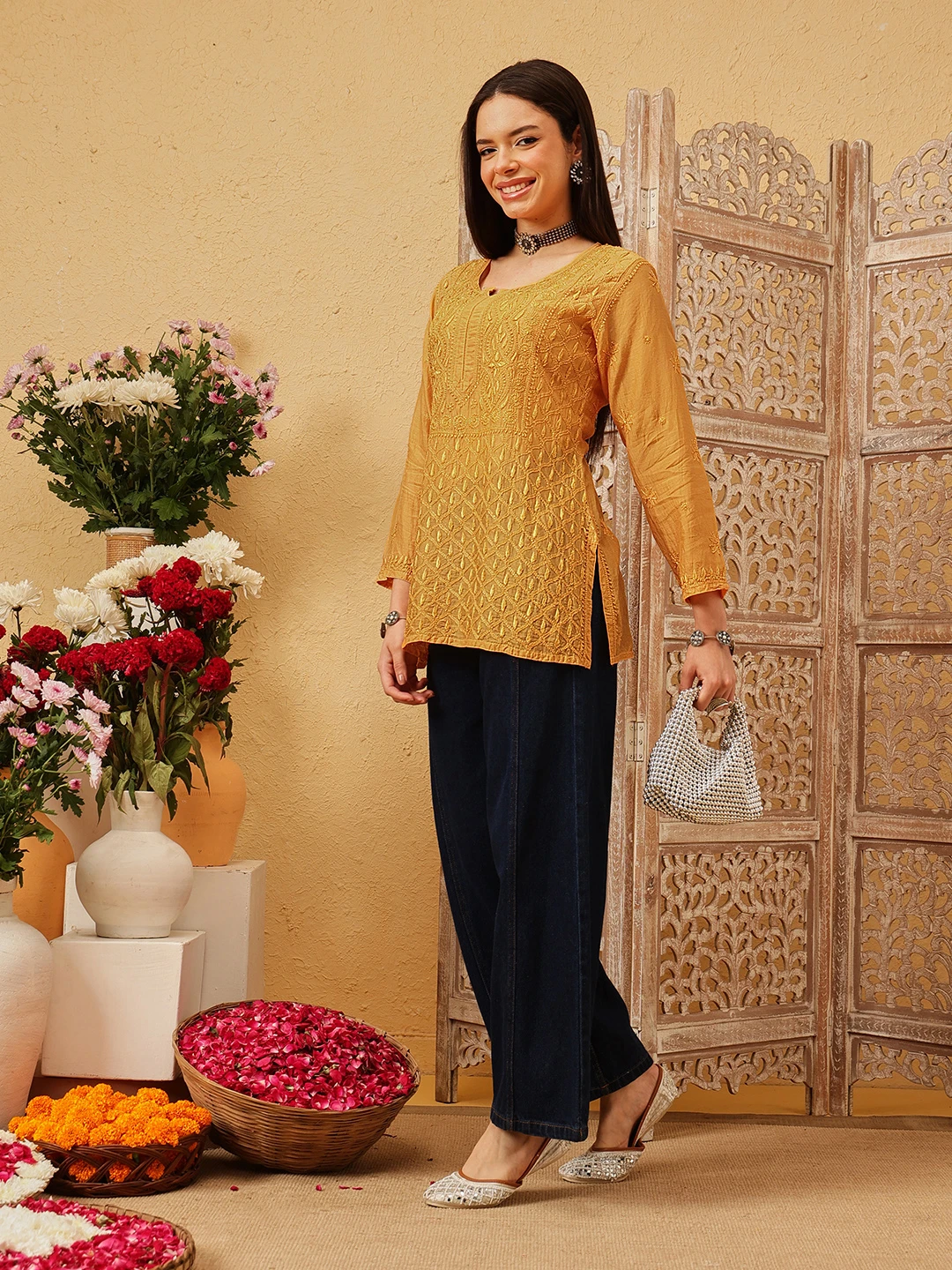 Ada Hand Embroidered Mustard Muslin Lucknowi Chikankari Short Kurti A911546