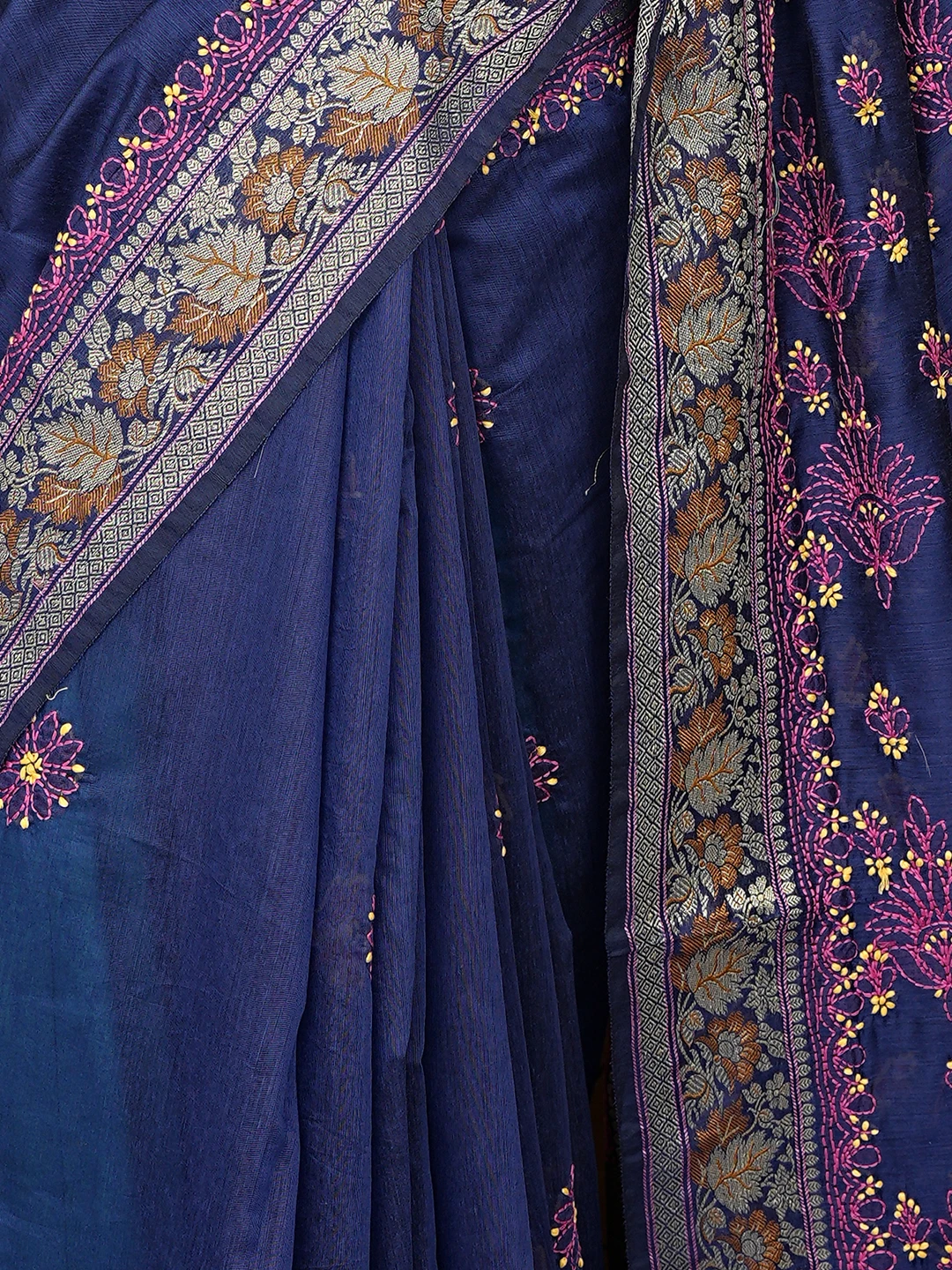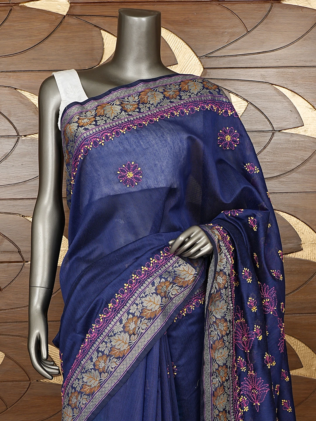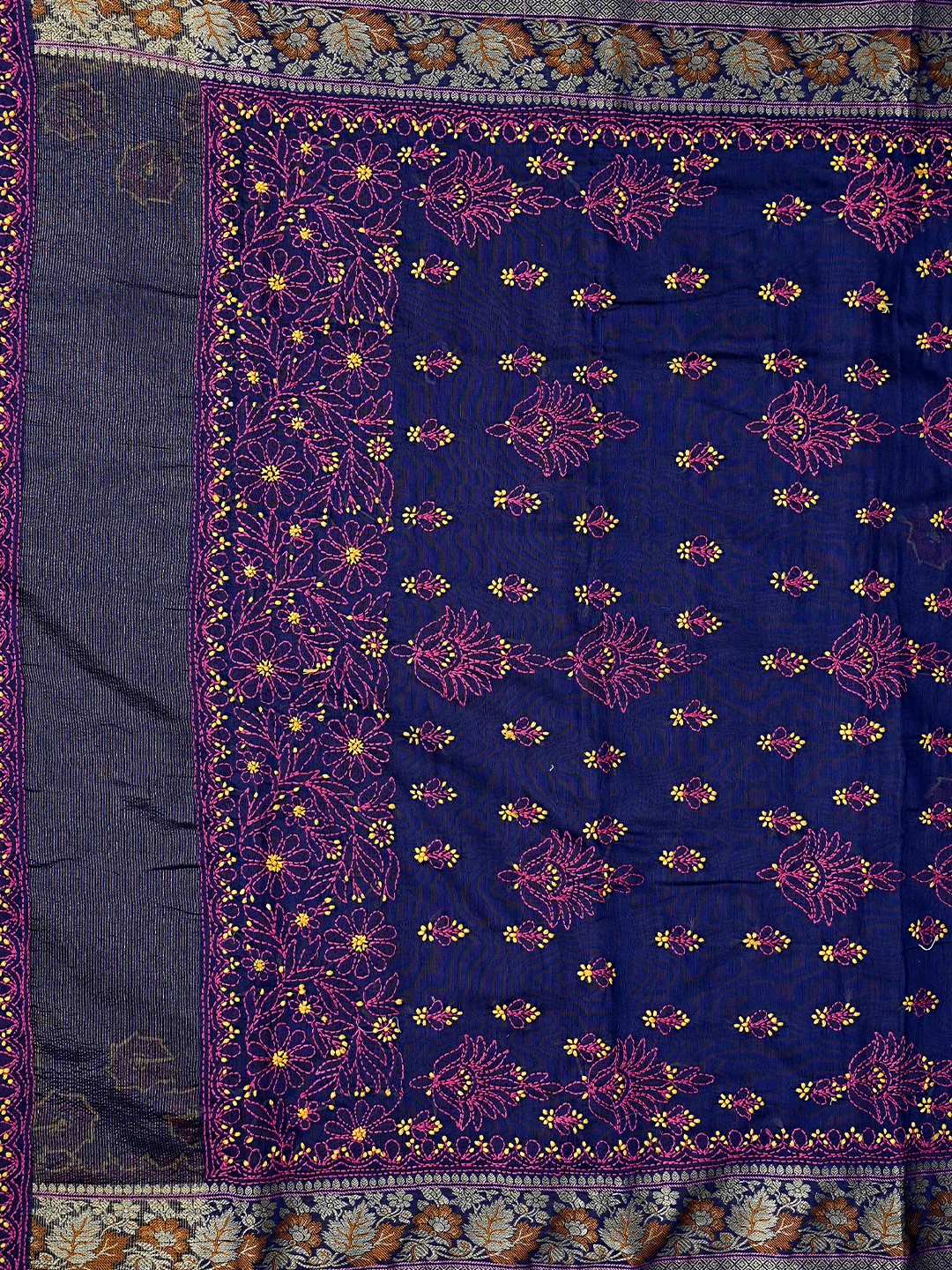 Ada Hand Embroidered Navy Blue Chanderi Lucknowi Chikankari Saree With Blouse 01A877305