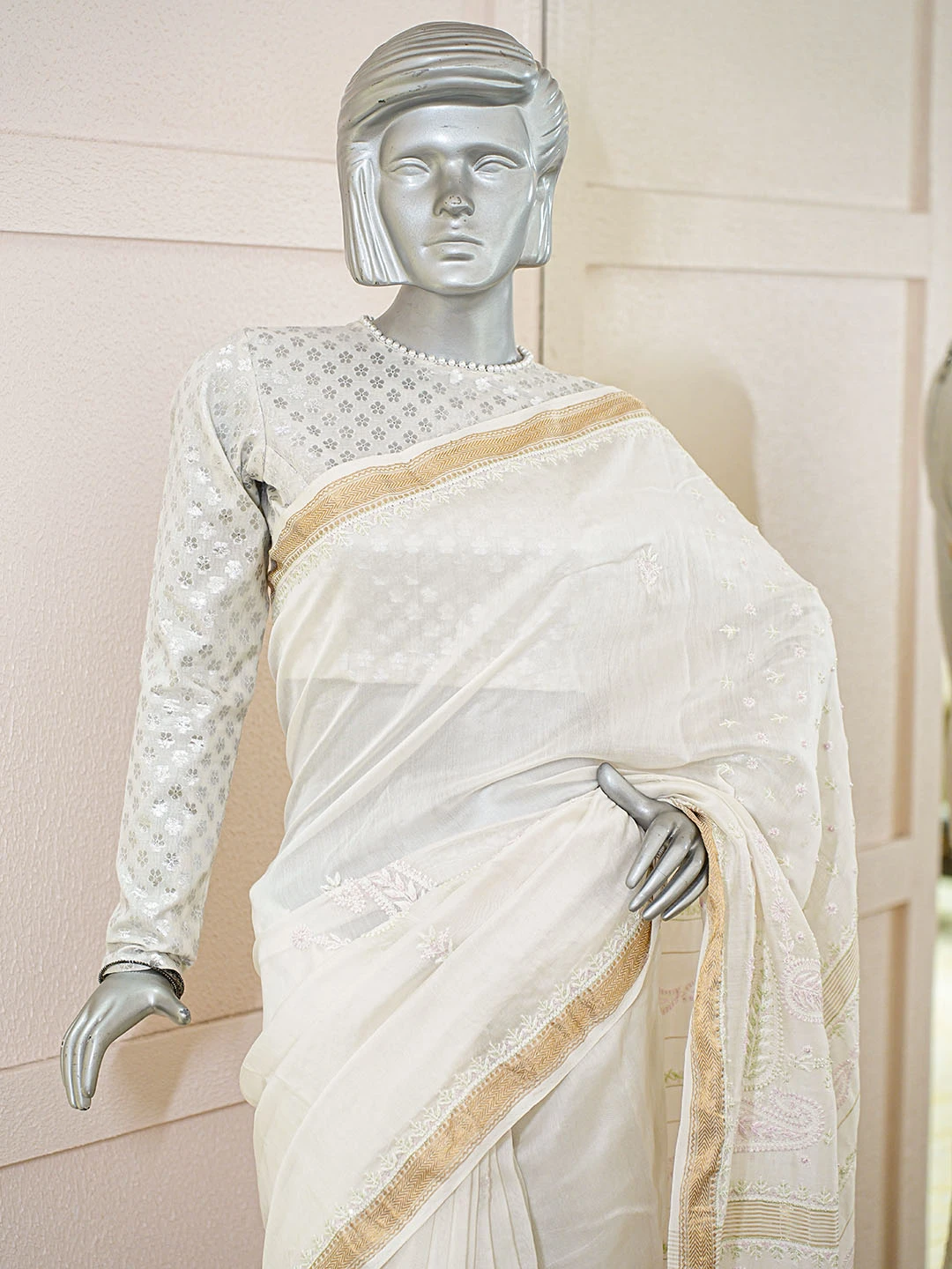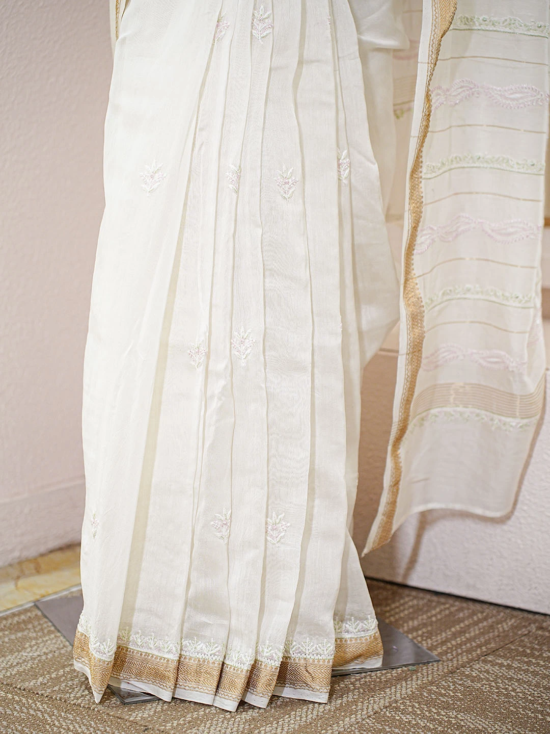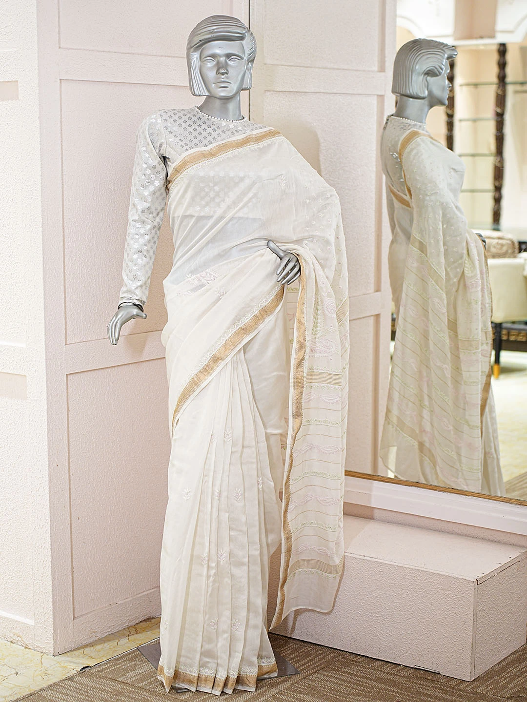 Ada Hand Embroidered Off White Chanderi Lucknowi Chikankari Saree And Blouse With Cutdana Work 01A681217