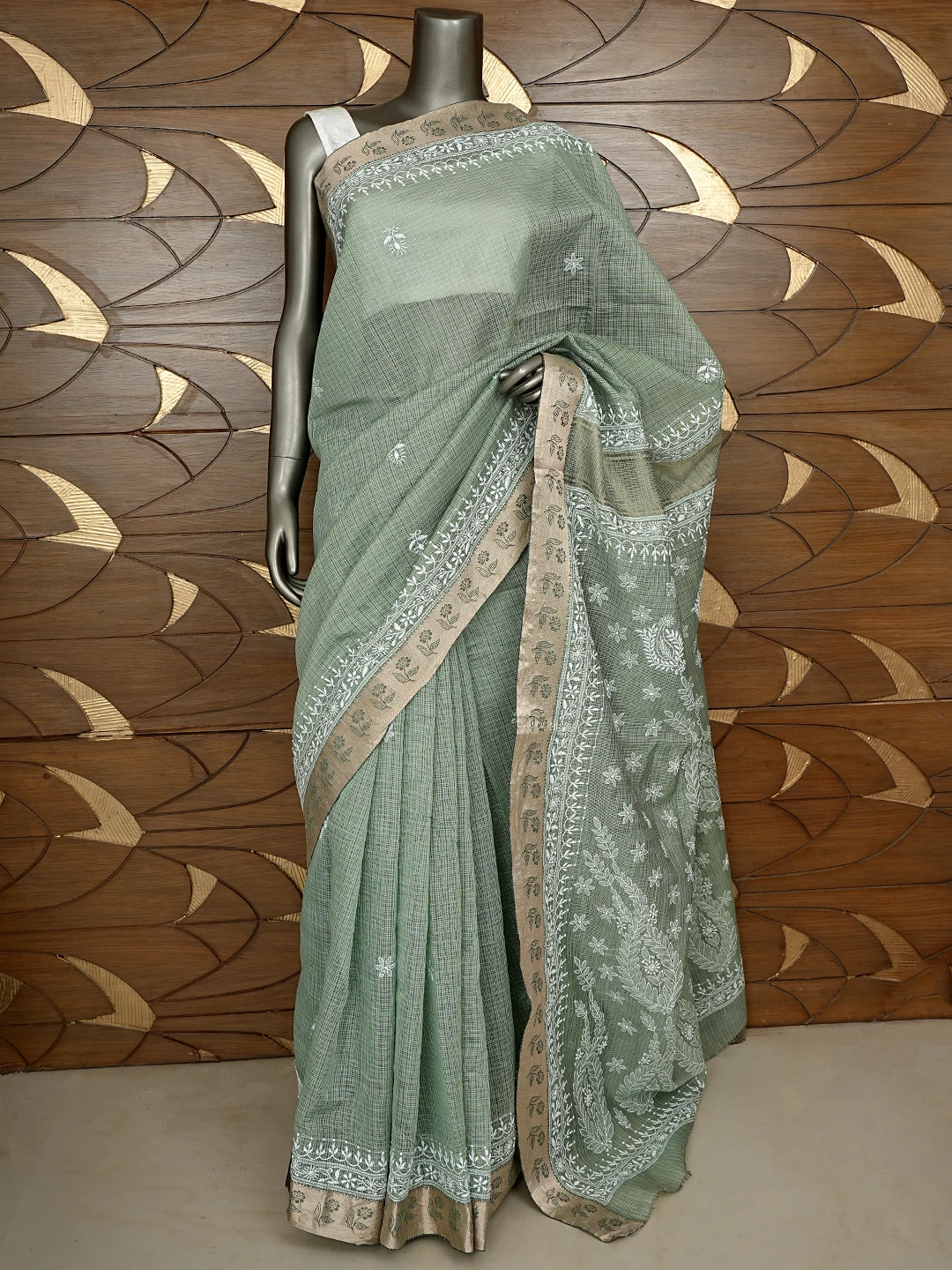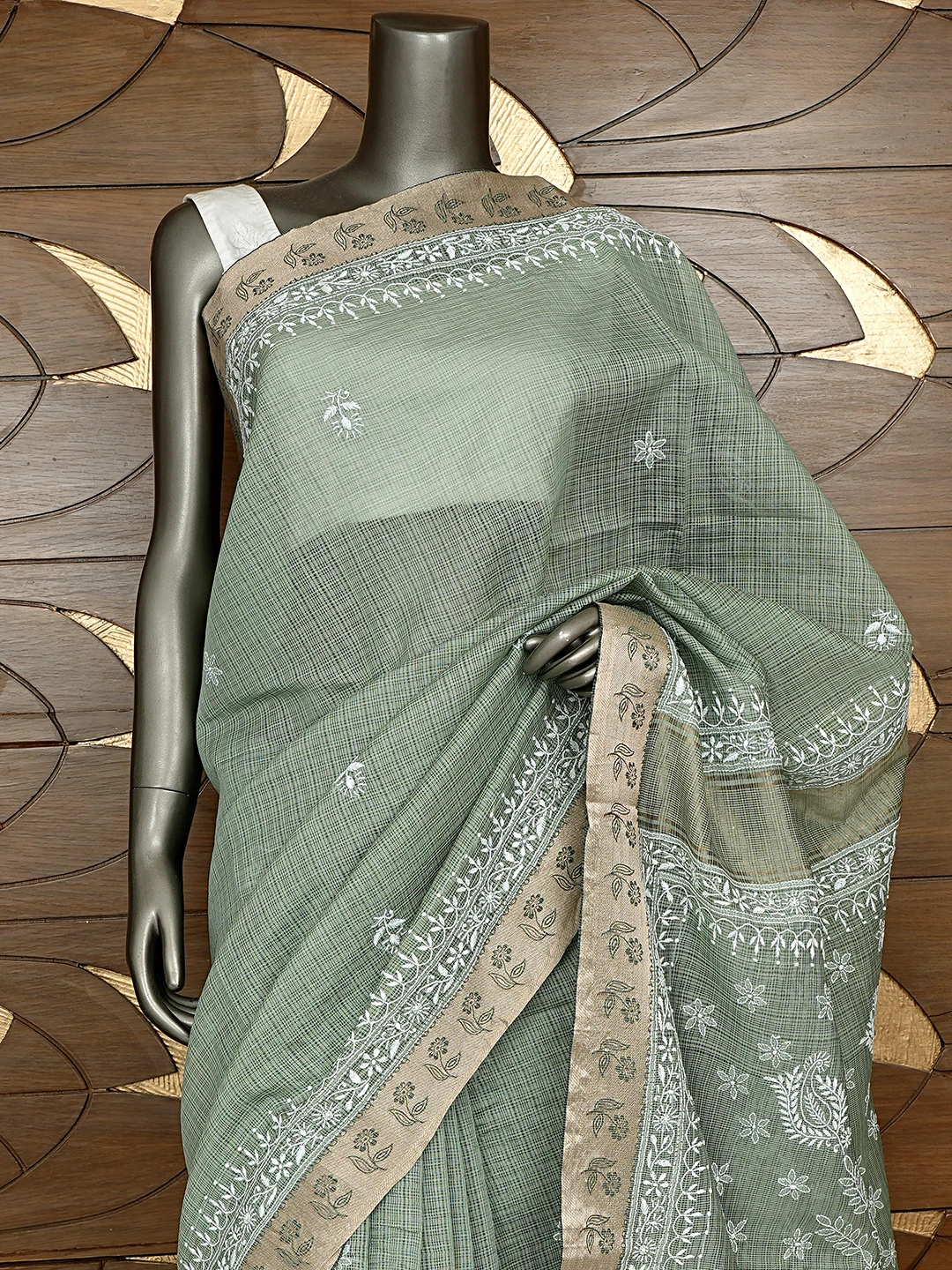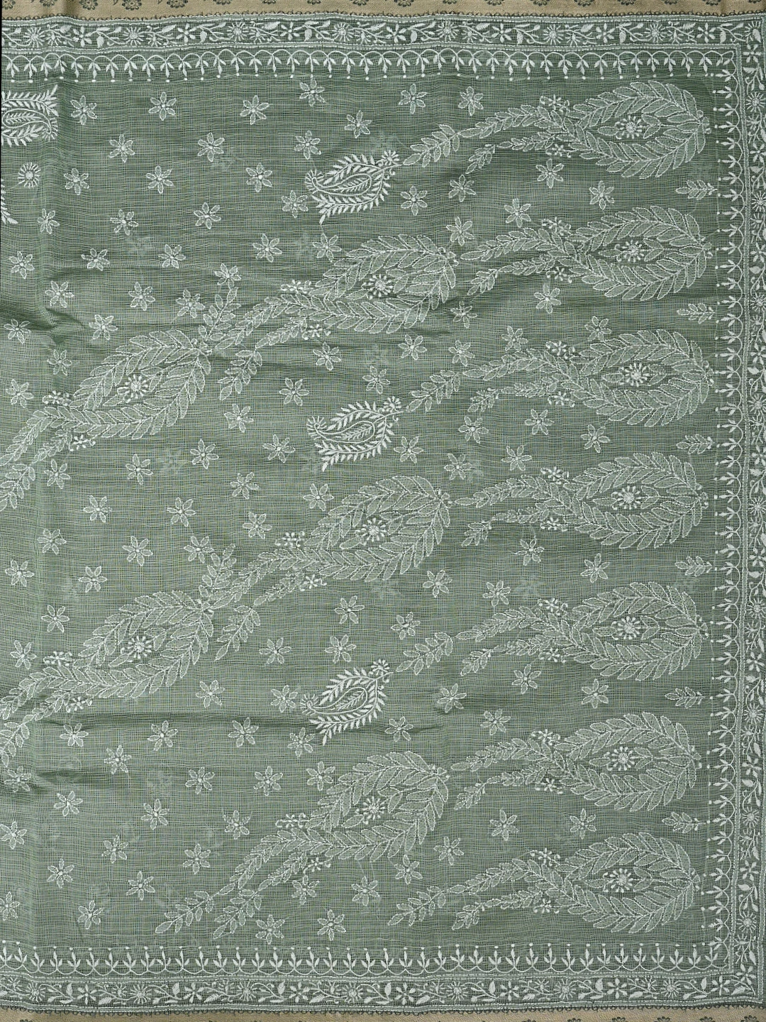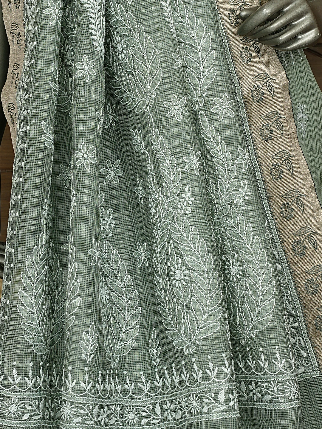 Ada Hand Embroidered Olive Green Kota Chanderi Lucknowi Chikankari Saree and Blouse 01A879432