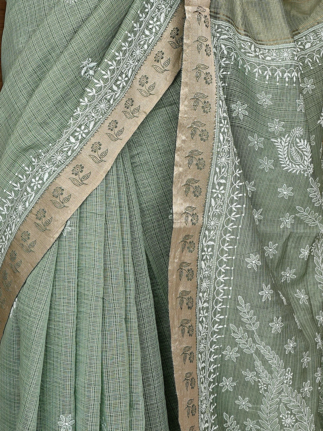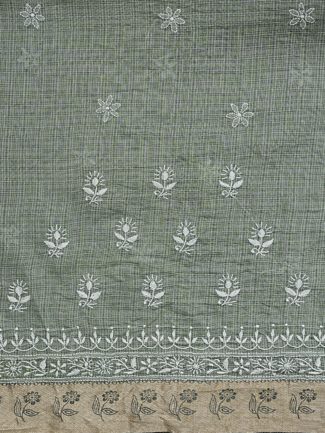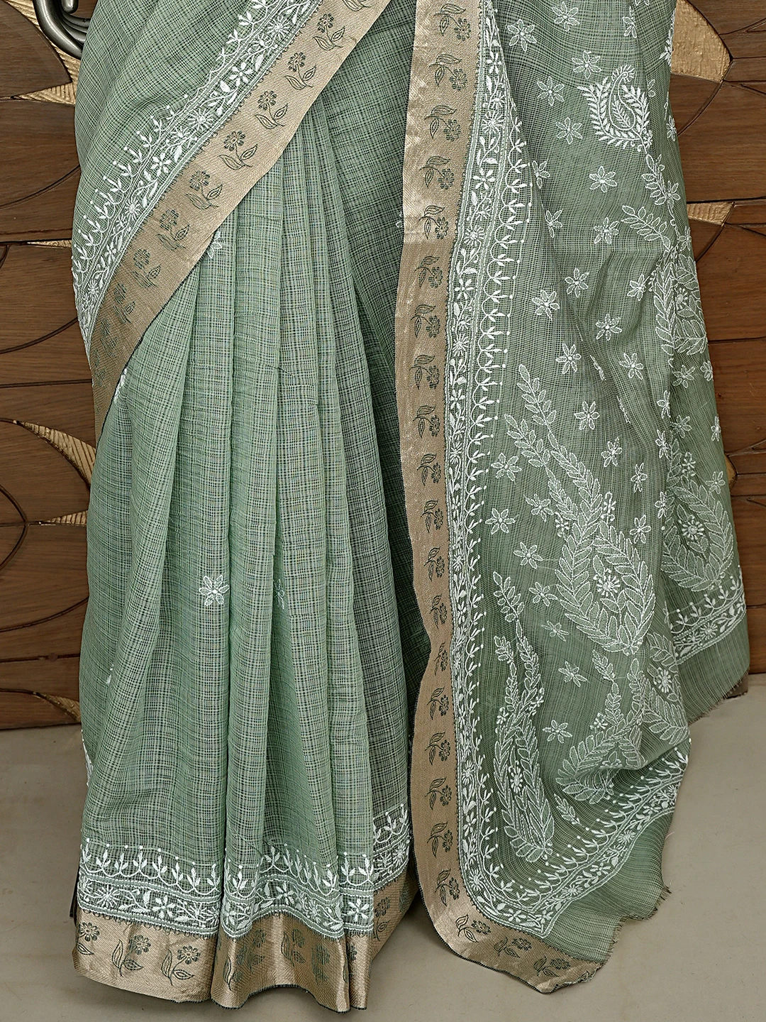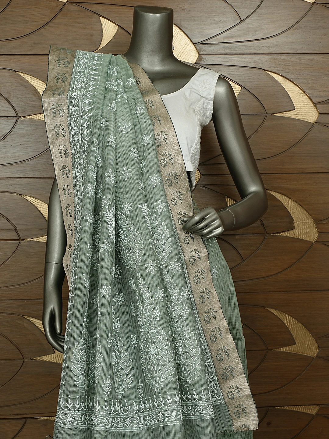 Ada Hand Embroidered Olive Green Kota Chanderi Lucknowi Chikankari Saree and Blouse 01A879432