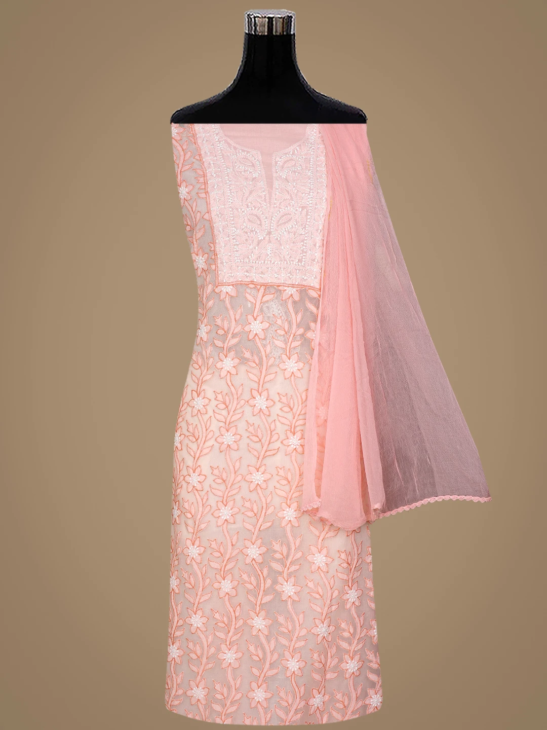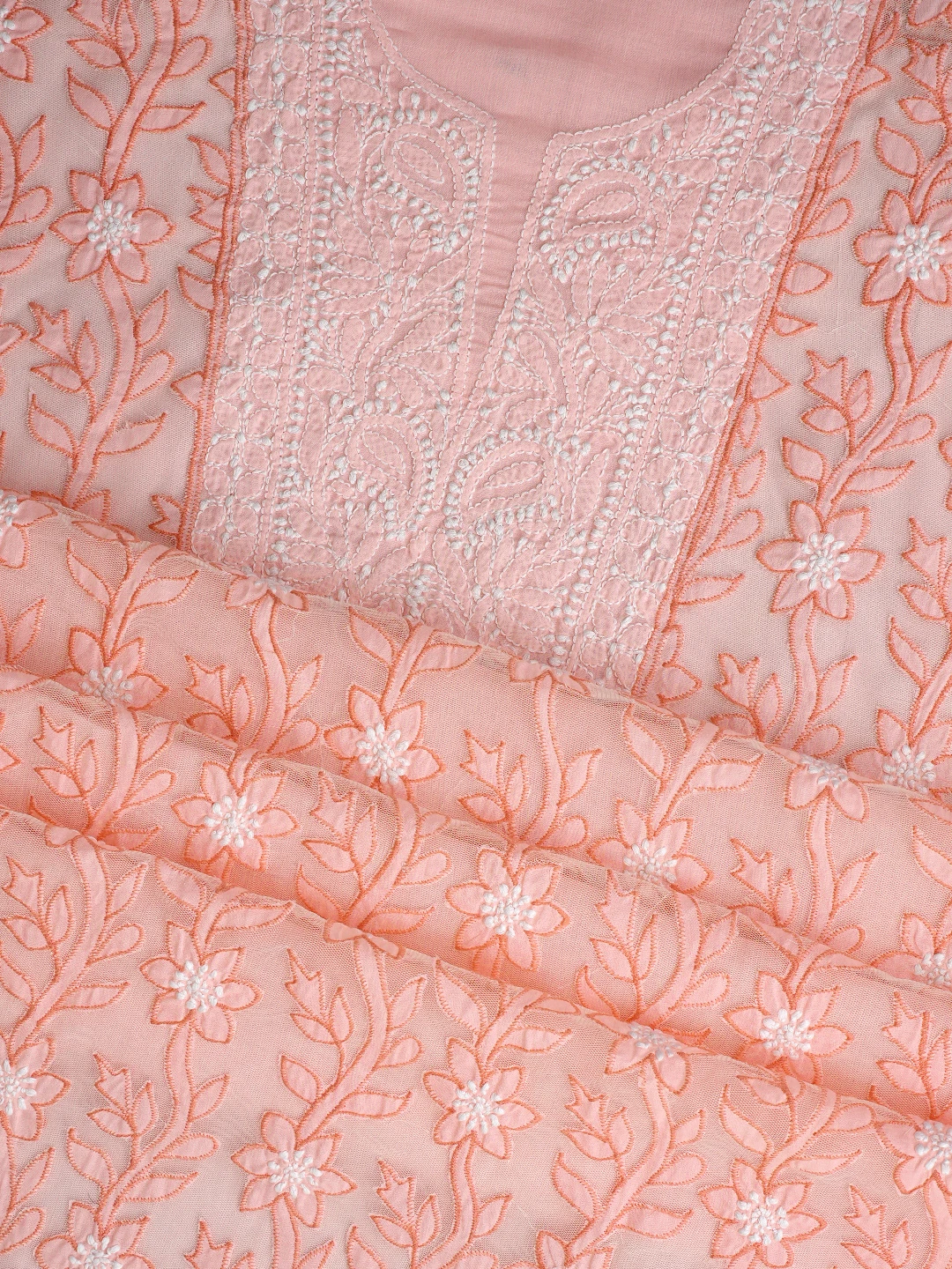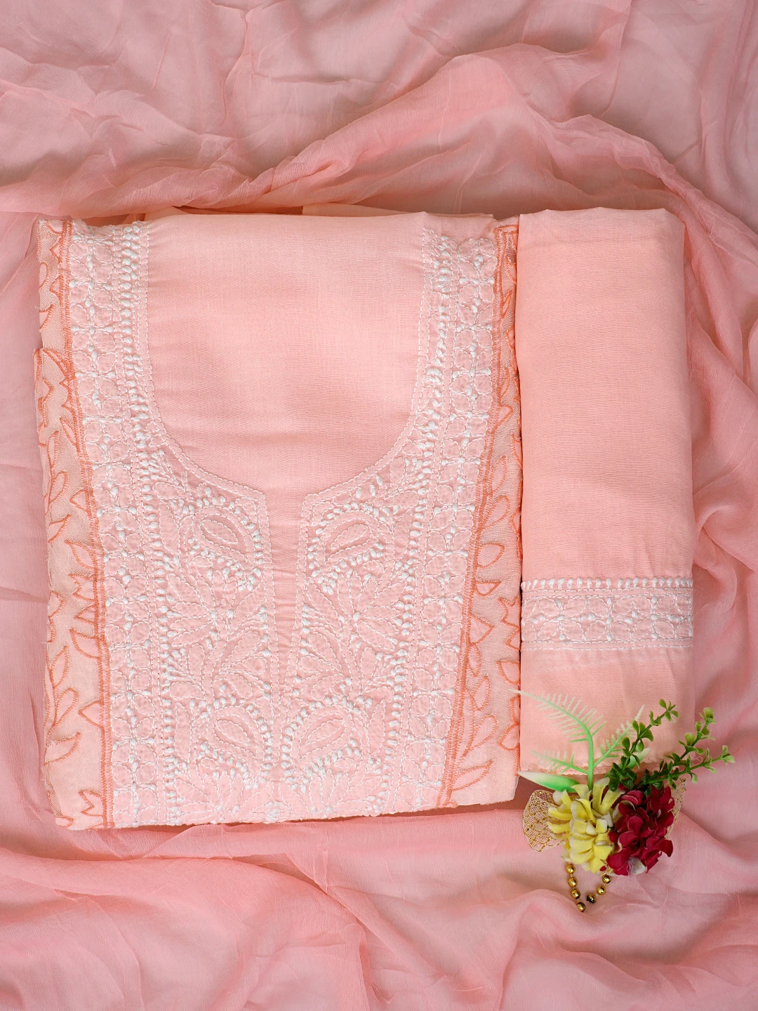 Ada Hand Embroidered Peach Cotton And Net Lucknowi Chikankari Unstitched Suit Piece 01A821974