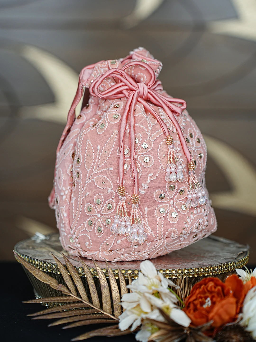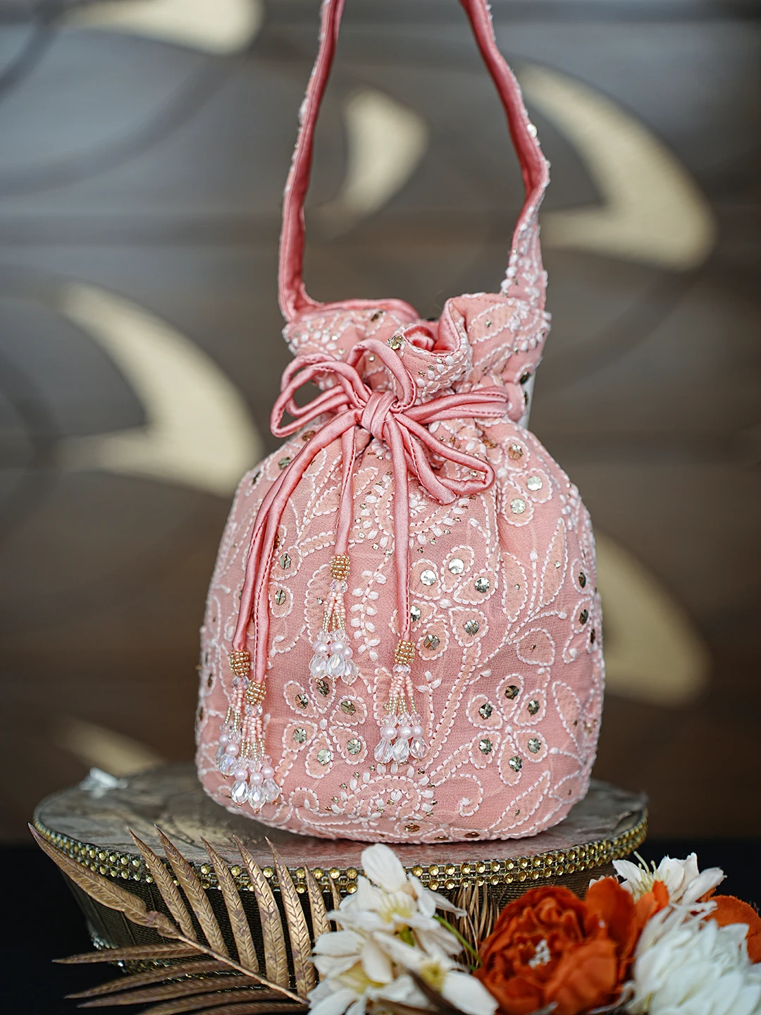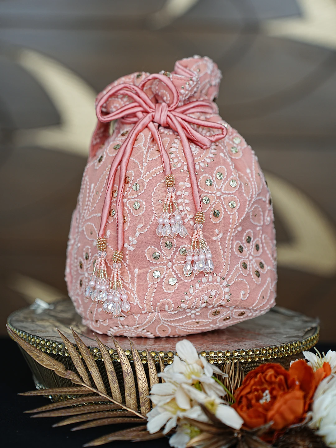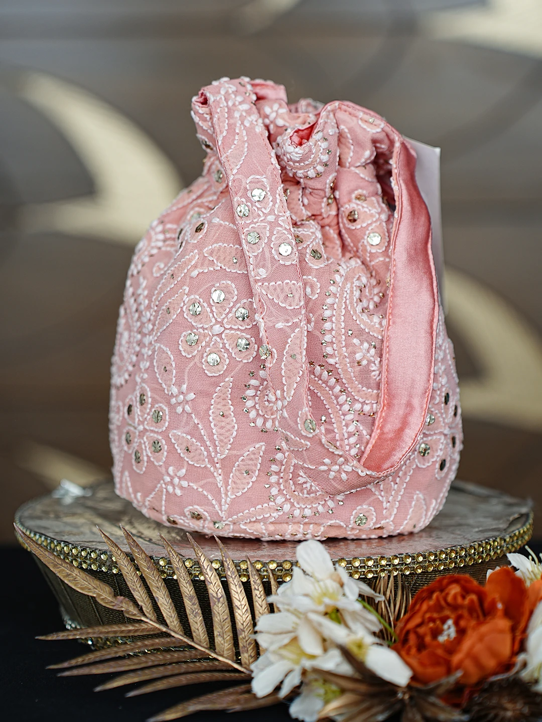 Ada Hand Embroidered Peach Georgette Lucknowi Chikankari Potli Bag With Muqaish Work 01A862590