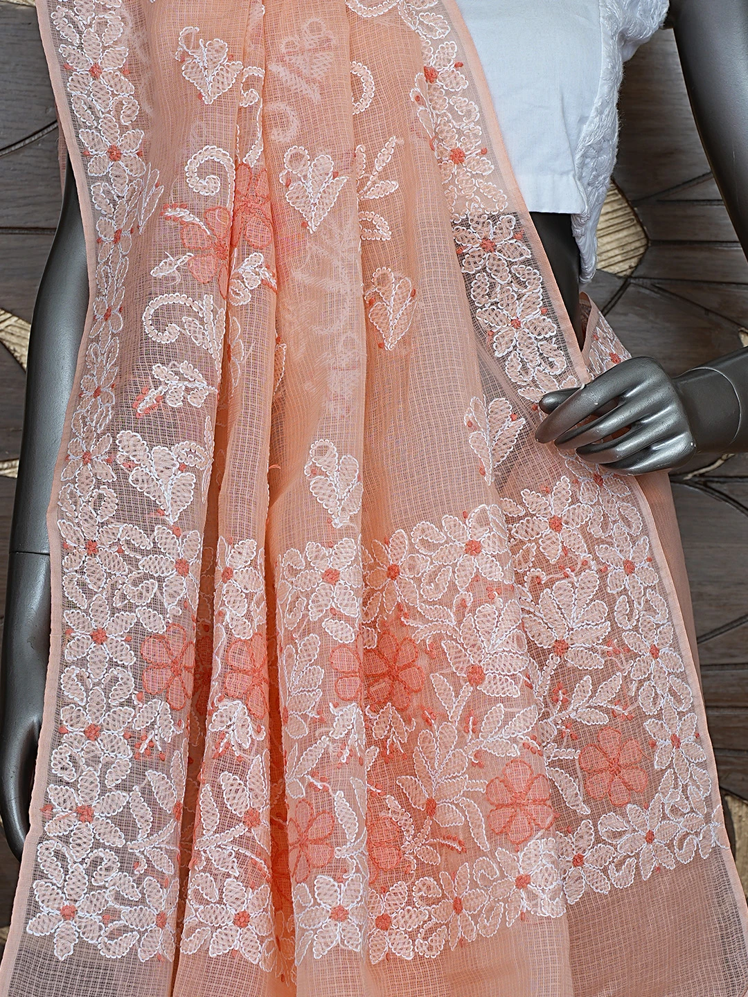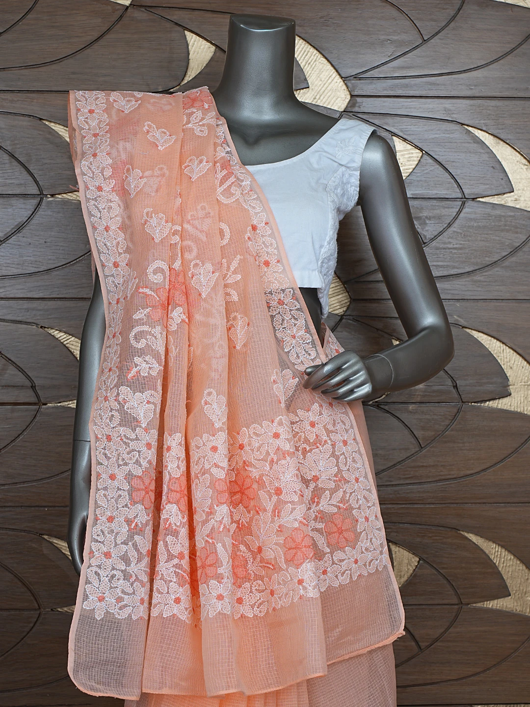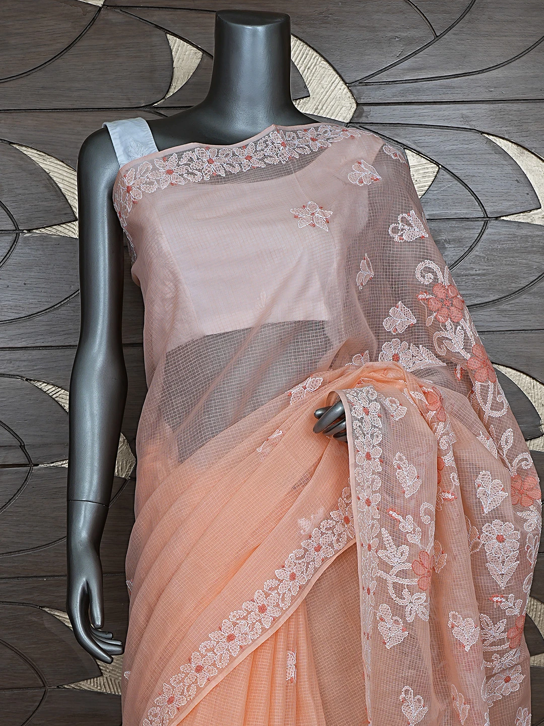 Ada Hand Embroidered Peach Kota Lucknowi Chikankari Saree and Blouse 01A872956