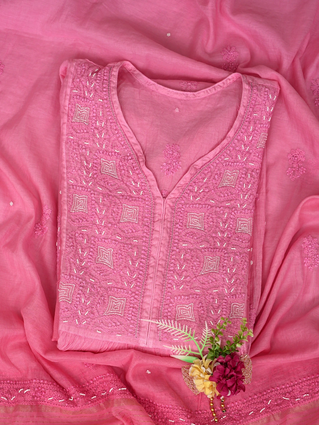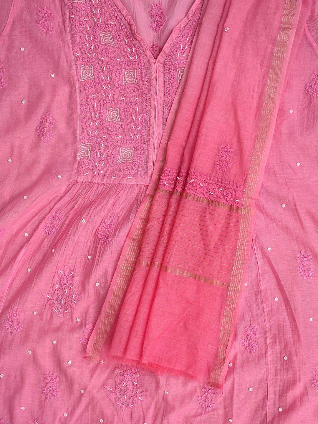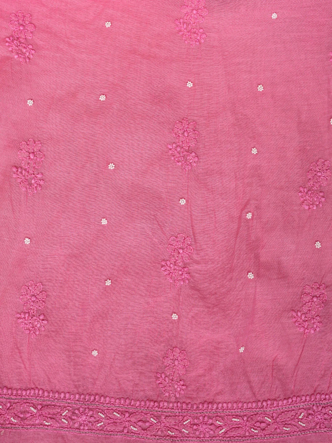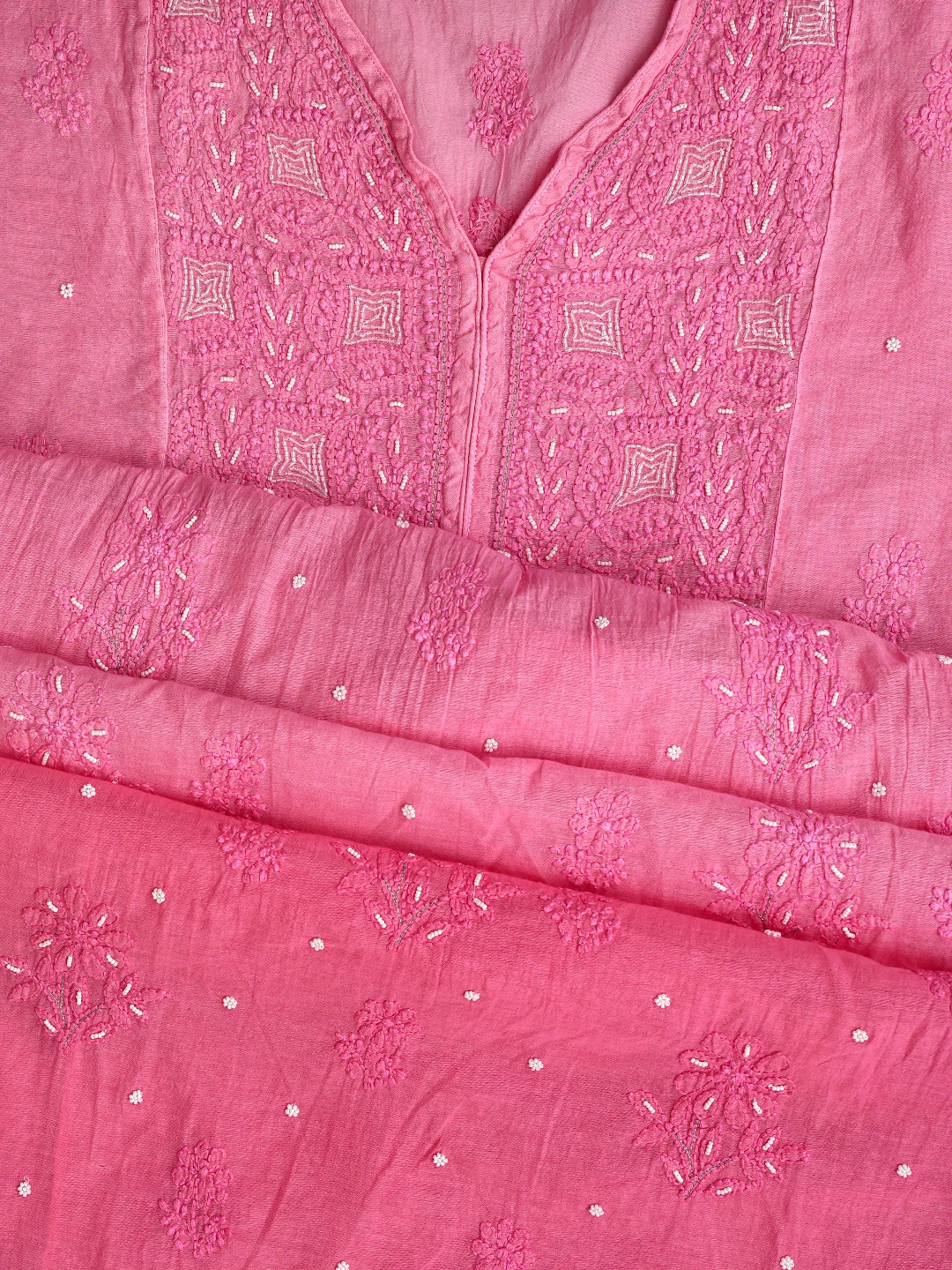 Ada Hand Embroidered Pink Chanderi Lucknowi Chikankari Semi-Stitched Kurta Dupatta Set With Cutdana Work 01A833551