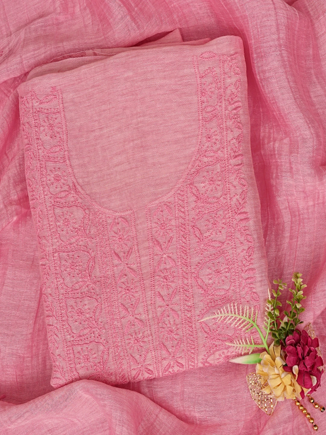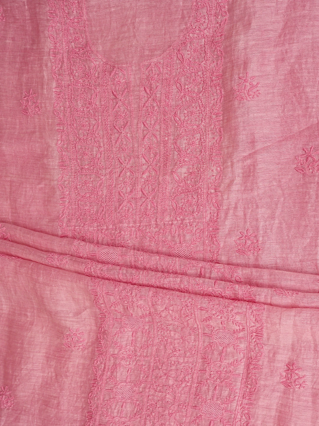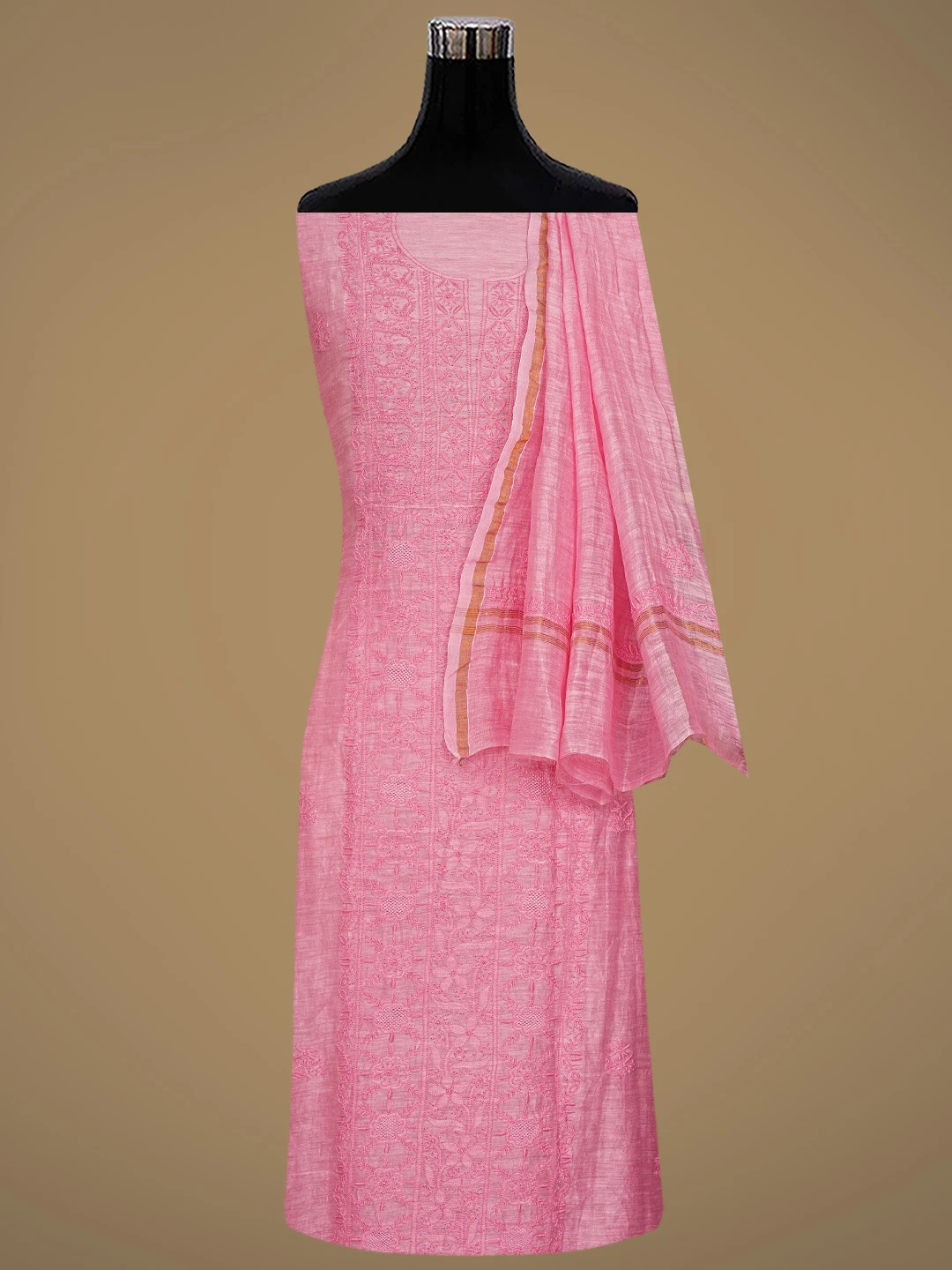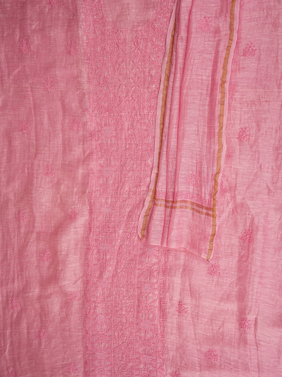 Ada Hand Embroidered Pink Chanderi Lucknowi Chikankari Unstitched Kurta Dupatta Set 01A523779