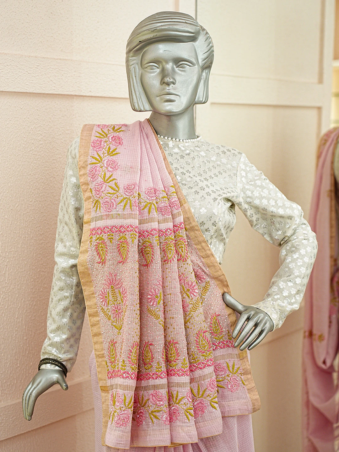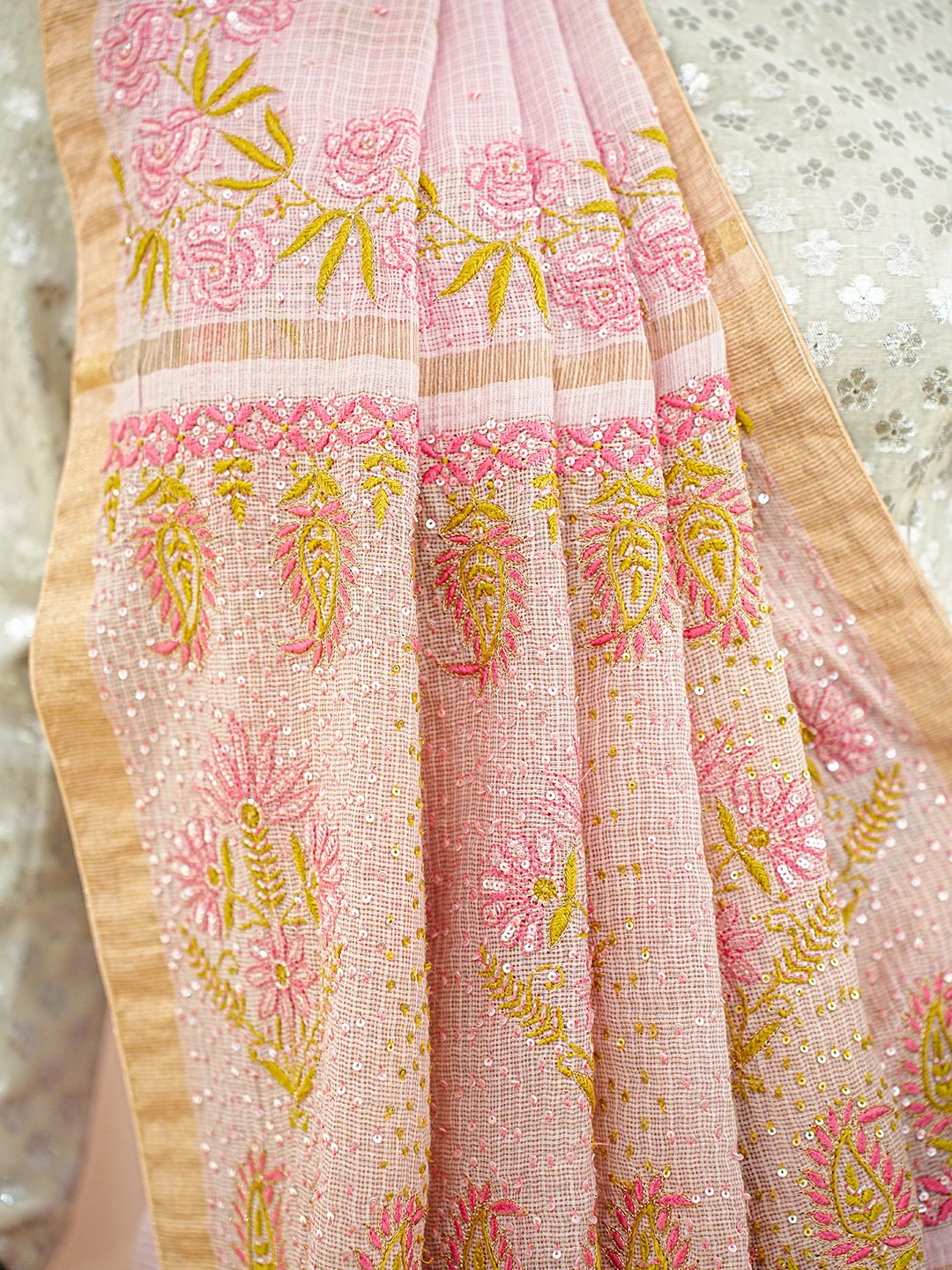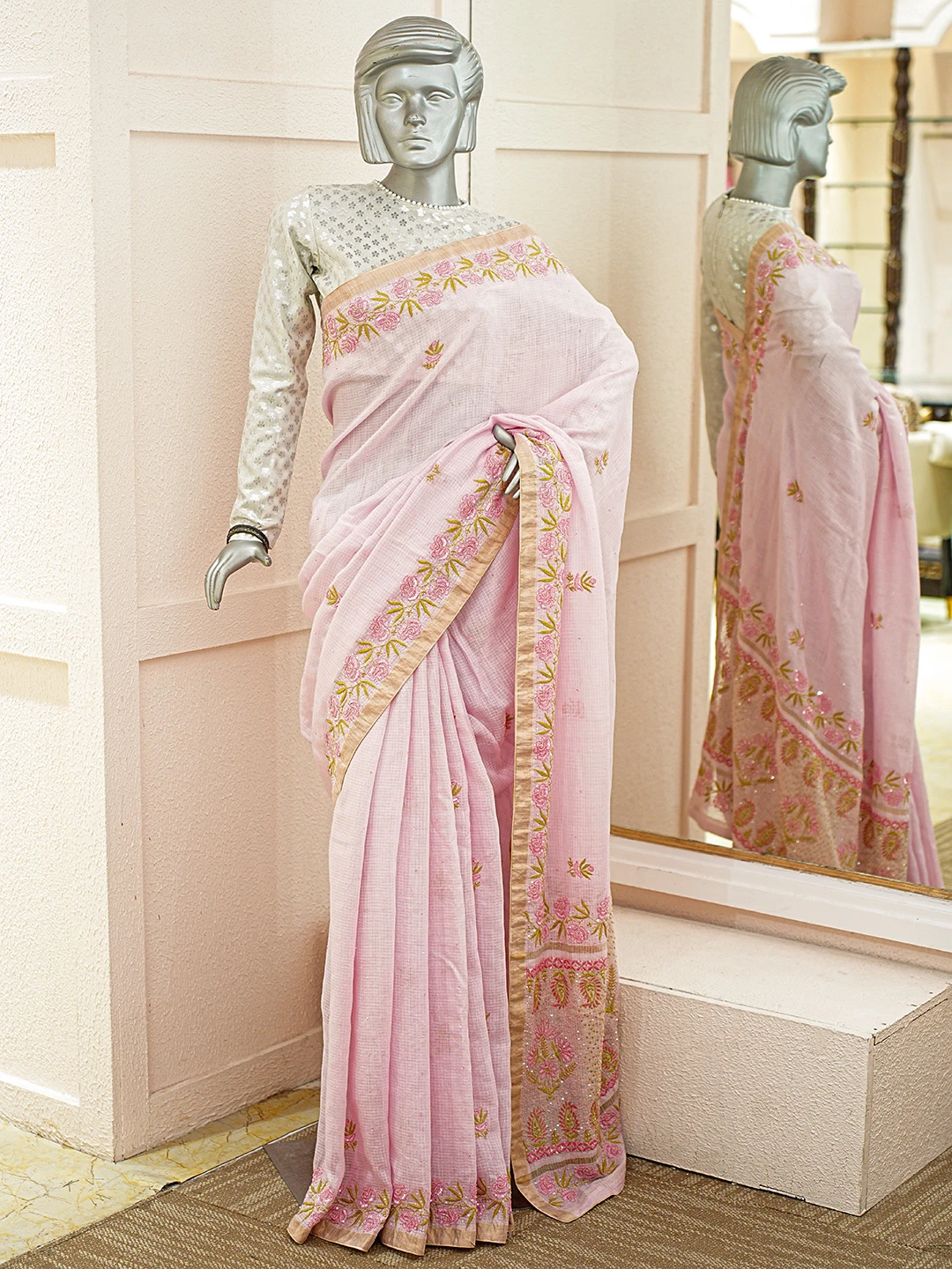 Ada Hand Embroidered Pink Kota Moonga Lucknowi Chikankari Saree With Blouse With Cutdana Work 01A719338