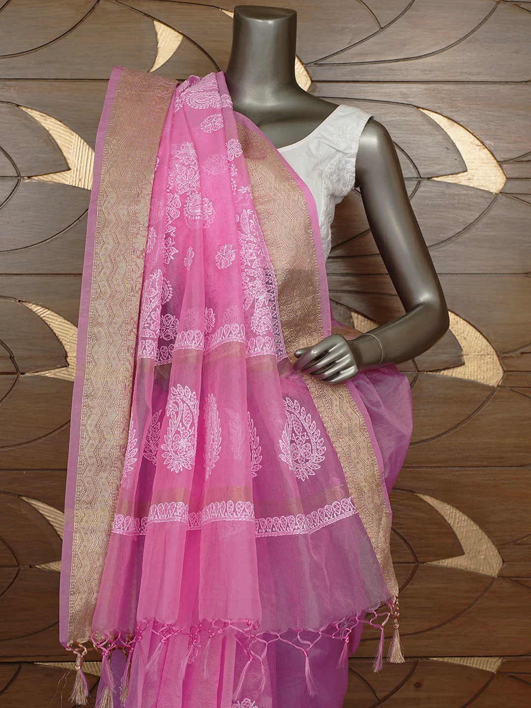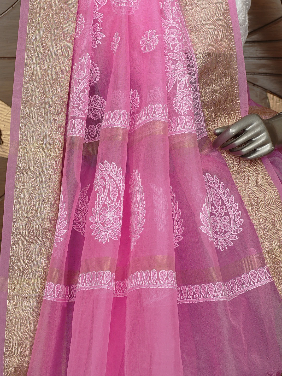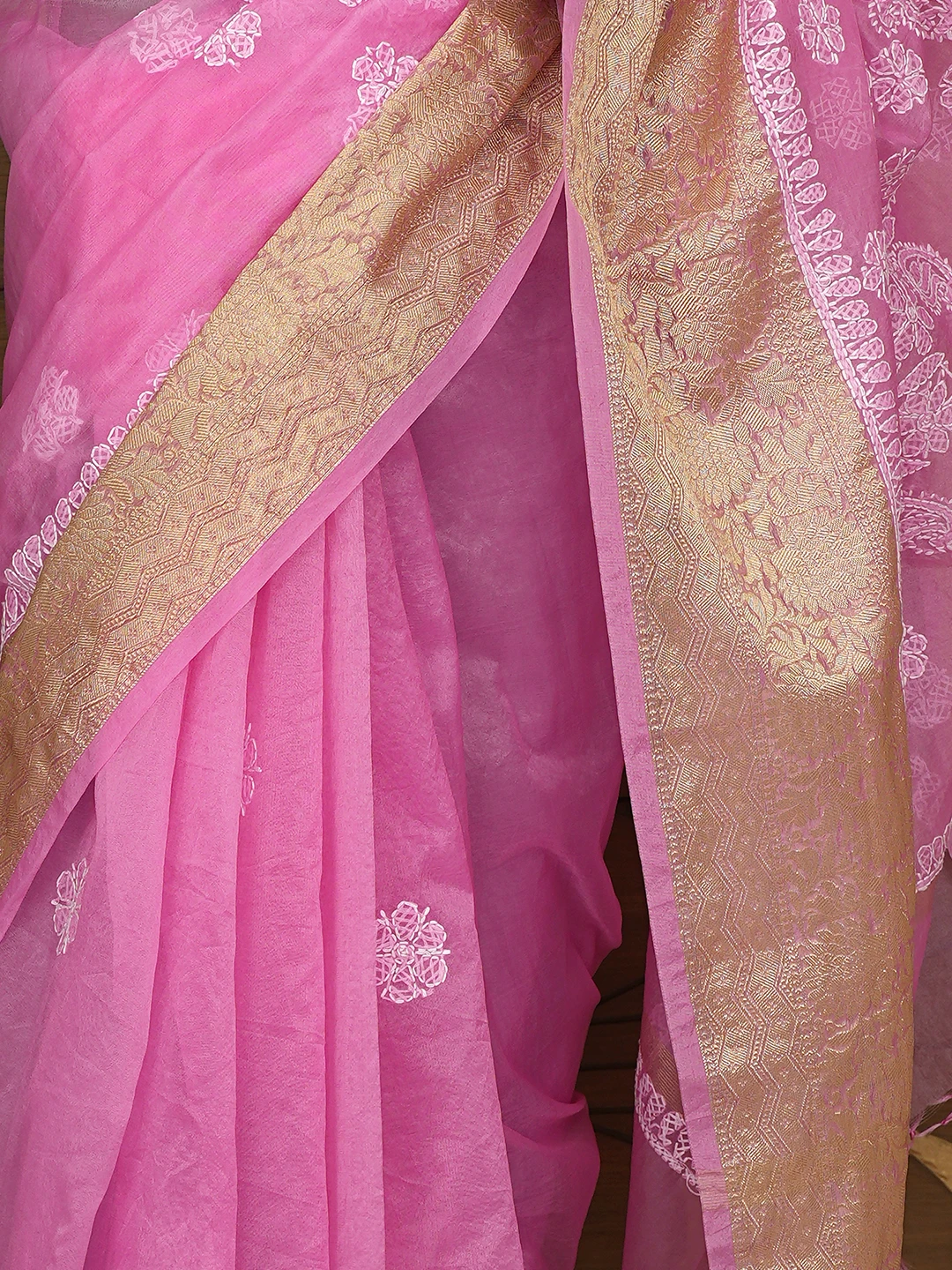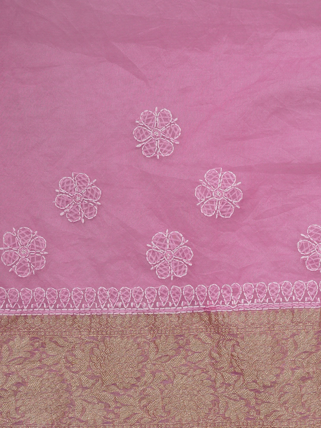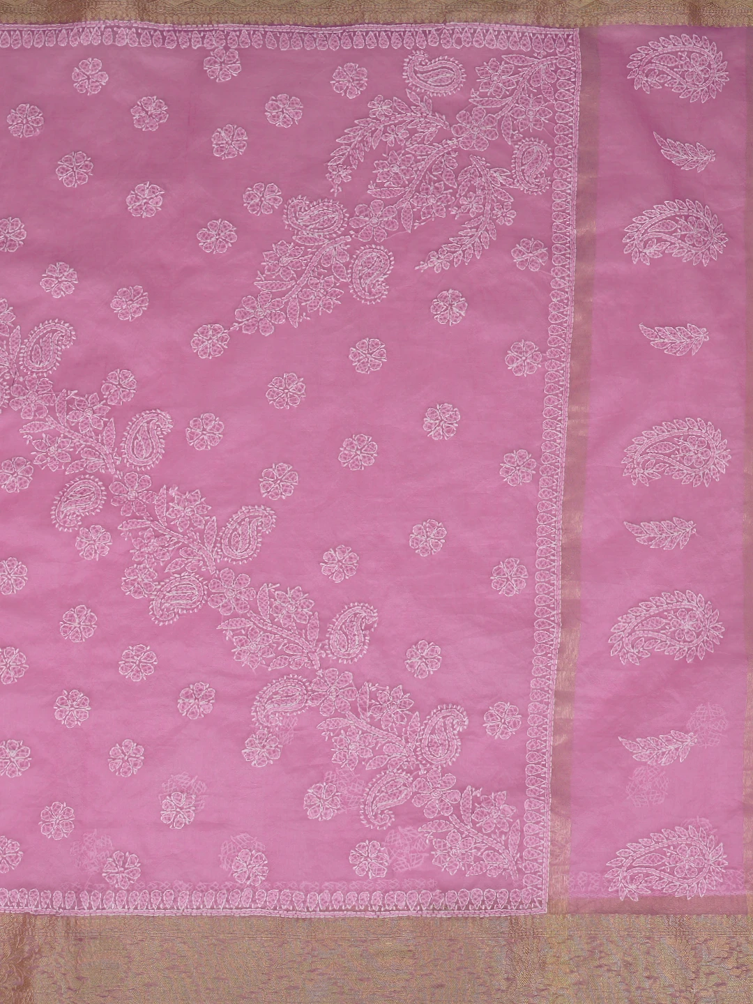 Ada Hand Embroidered Pink Organza Lucknowi Chikankari Saree and Blouse 01A816474