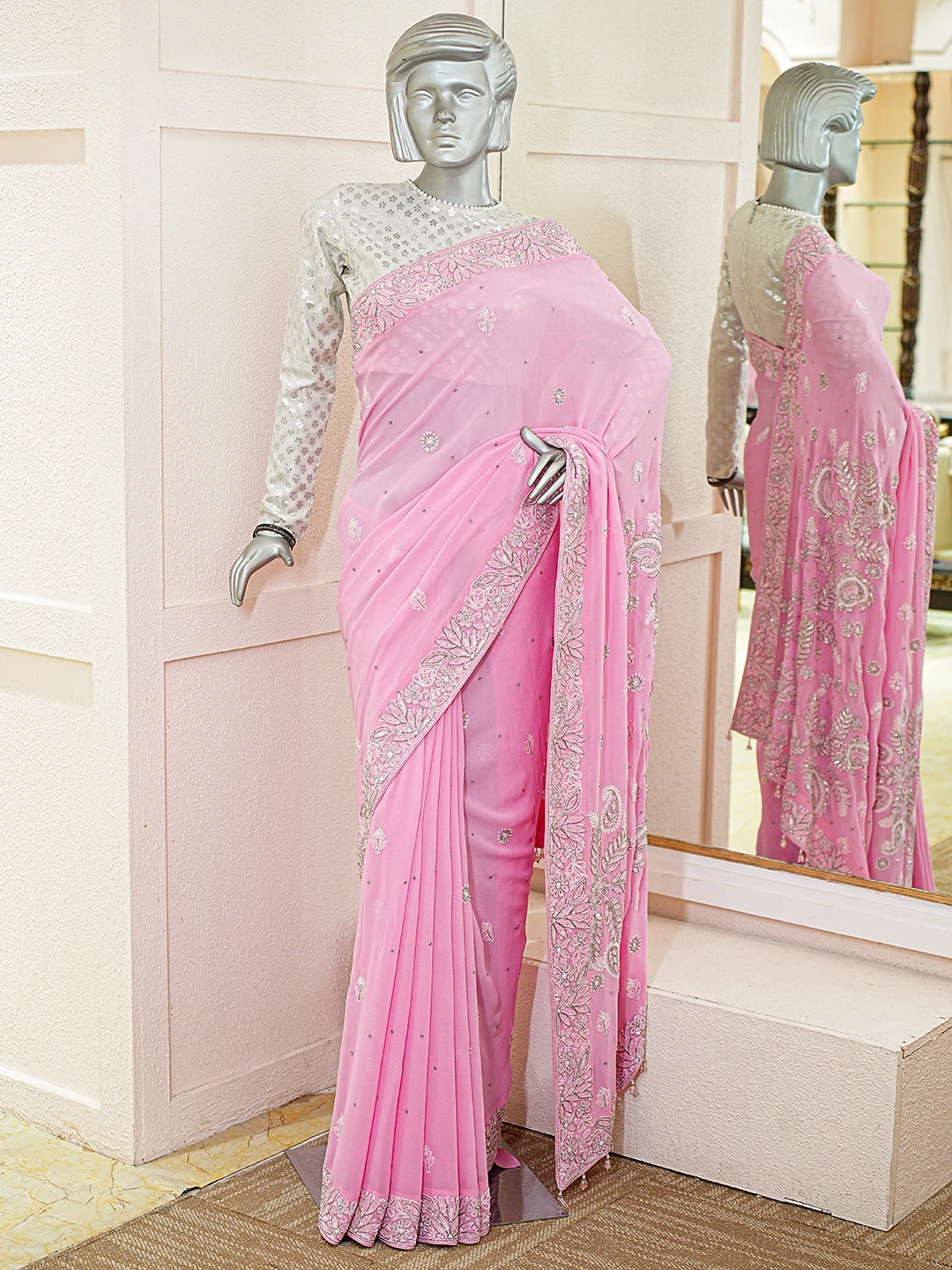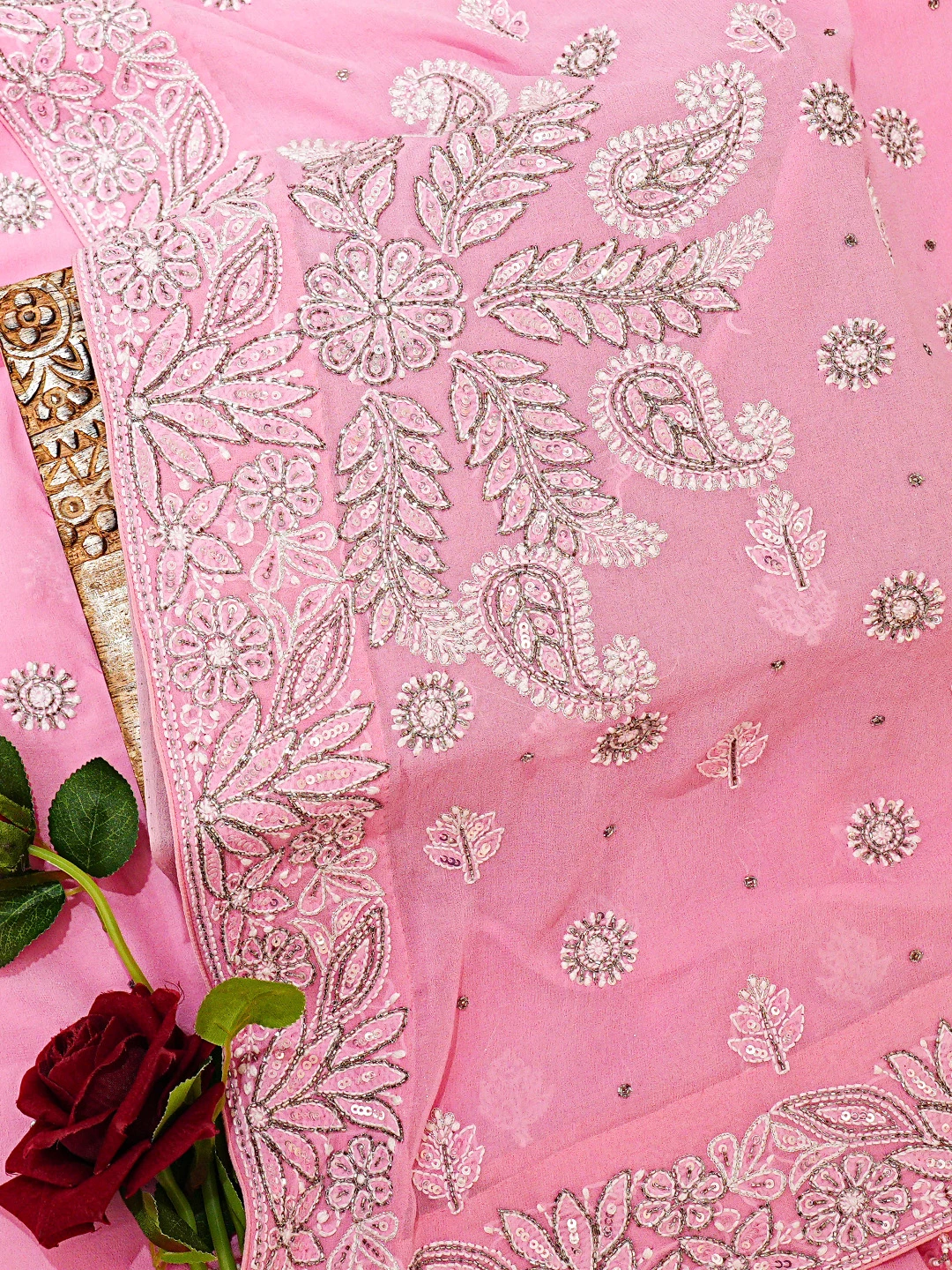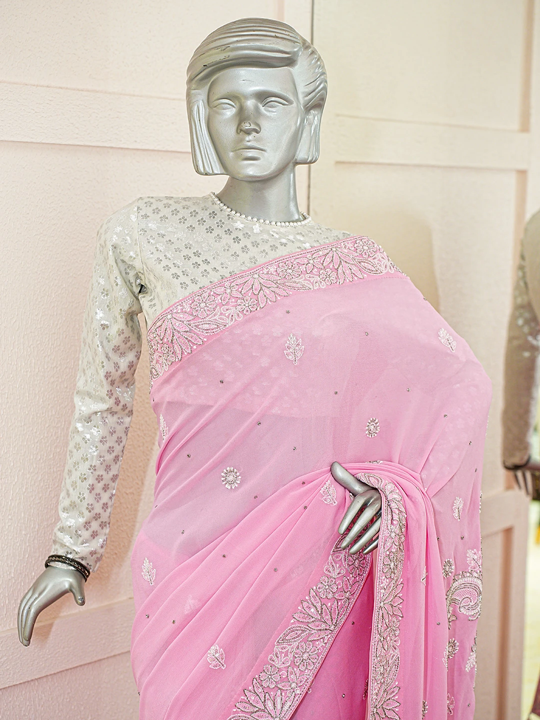 Ada Hand Embroidered Pink Pure Georgette Lucknowi Chikankari Saree With Blouse With Cutdana Work 01A689882