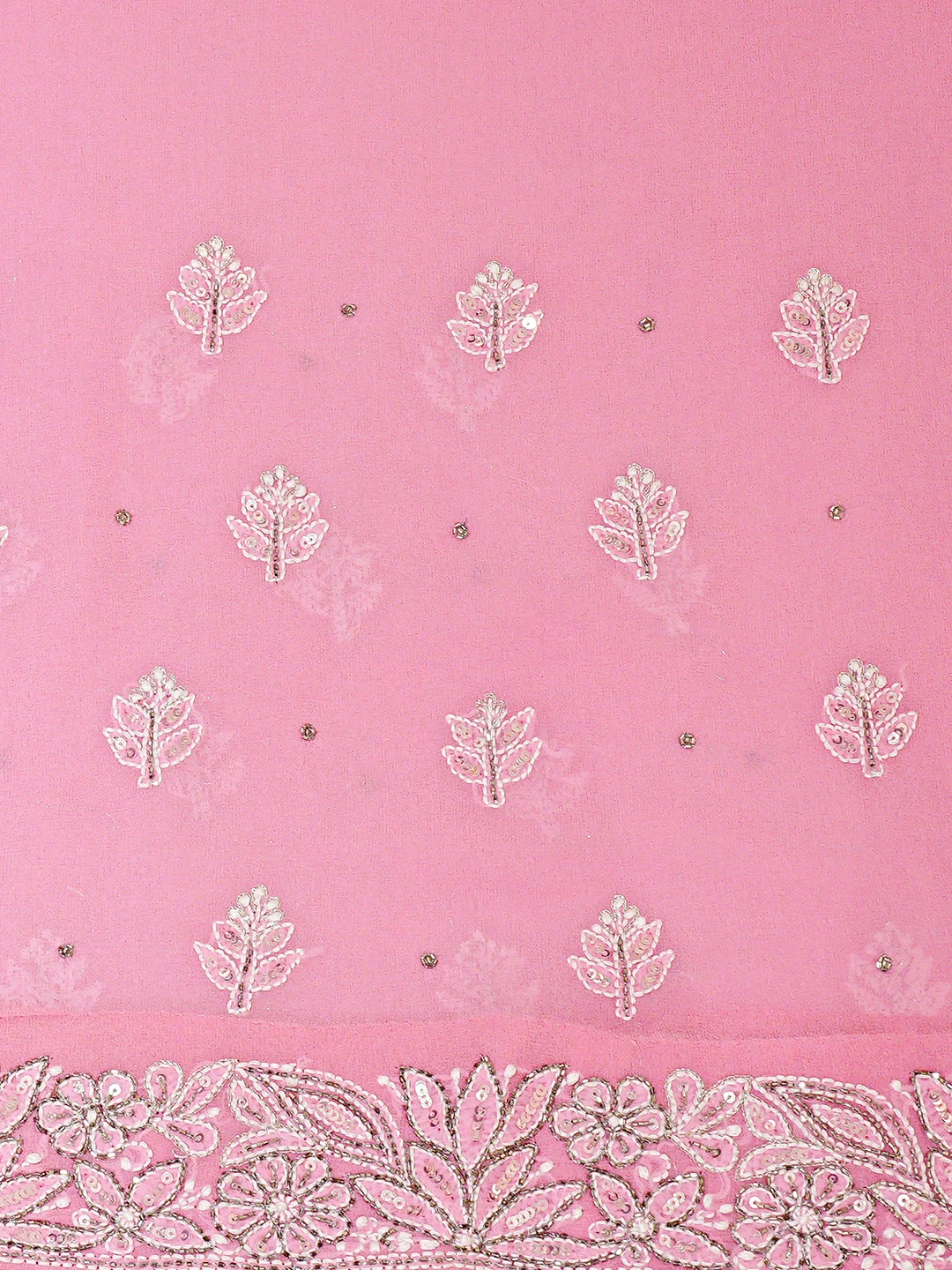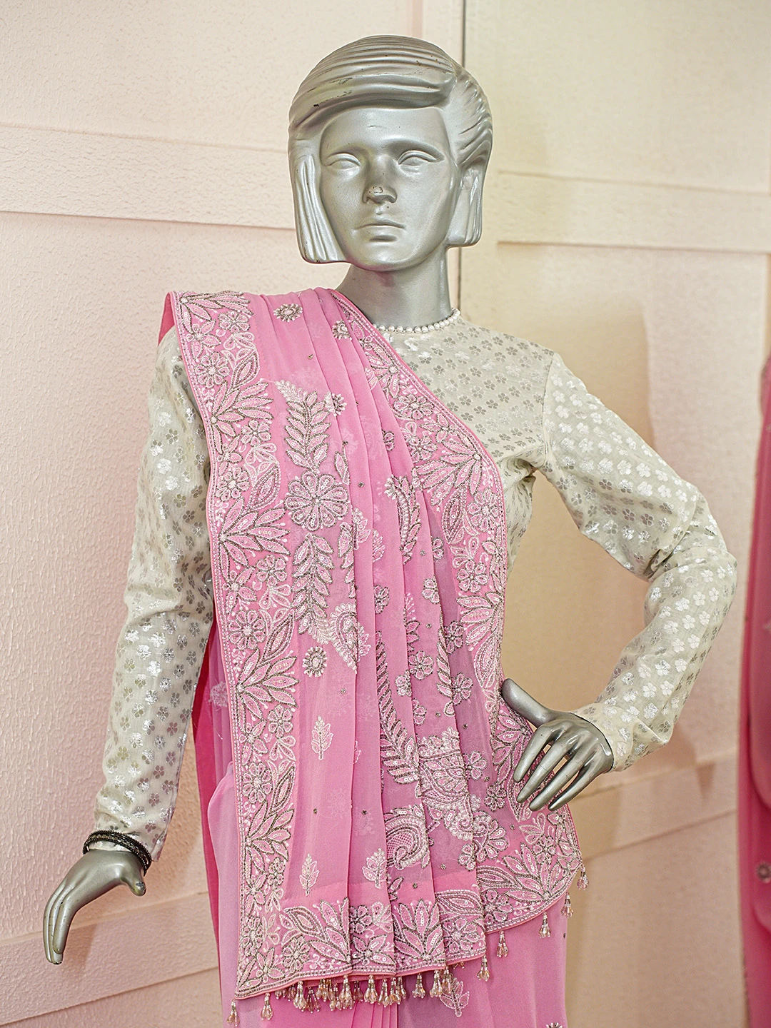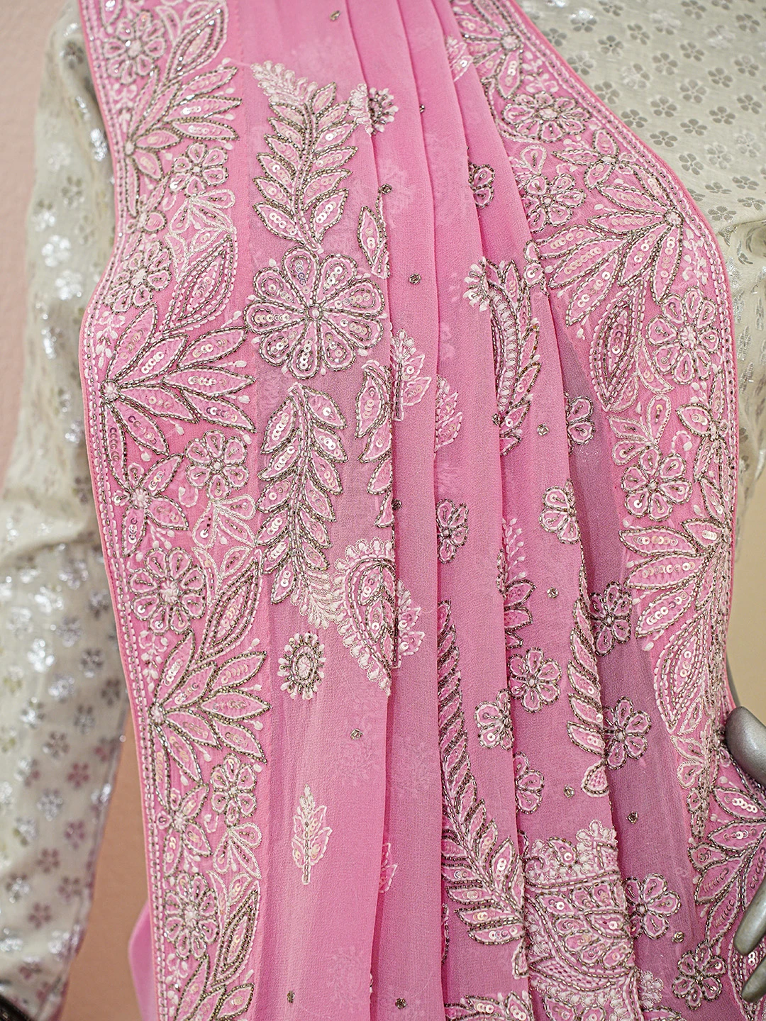 Ada Hand Embroidered Pink Pure Georgette Lucknowi Chikankari Saree With Blouse With Cutdana Work 01A689882