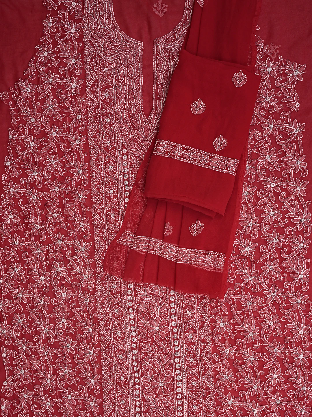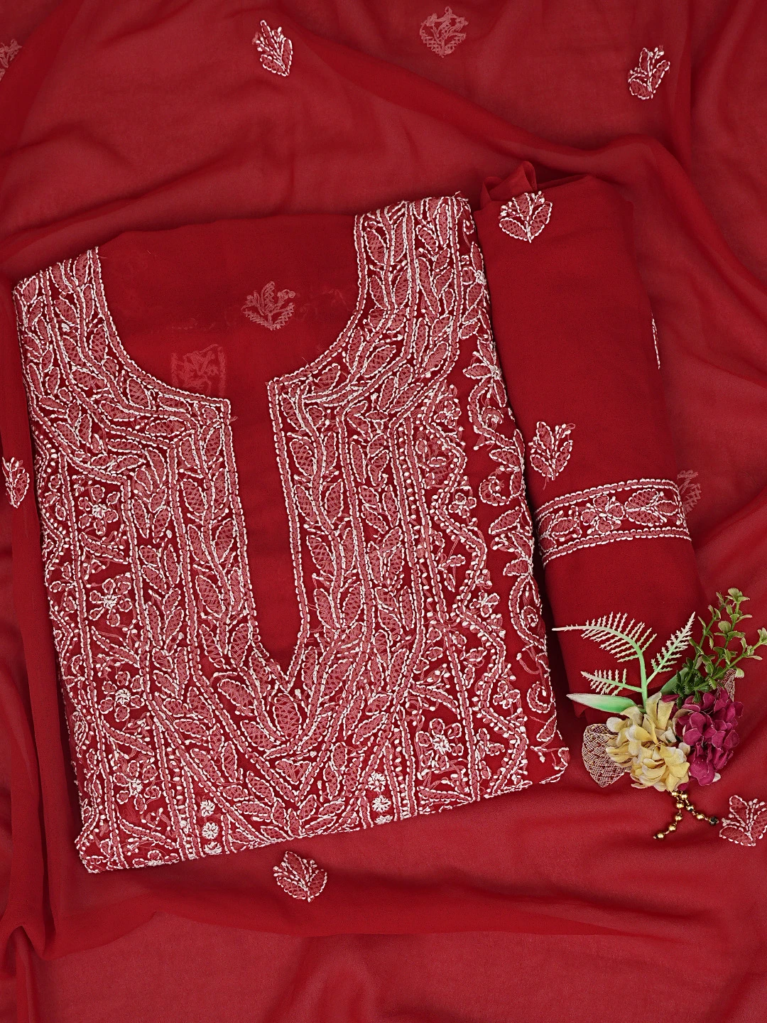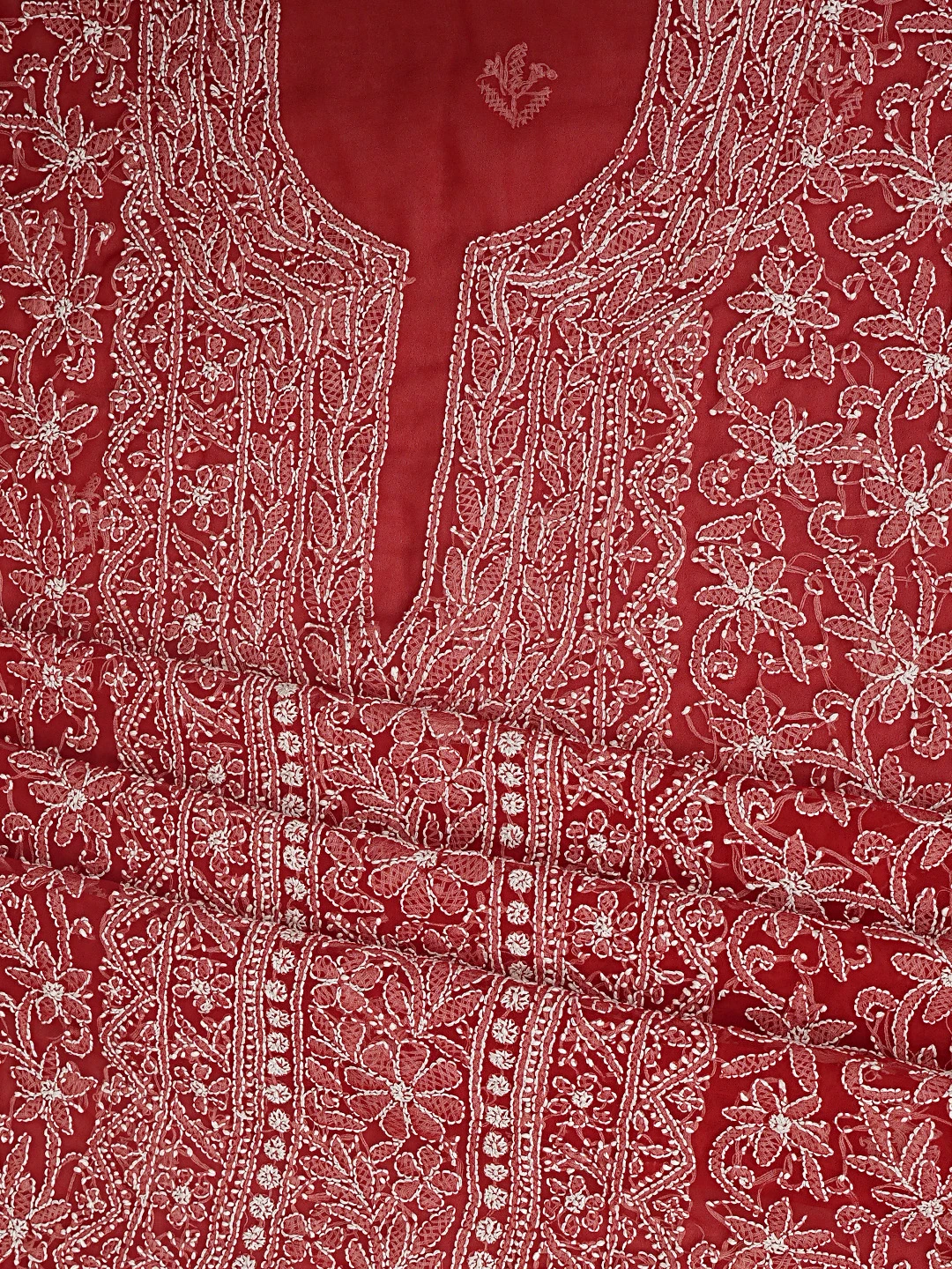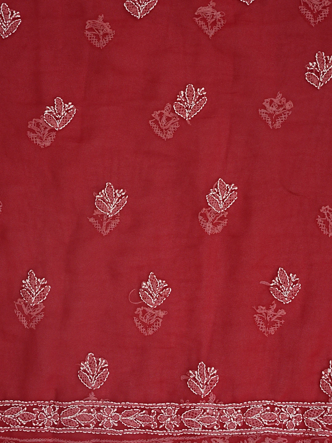 Ada Hand Embroidered Red Georgette Lucknowi Chikankari Unstitched Suit Piece 01A873546