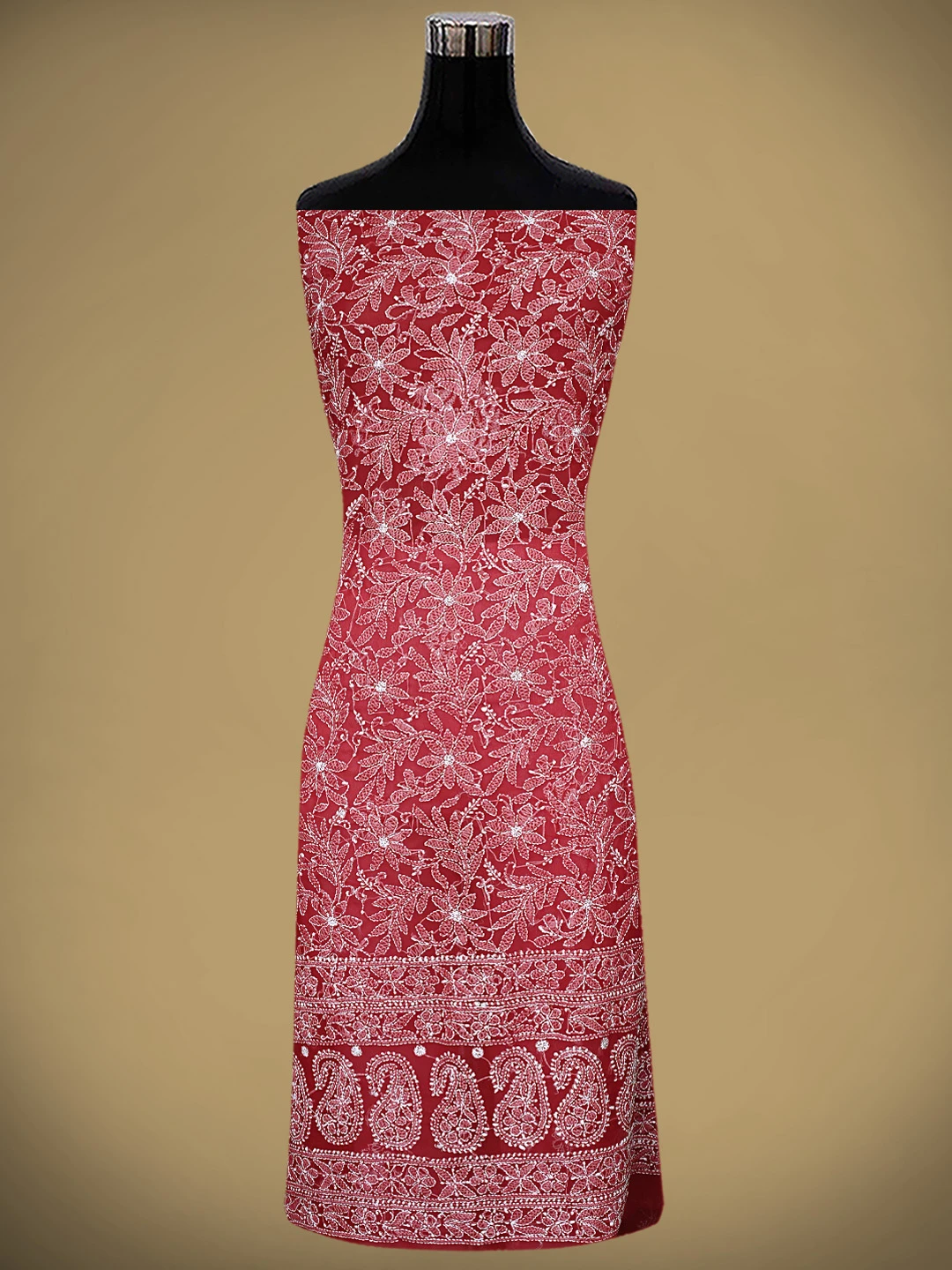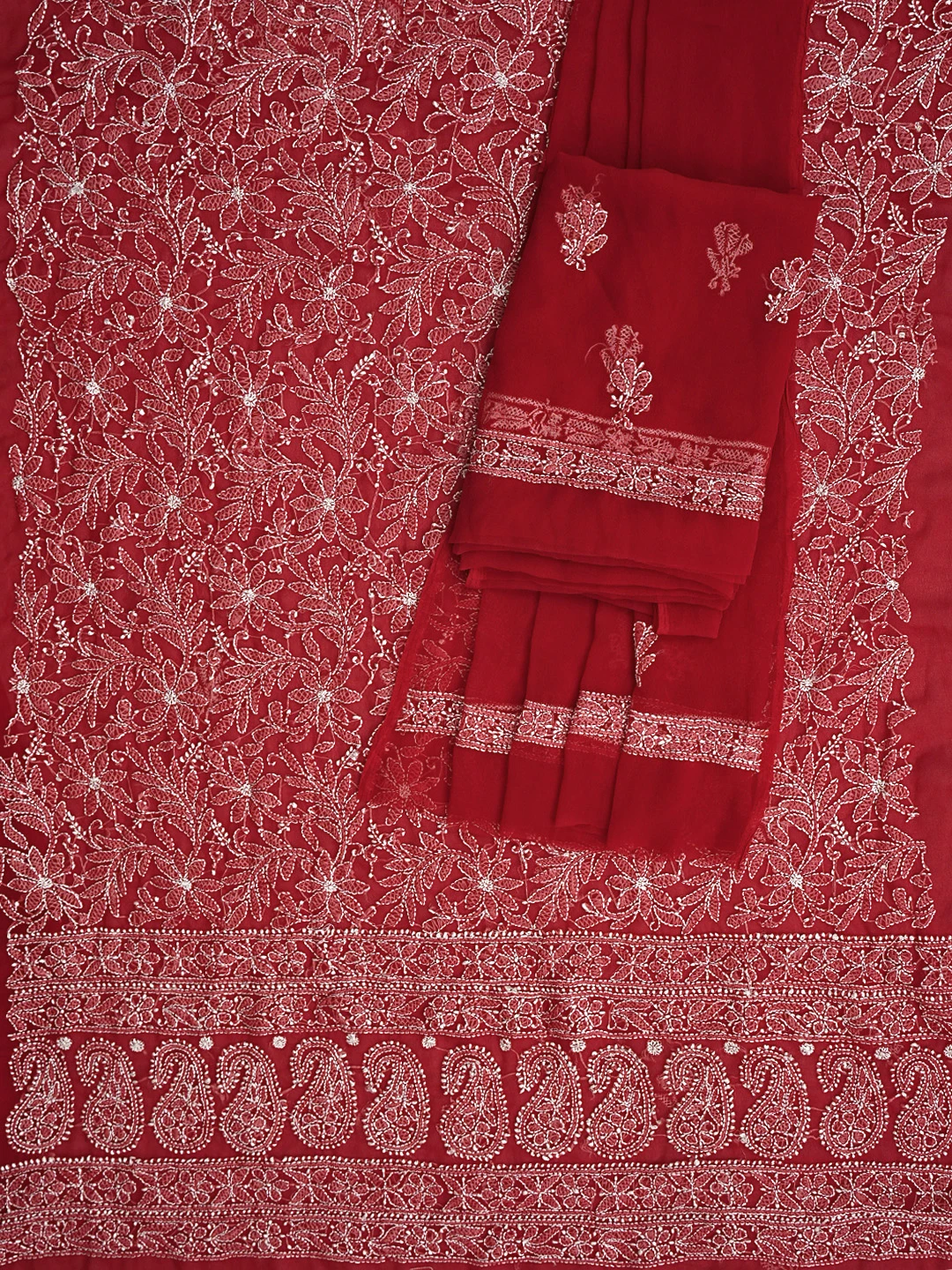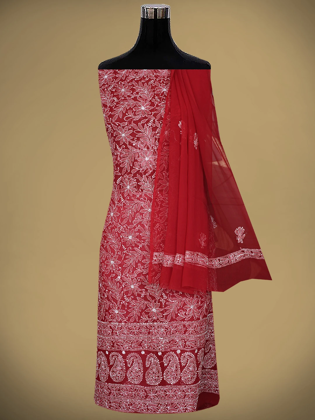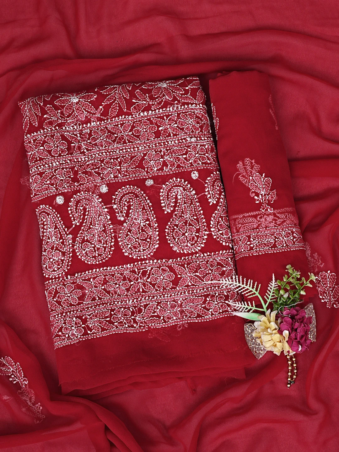 Ada Hand Embroidered Red Georgette Lucknowi Chikankari Unstitched Suit Piece 01A878888