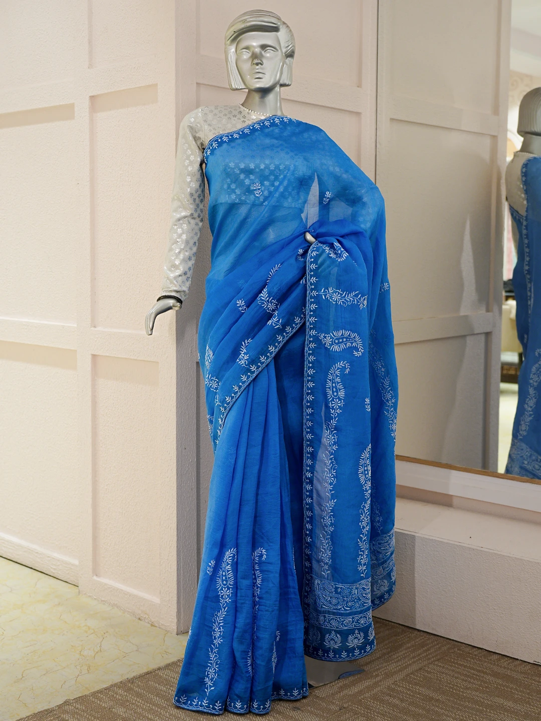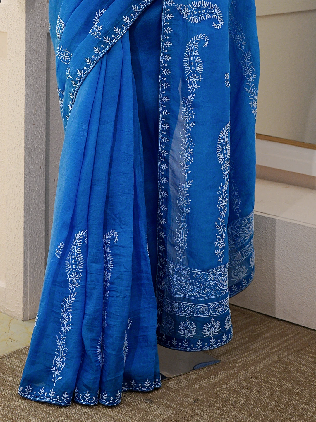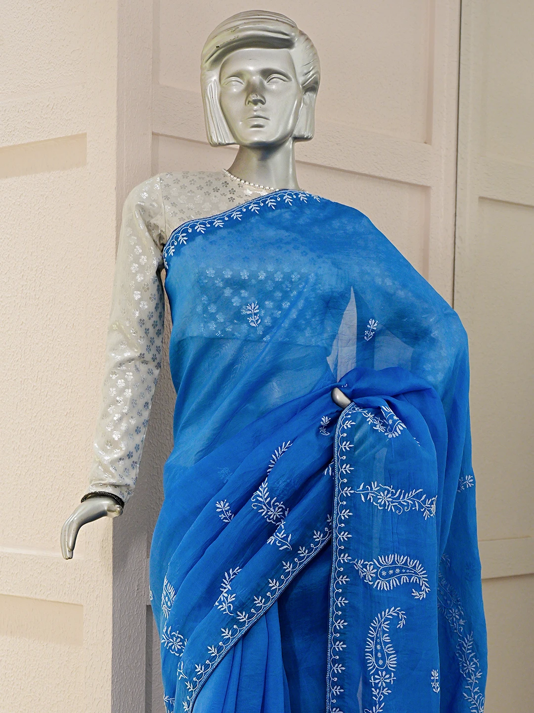 Ada Hand Embroidered Royal Blue Organza Lucknowi Chikankari Saree With Blouse 01A808023