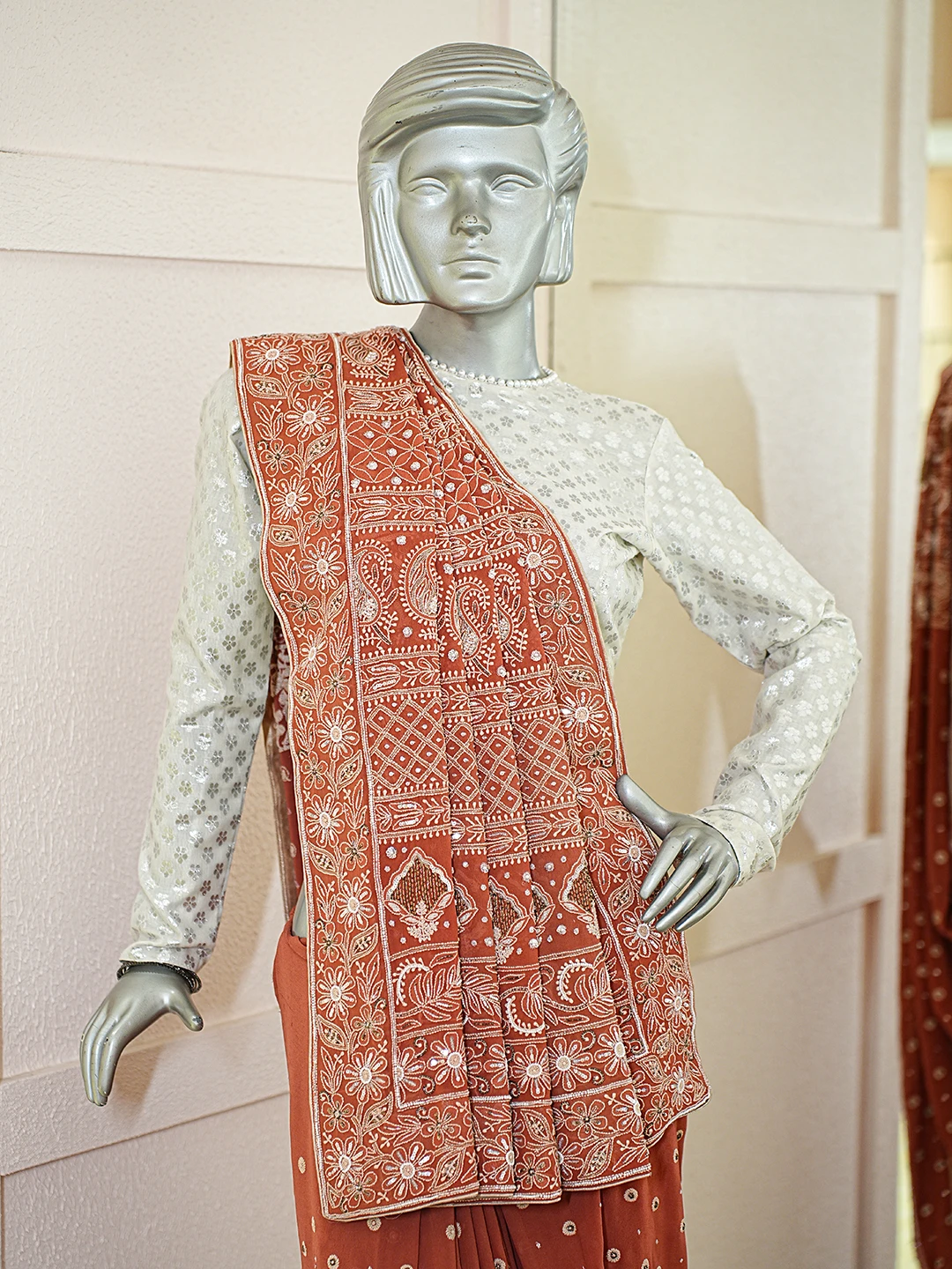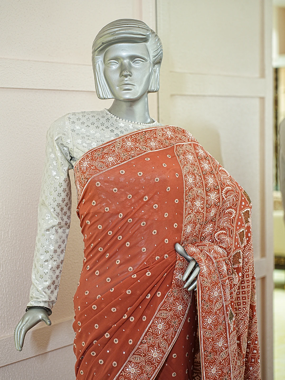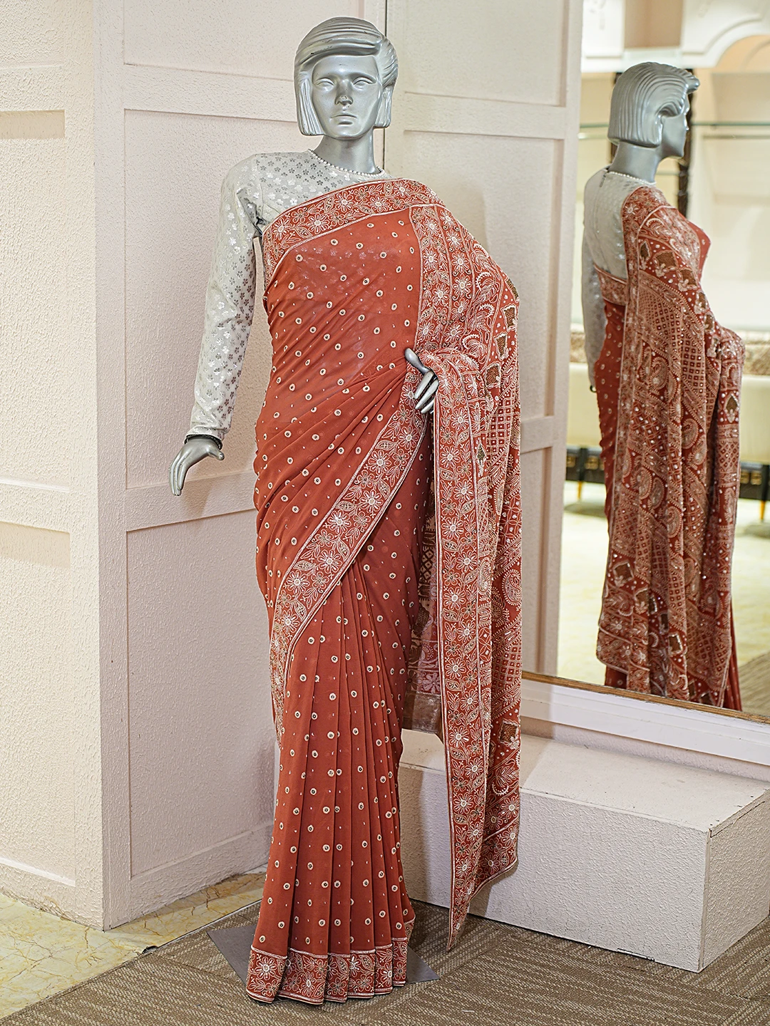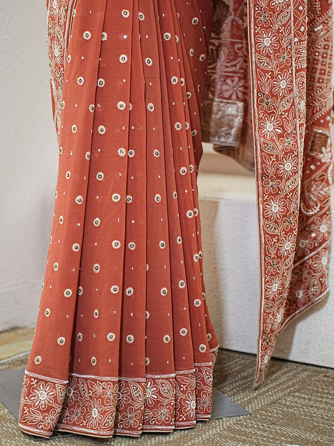 Ada Hand Embroidered Rust Pure Georgette Lucknowi Chikankari Saree With Blouse With Pearl Work 01A169407